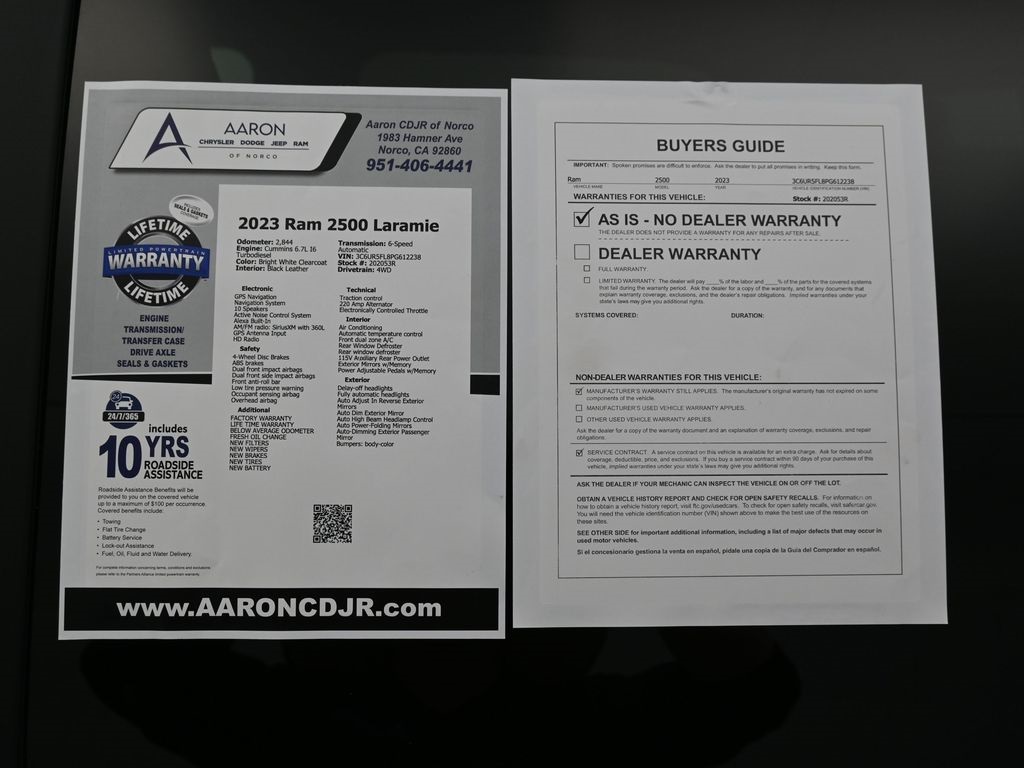 Priced below KBB Fair Purchase Price!FACTORY WARRANTY, LIFE TIME WARRANTY, BELOW AVERAGE ODOMETER, FRESH OIL CHANGE, NEW FILTERS, NEW WIPERS, 2500 Laramie, 4D Crew Cab, Cummins 6.7L I6 Turbodiesel, 6-Speed Automatic, 4WD, 12" Touchscreen Display, 2nd Row In Floor Storage Bins, 4G LTE Wi-Fi Hot Spot, Alexa Built-In, Alloy wheels, Apple CarPlay, Auto Adjust In Reverse Exterior Mirrors, Auto Dim Exterior Mirror, Auto High Beam Headlamp Control, Auto Power-Folding Mirrors, Auto-Dimming Exterior Passenger Mirror, Blind Spot & Cross Path Detection, Chrome Exterior Mirrors, Connected Travel & Traffic Services, Connectivity - US/Canada, Disassociated Touchscreen Display, Exterior Mirrors Courtesy Lamps, Exterior Mirrors w/Heating Element, Exterior Mirrors w/Memory, Exterior Mirrors w/Supplemental Signals, Foam Bottle Insert (Door Trim Panel), For Details, Visit DriveUconnect.com, For More Info, Call 800-643-2112, Forward & Reverse Utility Lights, Front LED Fog Lamps, Global Telematics Box Module (TBM), Google Android Auto, GPS Antenna Input, GPS Navigation, HD Radio, Heated Front Seats, Integrated Voice Command w/Bluetooth, Laramie Level 1 Equipment Group, LED Reflector Headlamps, Low tire pressure warning, Mirror Running Lights, Navigation System, Off-Road Information Pages, Overhead airbag, ParkSense Front/Rear Park Assist System, ParkView Rear Back-Up Camera, Power Adjust Mirrors, Power Adjustable Convex Aux Mirrors, Power Adjustable Pedals w/Memory, Power Heated Fold Telescopic Mirrors w/Memory, Power Telescoping Mirrors, Quick Order Package 2HH Laramie, Radio: Uconnect 5 Nav w/12.0" Display, Radio/Driver Seat/Mirrors/Pedals Memory, Rain Sensitive Windshield Wipers, Rear Power Sliding Window, Rear Window Defroster, Remote Tailgate Release, Selectable Tire Fill Alert, SiriusXM Radio Service, SiriusXM w/360L, Tow Hooks, Trailer Tow Pages.For help with any Vehicle needs please call us directly at 951-621-1288.Clean CARFAX.CARFAX One-Owner.