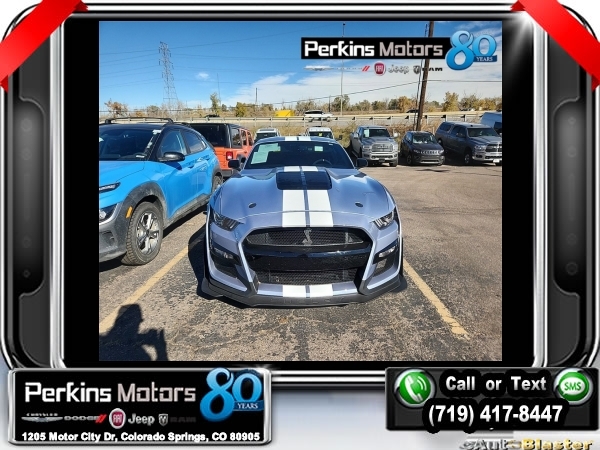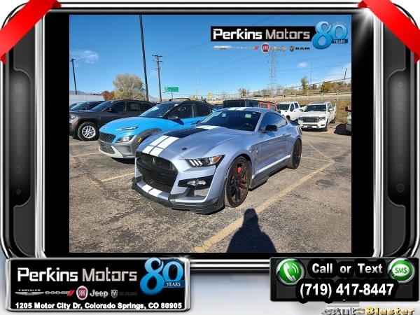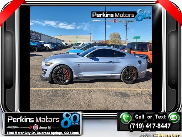 Blue Metallic RWD 5.2L V8 7-Speed Automatic<br><br><br>Clean CARFAX.<br><br>Check us out at www.perkinsmotors.com to see our specials! Since opening our doors in 1944, we’ve been proud to serve Colorado Springs, CO, and the surrounding areas of Pueblo, Castle Rock and Denver, CO. Throughout this time of being family owned for 80 years, we’ve maintained a firm commitment to our customers: to offer a wide selection of New Chrysler, Dodge, Fiat, Jeep, and Ram vehicles and quality pre-owned vehicles, and provide a quick, no-hassle car-buying process that ensures everyone drives off the lot satisfied with their purchase.<br><br><br>Equipment Group 950A, GT500 Heritage Edition Package (Vinyl Over-the-Top Racing Stripe), Technology Package (BLIS Blind Spot Information System, Heated Mirrors, Radio: B&O Sound System by Bang & Olufsen, and Voice-Activated Touch-Screen Navigation System), 20 Wheels, 4-Wheel Disc Brakes, 9 Speakers, ABS brakes, Adaptive suspension, Air Conditioning, Alloy wheels, AM/FM radio: SiriusXM, AM/FM Stereo, Auto-dimming Rear-View mirror, Automatic temperature control, Brake assist, Bumpers: body-color, CD player, Climate Controlled Front Seats, Compass, Cruise Control, Delay-off headlights, Driver door bin, Driver vanity mirror, Dual front impact airbags, Dual front side impact airbags, Electronic Stability Control, Emergency communication system: 911 Assist, Exterior Parking Camera Rear, Four wheel independent suspension, Front anti-roll bar, Front Bucket Seats, Front Center Armrest, Front dual zone A/C, Front reading lights, Fully automatic headlights, Garage door transmitter, Heated front seats, High-Intensity Discharge Headlights, Illuminated entry, Knee airbag, Leather-Trimmed Sport Seats, Low tire pressure warning, Occupant sensing airbag, Outside temperature display, Overhead airbag, Panic alarm, Passenger door bin, Passenger vanity mirror, Power door mirrors, Power driver seat, Power passenger seat, Power steering, Power windows, Radio data system, Rear anti-roll bar, Rear window defroster, Remote keyless entry, Security system, SiriusXM Radio, Speed-sensing steering, Speed-Sensitive Wipers, Split folding rear seat, Spoiler, Sport steering wheel, Steering wheel mounted audio controls, SYNC 3 Communications & Entertainment System, Tachometer, Telescoping steering wheel, Tilt steering wheel, Traction control, Trip computer, Variably intermittent wipers, Ventilated front seats, Voltmeter, Wheels: 20 Flow Formed High Gloss Black Aluminum, Wimbledon White Over-the-Top Stripe, and Wimbledon White Side Stripes.