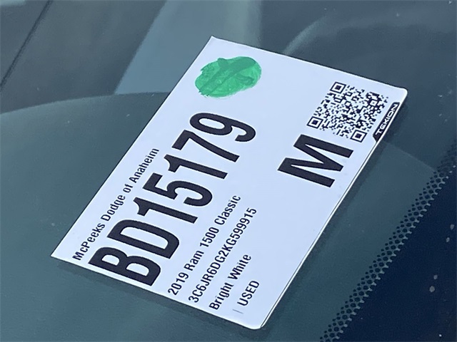 CARFAX One-Owner. INTERIOR & EXTERIOR PROFESSIONALLY DETAILED FOR DELIVERY, MCPEEK CHRYSLER DODGE JEEP RAM FAMILY OWNED AND OPERATED SINCE 1961 !!!!!, 1-Year SiriusXM Radio Service, 17" x 7" Steel Wheels, 3.21 Rear Axle Ratio, 4-Wheel Disc Brakes, 40/20/40 Split Bench Seat, 6 Speakers, ABS brakes, Active Grille Shutters, Air Conditioning, AM/FM radio, Auto-dimming Rear-View mirror, Black Exterior Mirrors, Brake assist, Carpet Floor Covering, Center Hub, Cloth 40/20/40 Bench Seat, Delay-off headlights, Driver door bin, Dual front impact airbags, Dual front side impact airbags, Electronic Shift, Electronic Stability Control, Exterior Mirrors w/Heating Element, For More Info, Call 800-643-2112, Front anti-roll bar, Front Armrest w/3 Cupholders, Front Center Armrest, Front Floor Mats, Front wheel independent suspension, Fully automatic headlights, Heavy Duty Vinyl 40/20/40 Split Bench Seat, Integrated Voice Command w/Bluetooth, Low tire pressure warning, Manual Adjust Seats, Manufacturer's Statement of Origin, Media Hub (USB, AUX), No Satellite Coverage HI/AK/PR/VI, Occupant sensing airbag, Overhead airbag, ParkView Rear Back-Up Camera, Passenger door bin, Popular Equipment Group, Power & Remote Entry Group, Power Heated Fold-Away Mirrors, Power Locks, Power steering, Power Windows w/Front 1-Touch Down, Premium Vinyl Door Trim w/Map Pocket, Quick Order Package 22B Tradesman, Radio data system, Radio: 3.0, Radio: Uconnect 3.0, Rear step bumper, Remote Keyless Entry w/All-Secure, SiriusXM Satellite Radio, Speed control, Tachometer, Tilt steering wheel, Tip Start, Traction control, Tradesman Package, Variably intermittent wipers, Voltmeter.Bright White Clearcoat 2019 Ram 1500 Classic Tradesman Ready to Work RWD 8-Speed AutomaticAwards: * Motor Trend Automobiles of the yearReceive Free lube and oil filter changes for up to 45,000 miles for 3 years!!! McPeek's Dodge of Anahiem 1221 S. Auto Center Drive Anahiem, CA 92806 714-262-4902.