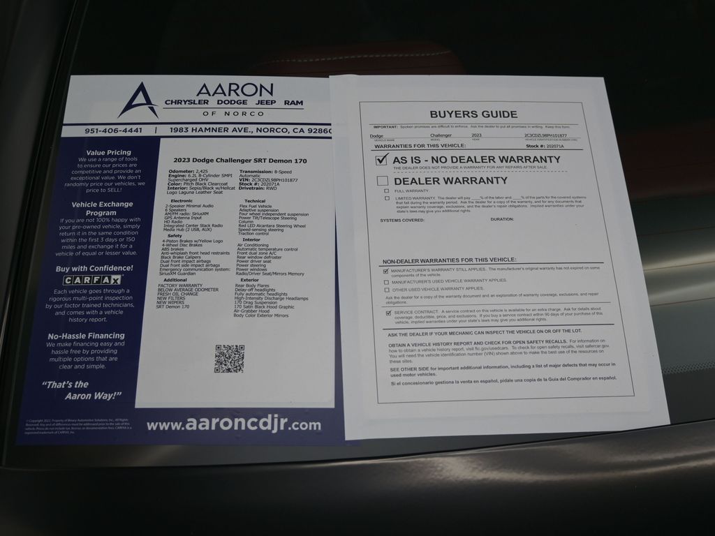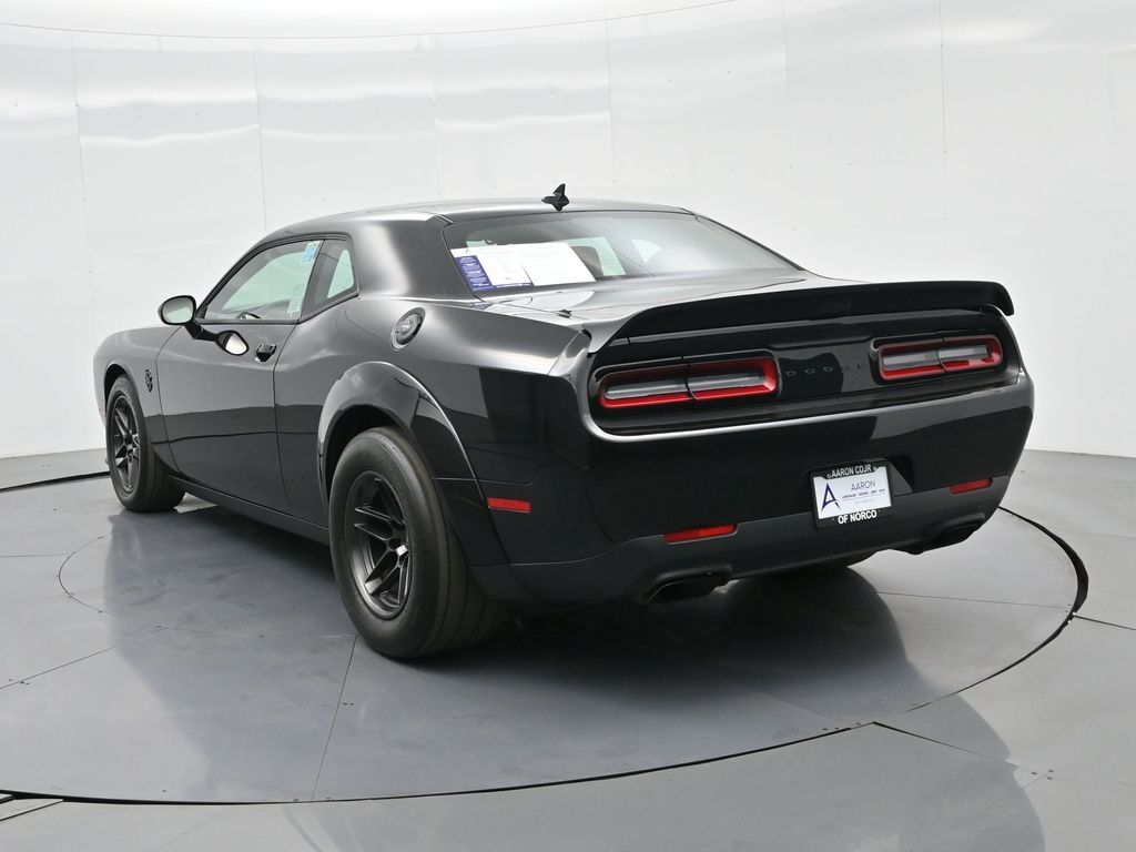 SRT Demon 170, 2D Coupe, 6.2L 8-Cylinder SMPI Supercharged OHV, 8-Speed Automatic, RWD, 1 Year NMCA/NHRA Membership, 170 Drag Suspension, 170 Satin Black Hood Graphic, 2-Speaker Minimal Audio, 3.09 Rear Axle Ratio, 4-Piston Brakes w/Yellow Logo, ABS brakes, Air-Grabber Hood, Alloy wheels, Black Brake Calipers, Compass, DC Illuminated Air Catcher Headlamps, Delete Sound Insulation, Delete Trunk Carpet, Delete Trunk Lamp & Bright Pedals, Electronic Stability Control, Exterior Plastics Module, Flex Fuel Vehicle, For More Info, Call 800-643-2112, Front dual zone A/C, Heated door mirrors, Heated Front Seats, Heated front seats, Heated Steering Wheel, Hellcat Logo Laguna Leather Seat, High-Intensity Discharge Headlamps, Illuminated entry, Laguna Leather Package (DISC), Low tire pressure warning, ParkView Rear Back-Up Camera, Power Tilt/Telescope Steering Column, Premium Laguna Door Trim Panel, Premium-Stitched Dash Panel, Radio/Driver Seat/Mirrors Memory, Real Carbon Fiber Interior Accents, Rear Body Flares, Red LED Alcantara Steering Wheel, Remote keyless entry, Satin Black Dodge Tail Lamp Badge, SiriusXM Radio Service, SiriusXM Satellite Radio, SRT Demon 170, SRT Demon 170 Exterior Badging, SRT Demon 170 IP Badge, SRT Performance Spoiler, Traction control, Transbrake, Ventilated Front Seats, Wheels: 18" x 8" Fr & 17" x 11" Rr Forged Aluminum.For help with any Vehicle needs please call us directly at 951-621-1288.Clean CARFAX.CARFAX One-Owner.