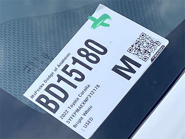 30/38 City/Highway MPG Odometer is 21624 miles below market average! CARFAX One-Owner. INTERIOR & EXTERIOR PROFESSIONALLY DETAILED FOR DELIVERY, MCPEEK CHRYSLER DODGE JEEP RAM FAMILY OWNED AND OPERATED SINCE 1961 !!!!!, 4-Wheel Disc Brakes, 6 Speakers, ABS brakes, Air Conditioning, AM/FM radio: SiriusXM, Apple CarPlay/Android Auto, Auto High-beam Headlights, Automatic temperature control, Brake assist, Bumpers: body-color, Delay-off headlights, Driver door bin, Driver vanity mirror, Dual front impact airbags, Dual front side impact airbags, Electronic Stability Control, Emergency communication system: Safety Connect with 1-year trial, Exterior Parking Camera Rear, Four wheel independent suspension, Front anti-roll bar, Front Bucket Seats, Front Center Armrest, Front reading lights, Fully automatic headlights, Illuminated entry, Knee airbag, Low tire pressure warning, Occupant sensing airbag, Outside temperature display, Overhead airbag, Panic alarm, Passenger door bin, Passenger vanity mirror, Power door mirrors, Power steering, Power windows, Premium Fabric Seat Trim, Radio data system, Radio: Audio, Rear anti-roll bar, Rear seat center armrest, Rear side impact airbag, Rear window defroster, Remote keyless entry, Security system, Speed control, Split folding rear seat, Steering wheel mounted audio controls, Tachometer, Telescoping steering wheel, Tilt steering wheel, Traction control, Trip computer, Variably intermittent wipers, Wheels: 16" Wide Vent Steel.Bright White 2022 Toyota Corolla LE FWD CVTReceive Free lube and oil filter changes for up to 45,000 miles for 3 years!!! McPeek's Dodge of Anahiem 1221 S. Auto Center Drive Anahiem, CA 92806 714-262-4902.