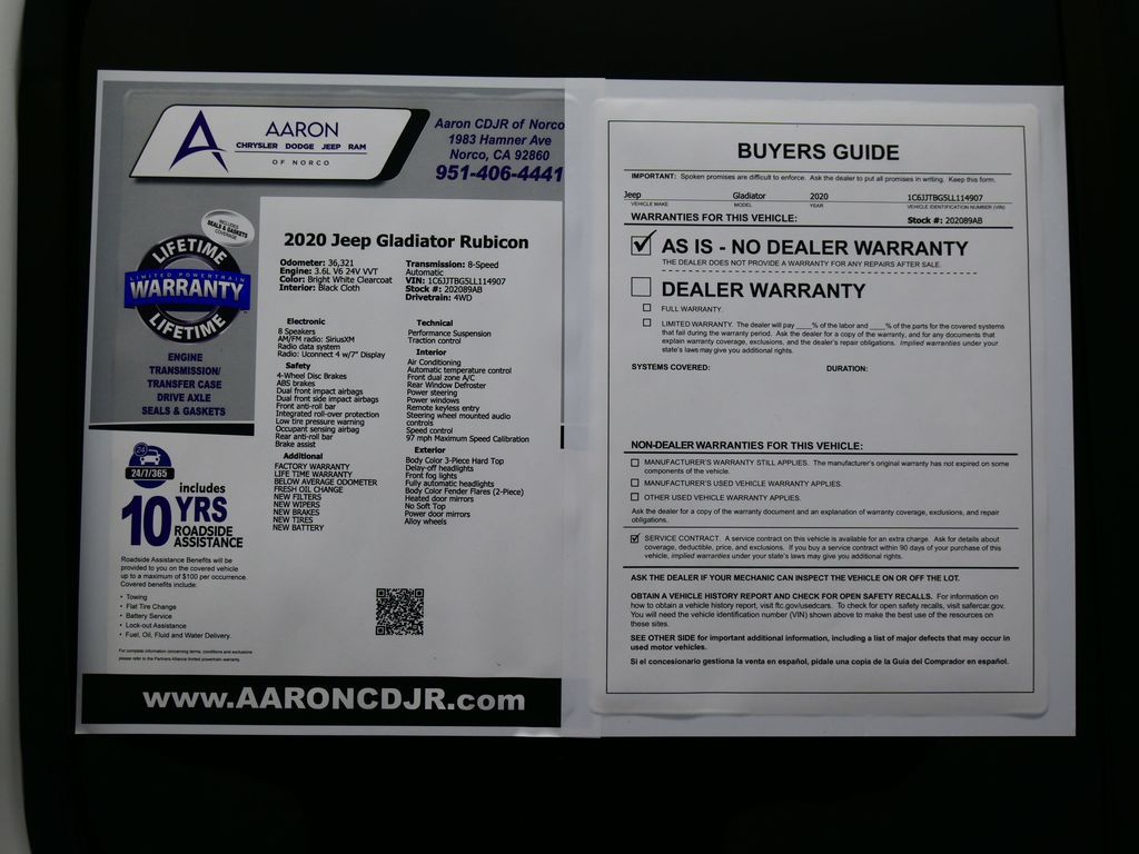 Priced below KBB Fair Purchase Price!LIFE TIME WARRANTY, BELOW AVERAGE ODOMETER, FRESH OIL CHANGE, NEW FILTERS, NEW WIPERS, Gladiator Rubicon, 4D Crew Cab, 3.6L V6 24V VVT, 8-Speed Automatic, 4WD, Alloy wheels, Body Color 3-Piece Hard Top, Body Color Fender Flares (2-Piece), Compass, Freedom Panel Storage Bag, Front dual zone A/C, Front fog lights, Low tire pressure warning, No Soft Top, ParkView Rear Back-Up Camera, Quick Order Package 24R, Radio: Uconnect 4 w/7" Display, Rear Sliding Window, Rear Window Defroster, Wheels: 17" x 7.5" Granite Crystal Aluminum.Awards: * NACTOY 2020 North American Truck of the Year * 2020 KBB.com 10 Favorite New-for-2020 Cars
