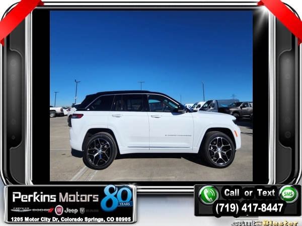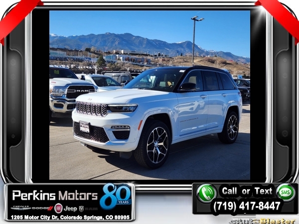 Factory MSRP: $71,600 $6,000 off MSRP! Bright White Clearcoat 2025 Jeep Grand Cherokee Summit 4WD 8-Speed Automatic 3.6L V6 24V VVT<br>4WD.<br>Check us out at www.perkinsmotors.com to see our specials! Since opening our doors in 1944, we’ve been proud to serve Colorado Springs, CO, and the surrounding areas of Pueblo, Castle Rock and Denver, CO. Throughout this time of being family owned for 80 years, we’ve maintained a firm commitment to our customers: to offer a wide selection of New Chrysler, Dodge, Fiat, Jeep, and Ram vehicles and quality pre-owned vehicles, and provide a quick, no-hassle car-buying process that ensures everyone drives off the lot satisfied with their purchase.<br><br>ADV Protech Group IV (Heads-Up Display, Night Vision w/Pedestrian-Animal Detection, Rearview Autodim Digital Display Mirror, and Windshield Wiper De-Icer), Hands-Free Active Driving Assist System (Auxiliary Battery), Luxury Tech Group V (2nd-Row Manual Window Shades and Wireless Charging Pad), Quick Order Package 23U Summit Reserve (19 Speakers High Performance Audio, 950 Watt Amplifier, Active Noise Control System, Deluxe Headliner, Front Passenger Interactive Display, Palermo Leather Door Trim, Palermo Leather Seats, Summit Reserve, Summit Reserve Badge, Ventilated Rear Seats, and Wheels: 21 x 9 Machined Face/Painted Aluminum), 4WD, 10 Speakers, 4-Wheel Disc Brakes, ABS brakes, Adaptive suspension, Air Conditioning, Alloy wheels, AM/FM radio: SiriusXM with 360L, Anti-whiplash front head restraints, Audio memory, Auto High-beam Headlights, Auto-dimming door mirrors, Auto-dimming Rear-View mirror, Auto-leveling suspension, Automatic temperature control, Brake assist, Bumpers: body-color, Compass, Cruise Control, Delay-off headlights, Driver door bin, Driver vanity mirror, Dual front impact airbags, Dual front side impact airbags, Electronic Stability Control, Emergency communication system, Four wheel independent suspension, Front anti-roll bar, Front Bucket Seats, Front Center Armrest w/Storage, Front dual zone A/C, Front fog lights, Front License Plate Bracket, Front reading lights, Fully automatic headlights, Garage door transmitter, Genuine wood dashboard insert, Genuine wood door panel insert, Heated door mirrors, Heated front seats, Heated rear seats, Heated steering wheel, Illuminated entry, Knee airbag, Leather steering wheel, Low tire pressure warning, Memory seat, Model Year Tracking, Nappa Leather Seats, Navigation System, Normal Duty Suspension, Occupant sensing airbag, Outside temperature display, Overhead airbag, Overhead console, Panic alarm, Passenger door bin, Passenger vanity mirror, Power door mirrors, Power driver seat, Power Liftgate, Power moonroof, Power passenger seat, Power steering, Power windows, Radio data system, Radio: Uconnect 5 Nav w/10.1 Display, Rain sensing wipers, Rear air conditioning, Rear anti-roll bar, Rear dual zone A/C, Rear reading lights, Rear seat center armrest, Rear window defroster, Rear window wiper, Remote keyless entry, Security system, Speed-Sensitive Wipers, Split folding rear seat, Spoiler, Steering wheel memory, Steering wheel mounted audio controls, Tachometer, Telescoping steering wheel, Tilt steering wheel, Traction control, Trip computer, Turn signal indicator mirrors, Variably intermittent wipers, Ventilated front seats, Voltmeter, and Wheels: 20 x 8.5 Fully Painted Aluminum Silver.<br><br>19/26 City/Highway MPG Sale price includes all manufacture's incentives and dealer discounts. Sale price not available on lease or compatible with special APR. $1000 - 2025 National Retail Consumer Cash. Exp. 01/02/2025 $1500 - 2025 National Holiday Bonus Cash. Exp. 01/02/2025