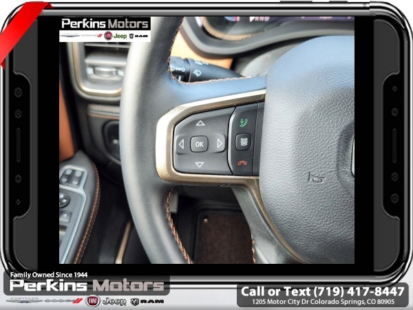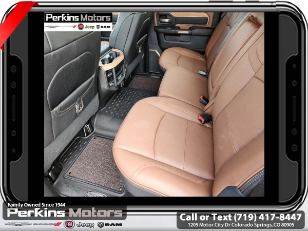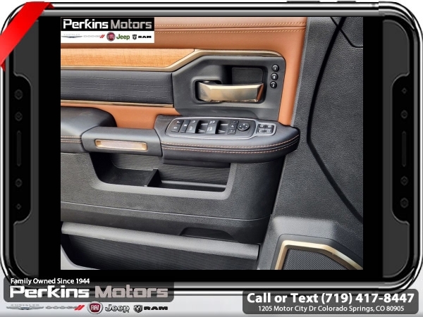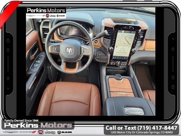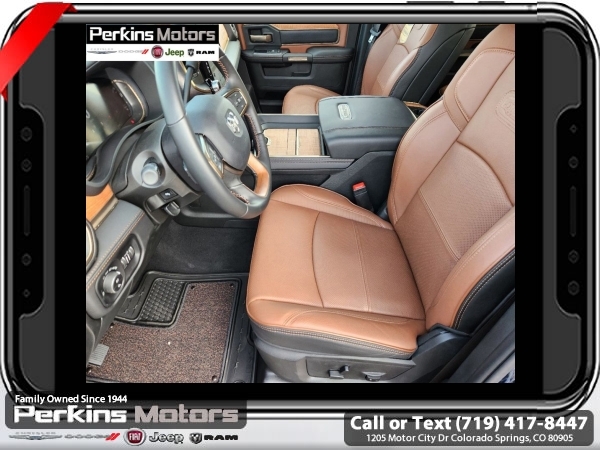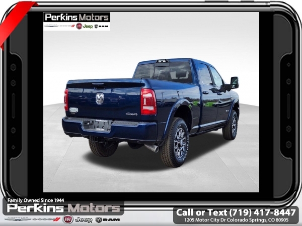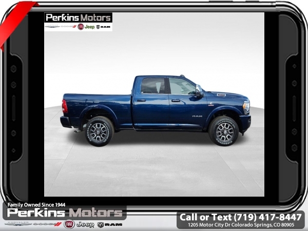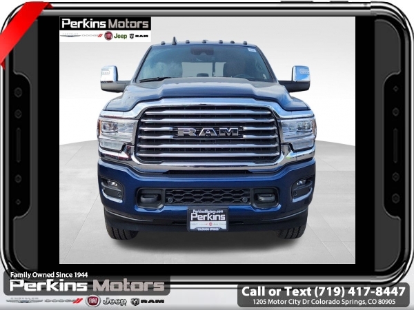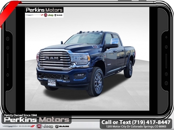 Factory MSRP: $99,470 $11,000 off MSRP! Patriot Blue Pearlcoat 2024 Ram 3500 Laramie Longhorn 4WD Aisin 6-Speed Automatic 6.7L I6<br><br>Check us out at www.perkinsmotors.com to see our specials! Since opening our doors in 1944, we’ve been proud to serve Colorado Springs, CO, and the surrounding areas of Pueblo, Castle Rock and Denver, CO. Throughout this time of being family owned for 80 years, we’ve maintained a firm commitment to our customers: to offer a wide selection of New Chrysler, Dodge, Fiat, Jeep, and Ram vehicles and quality pre-owned vehicles, and provide a quick, no-hassle car-buying process that ensures everyone drives off the lot satisfied with their purchase.<br><br>Longhorn Level 1 Equipment Group (4G LTE Wi-Fi Hot Spot, Alexa Built-In, Apple CarPlay, Blind Spot & Cross Path Detection, Connected Travel & Traffic Services, Connectivity - US/Canada, Disassociated Touchscreen Display, For Details Visit DriveUconnect.com, For More Info, Call 800-643-2112, Global Telematics Box Module (TBM), Google Android Auto, GPS Antenna Input, GPS Navigation, HD Radio, Integrated Voice Command w/Bluetooth, MOPAR Spray In Bedliner, Off-Road Information Pages, Power Deployable Running Boards, Ramcharger Wireless Charging Pad, Selectable Tire Fill Alert, SiriusXM Radio Service, SiriusXM w/360L, and Trailer Tow Pages), Quick Order Package 21K Longhorn, Safety Group (Adaptive Steering System and Full Speed Forward Collision Warning Plus), Snow Chief Group (Auxiliary Switches Prep and Clearance Lamps), Tow Technology Plus Group (Trailer Reverse Steering Control), Towing Technology Group (CTR Stop Lamp w/Cargo View Camera), 10 Speakers, 115V Auxiliary Rear Power Outlet, 2 Way Rear Headrest Seat, 220 Amp Alternator, 3.73 Axle Ratio, 4 Way Front Headrests, 4-Wheel Disc Brakes, 5th Wheel/Gooseneck Towing Prep Group, ABS brakes, Active Noise Control System, Adjustable pedals, Air Conditioning, Alloy wheels, AM/FM radio: SiriusXM with 360L, Apple CarPlay/Android Auto, Audio memory, Auto High-beam Headlights, Auto Level Rear Air Suspension, Auto-dimming door mirrors, Auto-dimming Rear-View mirror, Automatic temperature control, Brake assist, Bucket Seats, Bumpers: body-color, Center Hub, Compass, Cruise Control, Delay-off headlights, Driver door bin, Driver vanity mirror, Dual Alternators Rated At 440 Amps, Dual front impact airbags, Dual front side impact airbags, Electronic Stability Control, Electronically Controlled Throttle, Folding Flat Load Floor Storage, Front anti-roll bar, Front Bucket Seats, Front Center Armrest w/Storage, Front dual zone A/C, Front fog lights, Front License Plate Bracket, Front reading lights, Front Seat Back Map Pockets, Full Length Premium Upgraded Floor Console, Fully automatic headlights, Garage door transmitter, Genuine wood console insert, Genuine wood dashboard insert, Genuine wood door panel insert, Heated door mirrors, Heated Front Seats, Heated front seats, Heated rear seats, Heated Second Row Seats, Heated Steering Wheel, Heated steering wheel, High Back Seats, Illuminated entry, Leather steering wheel, Low tire pressure warning, Manufacturer's Statement of Origin, Memory seat, MOPAR Deployable Bed Step, Navigation System, Occupant sensing airbag, Outside temperature display, Overhead airbag, Overhead console, Panic alarm, ParkView Rear Back-Up Camera, Passenger door bin, Passenger vanity mirror, Pedal memory, Power 8-Way Adjustable Passenger Seat, Power Adjust 8-Way Driver Seat, Power door mirrors, Power driver seat, Power passenger seat, Power steering, Power Sunroof, Power windows, Premium Filigree Leather Seats, Radio data system, Rain sensing wipers, Rear 60/40 Folding Seat, Rear reading lights, Rear seat center armrest, Rear step bumper, Rear window defroster, Remote keyless entry, Security system, S Sale price includes all manufacture's incentives and dealer discounts. Sale price not available on lease or compatible with special APR. $2500 - 2024 National Truck Month Bonus Cash. Exp. 0