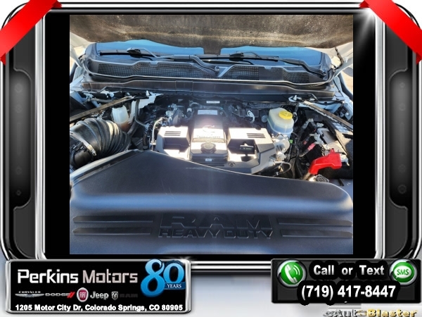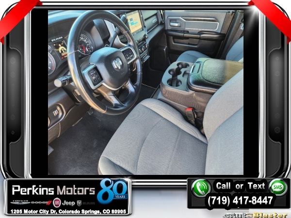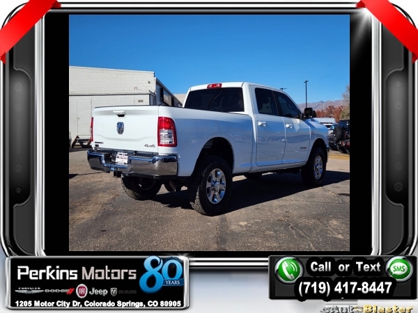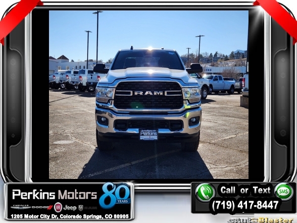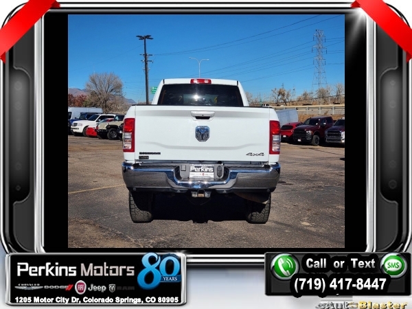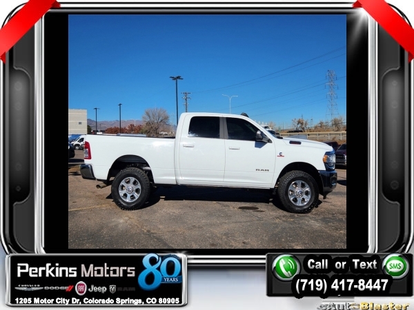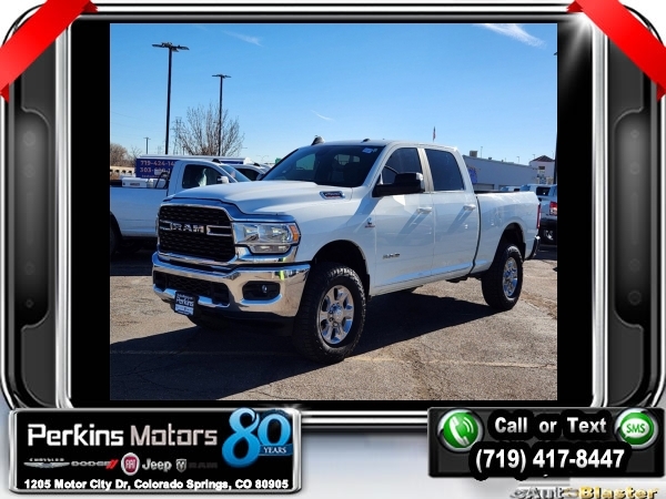 Bright White Clearcoat 4WD Cummins 6.7L I6 Turbodiesel 6-Speed Automatic<br><br>2 Way Rear Headrest Seat, 220 Amp Alternator, 2nd Row In Floor Storage Bins, 4 Way Front Headrests, 40/20/40 Split Bench Seat, Auto-Dimming Rear-View Mirror, Center Hub, Center Stack Storage Drawer, Cold Weather Group, Dual Glove Boxes, Engine Block Heater, Foam Bottle Insert (Door Trim Panel), Folding Flat Load Floor Storage, Footwell Courtesy Lamp, Front Armrest w/Cupholders, Front Center Seat Cushion Storage, Front Fog Lamps, Front Seat Back Map Pockets, Glove Box Lamp, Heavy Duty Snow Plow Prep Group, Leather Wrapped Steering Wheel, Level A Equipment Group, Locking Lower Glove Box, Manual Adjust 4-Way Front Passenger Seat, MOPAR Winter Front Grille Cover, Power 2-Way Driver Lumbar Adjust, Power Adjust 8-Way Driver Seat, Power Adjustable Pedals, Premium Cloth 40/20/40 Bench Seat, Quick Order Package 2HZ Big Horn, Rear 60/40 Folding Seat, Rear Dome w/On/Off Switch Lamp, Steering Wheel Mounted Audio Controls, Storage Tray, Sun Visors w/Illuminated Vanity Mirrors, Universal Garage Door Opener, Wheels: 18 x 8.0 Polished Aluminum.<br><br><br>Clean CARFAX.<br><br>Check us out at www.perkinsmotors.com to see our specials! Since opening our doors in 1944, we’ve been proud to serve Colorado Springs, CO, and the surrounding areas of Pueblo, Castle Rock and Denver, CO. Throughout this time of being family owned for 80 years, we’ve maintained a firm commitment to our customers: to offer a wide selection of New Chrysler, Dodge, Fiat, Jeep, and Ram vehicles and quality pre-owned vehicles, and provide a quick, no-hassle car-buying process that ensures everyone drives off the lot satisfied with their purchase.<br><br><br>Cold Weather Group (Engine Block Heater and MOPAR Winter Front Grille Cover), Heavy Duty Snow Plow Prep Group (220 Amp Alternator), Level An Equipment Group (2 Way Rear Headrest Seat, 2nd Row In Floor Storage Bins, 4 Way Front Headrests, 40/20/40 Split Bench Seat, Auto-Dimming Rear-View Mirror, Center Hub, Center Stack Storage Drawer, Dual Glove Boxes, Foam Bottle Insert (Door Trim Panel), Folding Flat Load Floor Storage, Footwell Courtesy Lamp, Front Armrest w/Cupholders, Front Center Seat Cushion Storage, Front Fog Lamps, Front Seat Back Map Pockets, Glove Box Lamp, Leather Wrapped Steering Wheel, Locking Lower Glove Box, Manual Adjust 4-Way Front Passenger Seat, Power 2-Way Driver Lumbar Adjust, Power Adjust 8-Way Driver Seat, Power Adjustable Pedals, Premium Cloth 40/20/40 Bench Seat, Rear 60/40 Folding Seat, Rear Dome w/On/Off Switch Lamp, Steering Wheel Mounted Audio Controls, Storage Tray, Sun Visors w/Illuminated Vanity Mirrors, Universal Garage Door Opener, and Wheels: 18 x 8.0 Polished Aluminum), Quick Order Package 2HZ Big Horn, 3.73 Axle Ratio, 4-Wheel Disc Brakes, 4G LTE Wi-Fi Hot Spot, 6 Speakers, 8.4 Touchscreen Display, ABS brakes, Active Noise Control System, Air Conditioning, AM/FM radio: SiriusXM, Apple CarPlay, Apple CarPlay/Android Auto, Bluetooth Handsfree Phone & Audio, Brake assist, Bumpers: chrome, Chrome Flat Cab-Length Side Steps, Cloth 40/20/40 Bench Seat, Compass, Connectivity - US/Canada, Cruise Control, Delay-off headlights, Driver door bin, Dual front impact airbags, Dual front side impact airbags, Electronic Stability Control, Electronically Controlled Throttle, Front anti-roll bar, Front Center Armrest w/Storage, Front License Plate Bracket, Front reading lights, Fully automatic headlights, Global Telematics Box Module (TBM), Google Android Auto, GPS Antenna Input, Heated door mirrors, Illuminated entry, Integrated Center Stack Radio, Integrated Voice Command w/Bluetooth, Low tire pressure warning, Manual Adjust 4-Way Driver Seat, Manufacturer's Statement of Origin, MOPAR Spray In Bedliner, Occupant sensing airbag, Outside temperature display, Overhead airbag, Overhead console, Panic alarm, ParkSense Front/Rear Park Assist System, ParkView Rear Back-Up Camera, Passenger door bin, Passenger vanity mirro