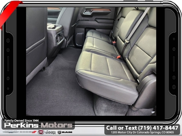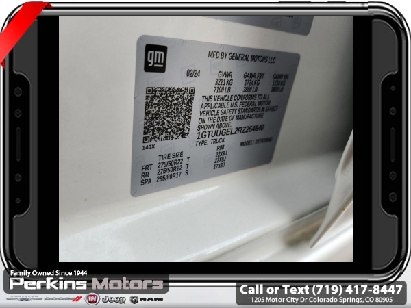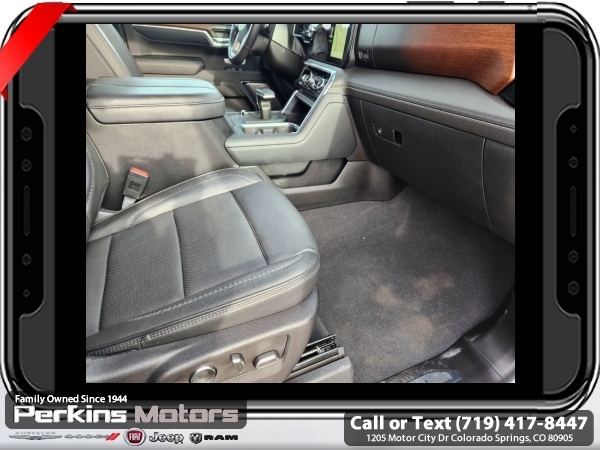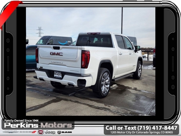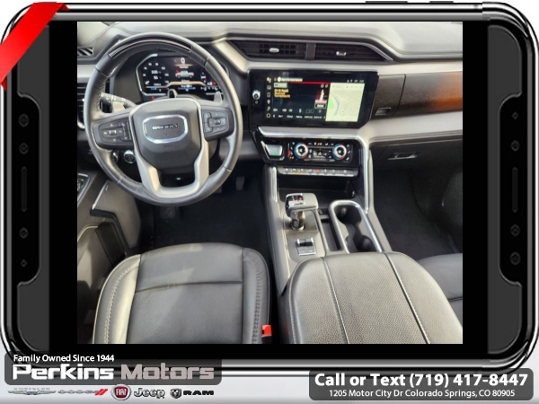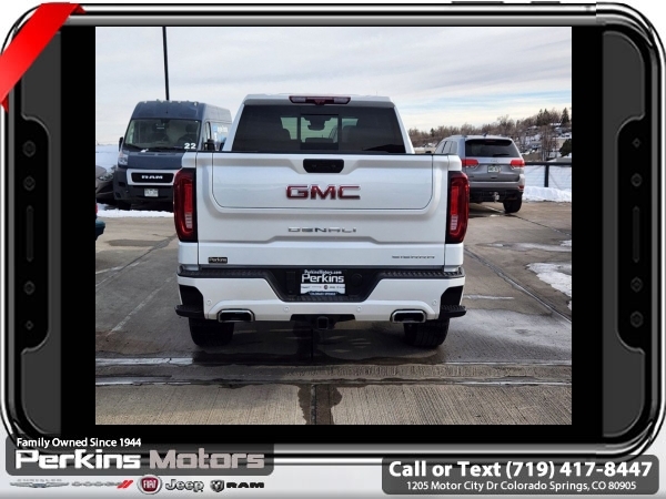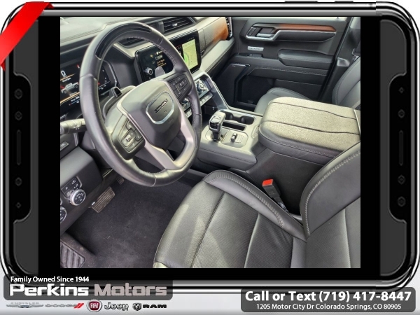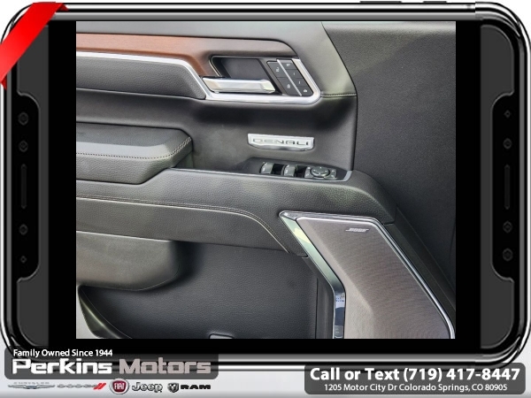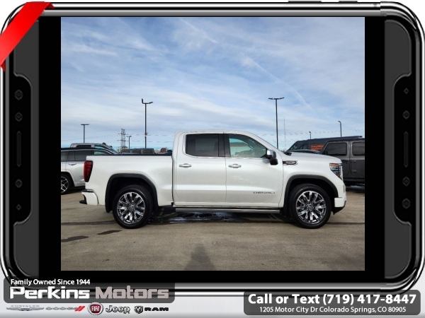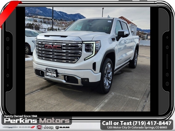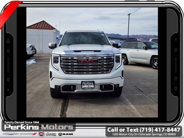 White Frost Tricoat 4WD EcoTec3 6.2L V8 10-Speed Automatic<br><br>DENALI RESERVE SUPER CRUISE, 10-Speed Automatic, 4WD, Jet Black Leather, 120-Volt Bed Mounted Power Outlet, 120-Volt Interior Power Outlet, 170 Amp Alternator, 2 Charge/Data USB Ports Inside Center Console, 2 Type-C Charge-Only Rear USB Ports, 2 USB Ports, Auto-Locking Rear Differential, Auxiliary External Transmission Oil Cooler, Bed View Camera, Chrome Header w/Signature Denali Chrome Grille, Chrome Recovery Hooks, Chrome Wheel To Wheel Assist Steps, Color-Keyed Carpeting Floor Covering, Deep-Tinted Glass, Denali Reserve Super Package, Electric Rear-Window Defogger, Floor-Mounted Center Console, Front Rain-Sensing Wipers, GMC Connected Access Capable, GMC MultiPro Power Steps, HD Surround Vision, Heated 2nd Row Outboard Seats, Heated Driver & Front Outboard Passenger Seating, Heavy-Duty Air Filter, Hill Descent Control, Hitch Guidance, Hitch View, In-Vehicle Trailering System App, Integrated Trailer Brake Controller, Keyless Open & Start, LED Cargo Area Lighting, Multicolor 15 Diagonal Head-Up Display, Navigation System, OnStar & GMC Connected Services Capable, Perimeter Lighting, Power Door Locks, Power Front Passenger Windows w/Express Up/Down, Power Front Windows w/Driver Express Up/Down, Power Rake & Telescoping Steering Column, Power Rear Windows w/Express Down, Power Sliding Rear Window w/Rear Defogger, Power Sunroof, Preferred Equipment Group 5SA, Premium Bose 7-Speaker Sound System, Push Button Start, Rear Camera Mirror, Rear Cross Traffic Braking, Rear Pedestrian Detection, Rear Wheelhouse Liners, Remote Vehicle Starter System, SiriusXM w/360L, Spray-On Pickup Bedliner w/Denali Logo, Steering Wheel Audio Controls, Super Cruise, Super Cruise Wrapped Steering Wheel, Technology Package, Theft Deterrent System (Unauthorized Entry), Trailer Camera Provisions, Trailer Side Blind Zone Alert, Trailering Package, Ultrasonic Front & Rear Park Assist, Universal Home Remote, Ventilated Driver & Front Passenger Seats, Wheel Locks (Set of 4) (LPO), Wheels: 22 x 9 Painted Aluminum, Wi-Fi Hotspot Capable, Wireless Charging.<br><br><br>CARFAX One-Owner. Clean CARFAX.<br><br>Check us out at www.perkinsmotors.com to see our specials! Since opening our doors in 1944, we’ve been proud to serve Colorado Springs, CO, and the surrounding areas of Pueblo, Castle Rock and Denver, CO. Throughout this time of being family owned for 80 years, we’ve maintained a firm commitment to our customers: to offer a wide selection of New Chrysler, Dodge, Fiat, Jeep, and Ram vehicles and quality pre-owned vehicles, and provide a quick, no-hassle car-buying process that ensures everyone drives off the lot satisfied with their purchase.<br><br><br>Denali Reserve Super Package (GMC MultiPro Power Steps, Power Sunroof, Super Cruise, Super Cruise Wrapped Steering Wheel, Wheel Locks (Set of 4) (LPO), and Wheels: 22 x 9 Painted Aluminum), Preferred Equipment Group 5SA (120-Volt Bed Mounted Power Outlet, 120-Volt Interior Power Outlet, 170 Amp Alternator, 2 Charge/Data USB Ports Inside Center Console, 2 Type-C Charge-Only Rear USB Ports, 2 USB Ports, Auto-Locking Rear Differential, Auxiliary External Transmission Oil Cooler, Bed View Camera, Chrome Header w/Signature Denali Chrome Grille, Chrome Recovery Hooks, Chrome Wheel To Wheel Assist Steps, Color-Keyed Carpeting Floor Covering, Deep-Tinted Glass, Electric Rear-Window Defogger, Floor-Mounted Center Console, Front Rain-Sensing Wipers, GMC Connected Access Capable, HD Surround Vision, Heated 2nd Row Outboard Seats, Heated Driver & Front Outboard Passenger Seating, Heavy-Duty Air Filter, Hill Descent Control, Hitch View, In-Vehicle Trailering System App, Integrated Trailer Brake Controller, Keyless Open & Start, LED Cargo Area Lighting, OnStar & GMC Connected Services Capable, Perimeter Lighting, Power Door Locks, Power Front Passenger Windows w/Express Up/Down, Power Front Windows w/Driver Express Up/Down, Power Rake & Telescoping Steeri