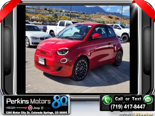 Factory MSRP: $34,095 $1,523 off MSRP! Red by (Red) 2024 Fiat 500e Battery Electric FWD 1-Speed Automatic Electric<br><br>Check us out at www.perkinsmotors.com to see our specials! Since opening our doors in 1944, we’ve been proud to serve Colorado Springs, CO, and the surrounding areas of Pueblo, Castle Rock and Denver, CO. Throughout this time of being family owned for 80 years, we’ve maintained a firm commitment to our customers: to offer a wide selection of New Chrysler, Dodge, Fiat, Jeep, and Ram vehicles and quality pre-owned vehicles, and provide a quick, no-hassle car-buying process that ensures everyone drives off the lot satisfied with their purchase.<br><br>Quick Order Package 21A 500e Inspi(red), 6 Speakers, ABS brakes, Air Conditioning, Alloy wheels, AM/FM radio: SiriusXM, Anti-whiplash front head restraints, Automatic temperature control, Brake assist, Bumpers: body-color, Cloth Bucket Seats w/Red Accents, Compass, Cruise Control, Delay-off headlights, Driver door bin, Dual front impact airbags, Dual front side impact airbags, Electronic Stability Control, Front anti-roll bar, Front Bucket Seats, Front Center Armrest, Front dual zone A/C, Front reading lights, Front wheel independent suspension, Fully automatic headlights, Illuminated entry, Knee airbag, Low tire pressure warning, Manufacturer's Statement of Origin, Navigation System, Occupant sensing airbag, Outside temperature display, Overhead airbag, Overhead console, Panic alarm, ParkView Rear Back-Up Camera, Passenger door bin, Passenger vanity mirror, Power door mirrors, Power steering, Power windows, Premium audio system: Uconnect 5.0, Radio data system, Radio: Uconnect 5 Nav w/10.25 Display, Rain sensing wipers, Rear anti-roll bar, Rear window defroster, Rear window wiper, Remote keyless entry, Security system, Split folding rear seat, Spoiler, Sport steering wheel, Steering wheel mounted audio controls, Telescoping steering wheel, Tilt steering wheel, Traction control, Trip computer, Variably intermittent wipers, and Wheels: 17 x 7.0 Aluminum Multi-Spoke. Sale price includes all manufacture's incentives and dealer discounts. Sale price not available on lease or compatible with special APR. $500 - 2024 National Holiday Bonus Cash. Exp. 01/02/2025