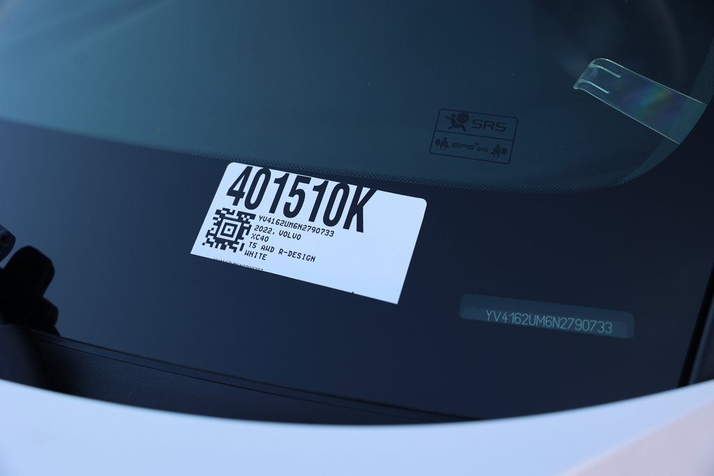 Crystal White Metallic 2022 Volvo XC40 R-Design AWD Automatic with Geartronic I4 8 Speakers, Air Conditioning, AM/FM radio: SiriusXM, Brake assist, Electronic Stability Control, Exterior Parking Camera Rear, Front Bucket Seats, Front dual zone A/C, Front fog lights, Front Heated Bucket Seats, Fully automatic headlights, Heated front seats, Memory seat, Navigation system: Sensus Navigation Pro, Power moonroof, Premium audio system: Sensus Connect, R-Design Nubuck/Nappa Leather Seating Surfaces, Rear fog lights, Roof rack: rails only, Speed control, Spoiler, Turn signal indicator mirrors, Wheels: 19" 5-Double Spoke Black Diamond Cut Alloy.Odometer is 931 miles below market average! 22/30 City/Highway MPG