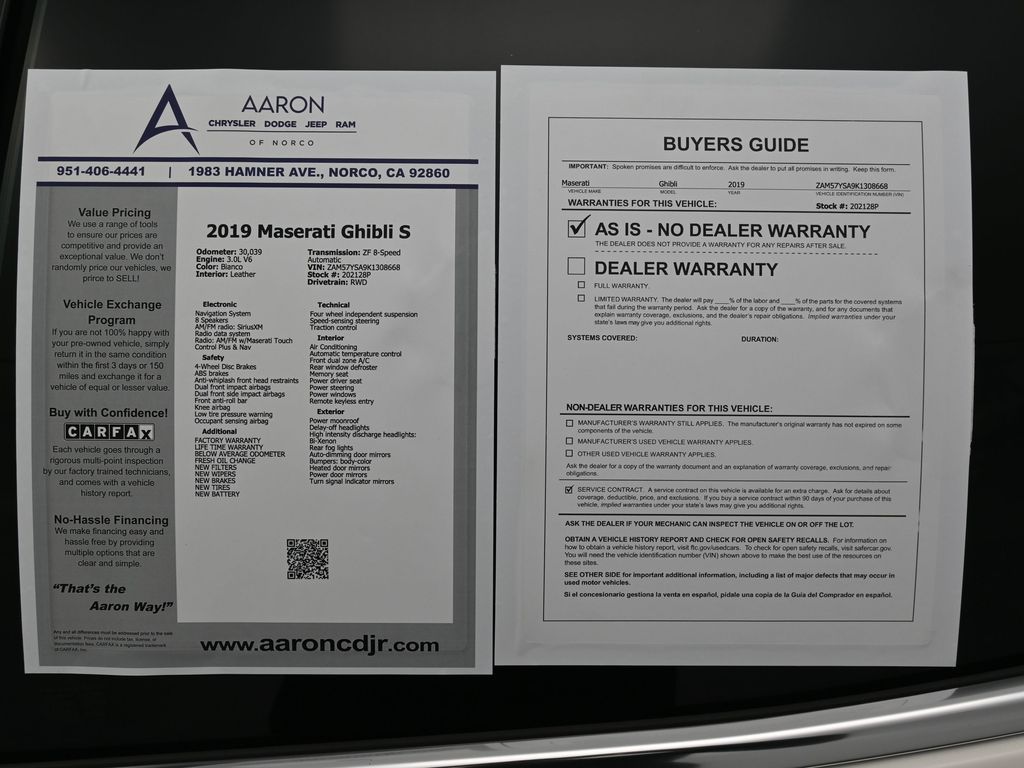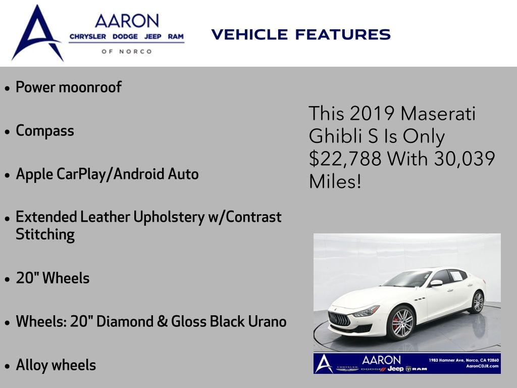 Priced below KBB Fair Purchase Price!BELOW AVERAGE ODOMETER, FRESH OIL CHANGE, NEW FILTERS, NEW WIPERS, Ghibli S, 4D Sedan, 3.0L V6, ZF 8-Speed Automatic, RWD, 20" Wheels, Alloy wheels, Apple CarPlay/Android Auto, Compass, Extended Leather Upholstery w/Contrast Stitching, Front dual zone A/C, Knee airbag, Low tire pressure warning, Memory seat, Navigation System, Power moonroof, Radio: AM/FM w/Maserati Touch Control Plus & Nav, Wheels: 20" Diamond & Gloss Black Urano.For help with any Vehicle needs please call us directly at 951-621-1288.Clean CARFAX.