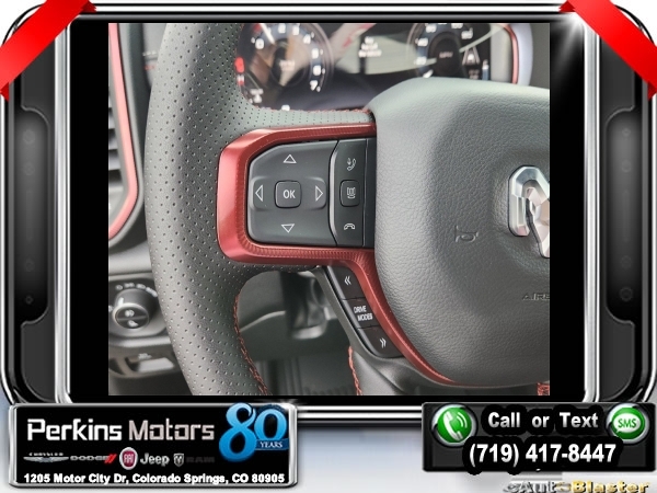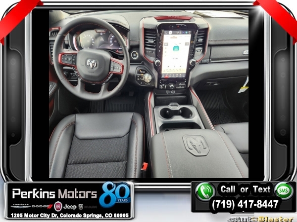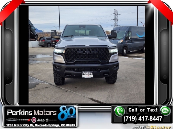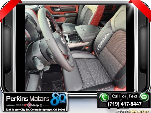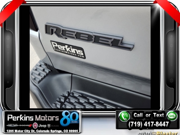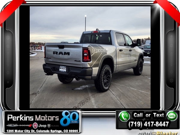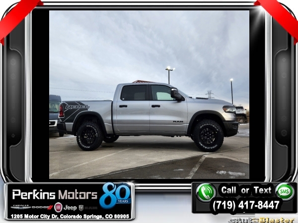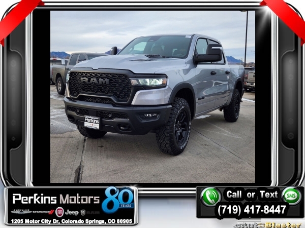 Factory MSRP: $69,315 $13,000 off MSRP! Priced below KBB Fair Purchase Price! Billet Silver Metallic Clearcoat 2025 Ram 1500 Rebel 4WD 8-Speed Automatic 3.0L I6<br><br>Check us out at www.perkinsmotors.com to see our specials! Since opening our doors in 1944, we’ve been proud to serve Colorado Springs, CO, and the surrounding areas of Pueblo, Castle Rock and Denver, CO. Throughout this time of being family owned for 80 years, we’ve maintained a firm commitment to our customers: to offer a wide selection of New Chrysler, Dodge, Fiat, Jeep, and Ram vehicles and quality pre-owned vehicles, and provide a quick, no-hassle car-buying process that ensures everyone drives off the lot satisfied with their purchase.<br><br>Bed Utility Group (MOPAR 4 Adjustable Cargo Tie-Down Hooks, MOPAR Spray In Bedliner, and Truck Bed Cargo Divider), Quick Order Package 21W Rebel, Rebel Level 1 Equipment Group (Auto Power-Folding Mirrors, Auto-Dimming Exterior Driver Mirror, Black Premium Power Mirrors, Convex Wide-Angle Exterior Mirror Insert, Exterior Mirrors Courtesy Lamps, Exterior Mirrors w/Heating Element, Exterior Mirrors w/Supplemental Signals, Heated Steering Wheel, Power 2-Way Driver Lumbar Adjust, Power Adjustable Pedals, Rear Window Defroster, Remote Tailgate Release, and Wireless Charging Pad), Trailer Tow Group (Accent Color Tailgate Handle, Auto-Dimming Exterior Passenger Mirror, Exterior Mirrors w/Memory, Forward & Reverse Utility Lights, Manual Folding Exterior Mirrors, Manual Telescoping Mirrors, Mirror Clearance/Running Lights, Power Telescoping Mirrors, Power-Adjustable Convex Aux Mirrors, Trailer Brake Control, Trailer Light Check, Trailer Reverse Steering Control, Trailer Tire Pressure Monitoring System, and Trailer Tow Mirrors), 10 Speakers, 3.92 Rear Axle Ratio, 4 Way Front Headrests, 4-Wheel Disc Brakes, 4G LTE Wi-Fi Hot Spot, ABS brakes, Air Conditioning, Alloy wheels, AM/FM radio: SiriusXM with 360L, Apple CarPlay, Apple CarPlay/Android Auto, Auto High-beam Headlights, Auto-dimming Rear-View mirror, Automatic temperature control, Brake assist, Bucket Seats, Cloth/Vinyl Bucket Seats, Compass, Connected Travel & Traffic Services, Connectivity - US/Canada, Cruise Control, Delay-off headlights, Driver door bin, Driver vanity mirror, Dual front impact airbags, Dual front side impact airbags, Electronic Stability Control, Engine Block Heater, Front anti-roll bar, Front Bucket Seats, Front Center Armrest w/Storage, Front dual zone A/C, Front fog lights, Front License Plate Bracket, Front reading lights, Front Seat Back Map Pockets, Front wheel independent suspension, Full Length Upgraded Floor Console, Fully automatic headlights, Garage door transmitter, Google Android Auto, GPS Antenna Input, GPS Navigation, Heated door mirrors, Heated front seats, Heated steering wheel, Illuminated entry, Integrated Voice Command w/Bluetooth, Leather steering wheel, Low tire pressure warning, Manufacturer's Statement of Origin, Navigation System, Occupant sensing airbag, Outside temperature display, Overhead airbag, Overhead console, Panic alarm, ParkView Rear Back-Up Camera, Passenger door bin, Passenger vanity mirror, Power Adjust 8-Way Driver Seat, Power door mirrors, Power driver seat, Power steering, Power windows, Radio data system, Radio: Uconnect 5 Nav w/12.0 Display, Rear 60/40 Folding Seat, Rear anti-roll bar, Rear seat center armrest, Rear step bumper, Remote keyless entry, SiriusXM w/360L, Split folding rear seat, Steering wheel mounted audio controls, Tachometer, Telescoping steering wheel, Tilt steering wheel, Traction control, Trip computer, USB Host Flip, Variably intermittent wipers, Voltmeter, and Wheels: 18 x 8.0 Pain Sale price includes all manufacture's incentives and dealer discounts. Sale price not available on lease or compatible with special APR. $1000 - 2025 National Truck Month Bonus Cash . Exp. 03/03/2025 $1500 - 2025 West BC SFS Bonus Cash . Exp. 03/03/2025 $4000 - 2025 National Retail Consumer Cash. Exp. 0