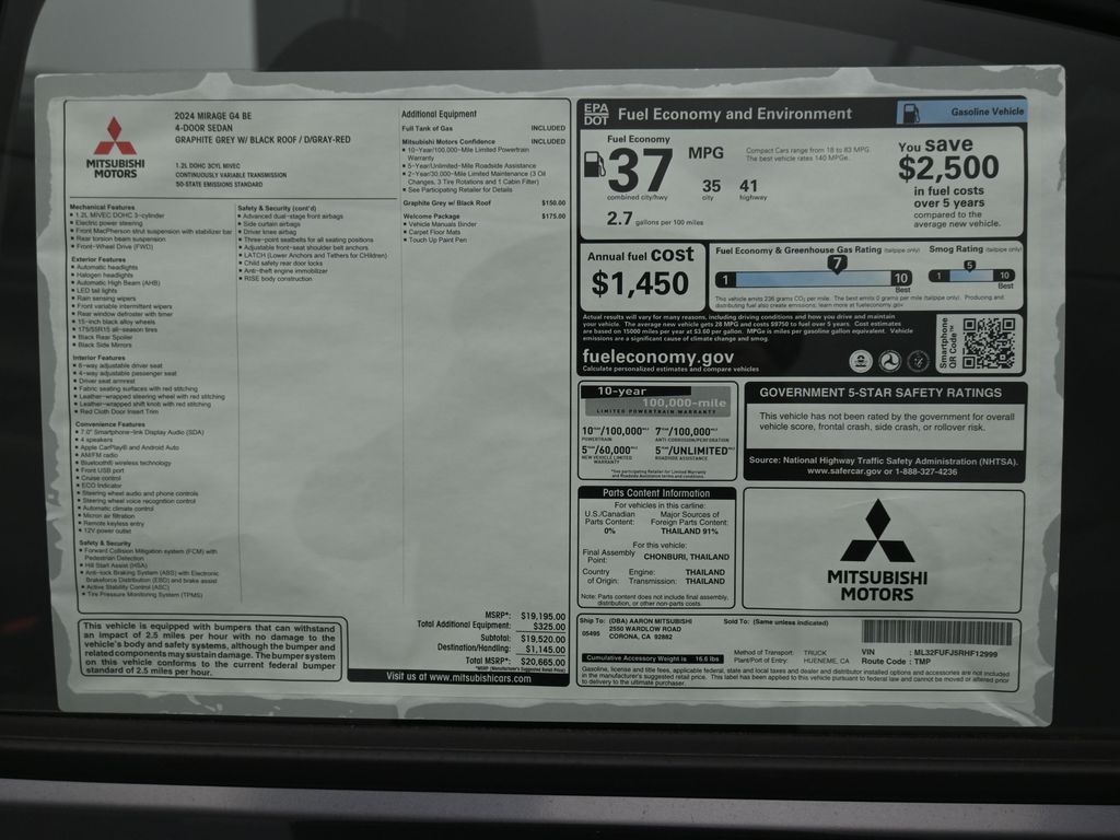 Graphite Gray Metallic w/Black Roof 2024 Mitsubishi Mirage G4 Black Edition FWD CVT 1.2L 3-Cylinder DOHC MIVECFind your next ride at Aaron Mitsubishi of Corona, where we offer a wide range of new Mitsubishi vehicles. From the fuel-efficient Mirage to the versatile Outlander, our selection is designed to meet all your driving needs. Visit us and drive away in a stylish, reliable Mitsubishi today. 35/41 City/Highway MPG