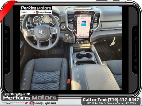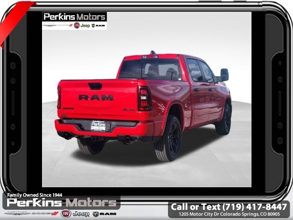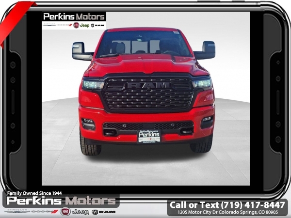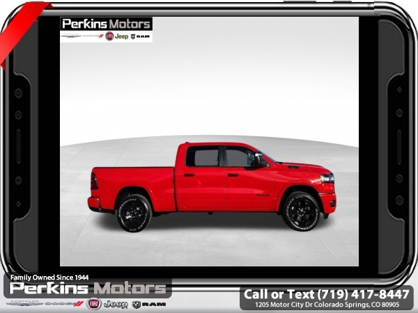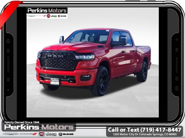 Factory MSRP: $65,730 $15,220 off MSRP! Priced below KBB Fair Purchase Price! Flame Red Clearcoat 2025 Ram 1500 Big Horn/Lone Star 4WD 8-Speed Automatic 3.0L I6<br><br>Check us out at www.perkinsmotors.com to see our specials! Since opening our doors in 1944, we’ve been proud to serve Colorado Springs, CO, and the surrounding areas of Pueblo, Castle Rock and Denver, CO. Throughout this time of being family owned for 80 years, we’ve maintained a firm commitment to our customers: to offer a wide selection of New Chrysler, Dodge, Fiat, Jeep, and Ram vehicles and quality pre-owned vehicles, and provide a quick, no-hassle car-buying process that ensures everyone drives off the lot satisfied with their purchase.<br><br>Big Horn Level 2 Equipment Group (115V Auxiliary Power Outlet, 115V Auxiliary Rear Power Outlet, 12 Touchscreen Display, 2nd Row In Floor Storage Bins, 400W Inverter, 4G LTE Wi-Fi Hot Spot, 9 Amplified Speakers w/Subwoofer, Air Conditioning ATC w/Dual Zone Control, Apple CarPlay, Auto Power-Folding Mirrors, Auto-Dimming Exterior Driver Mirror, Auto-Dimming Rear-View Mirror, Black Exterior Mirrors, Black Premium Power Mirrors, Cluster 7.0 TFT Color Display, Configurable Drive Mode, Connected Travel & Traffic Services, Connectivity - US/Canada, Convex Wide-Angle Exterior Mirror Insert, Exterior Mirrors Courtesy Lamps, Exterior Mirrors w/Heating Element, Exterior Mirrors w/Supplemental Signals, Glove Box Lamp, Google Android Auto, GPS Antenna Input, GPS Navigation, HD Radio, Heated Front Seats, Heated Steering Wheel, Integrated Voice Command w/Bluetooth, Leather Wrapped Steering Wheel, LED Dome Lamp w/On/Off Switch, LED Footwell Lighting, Media Hub w/2 Charge Only USBs, Overhead LED Lamps, Power 2-Way Driver Lumbar Adjust, Power Adjust 8-Way Driver Seat, Power Adjustable Pedals, Premium Overhead Console, Radio: Uconnect 5 Nav w/12.0 Display, Rear Power Sliding Window, Rear Window Defroster, Remote Tailgate Release, Security Alarm, SiriusXM w/360L, Sun Visors w/Illuminated Vanity Mirrors, Universal Garage Door Opener, and USB Host Flip), Night Edition (3 Rear Seat Head Restraints, 4 Way Front Headrests, Accent Color Door Handles, Accent Color Premium Power Mirrors, Anti-Spin Differential Rear Axle, Black Exterior Truck Badging, Black Headlamp Bezels, Black Interior Accents, Black Painted Exterior Mirrors Caps, Black Tail Lamp Bezels, Body Color Front Bumper, Body Color Rear Bumper w/Step Pads, Bucket Seats, Deluxe Cloth Bucket Seats, Dual Exhaust w/Black Tips, Front Seat Back Map Pockets, Full Length Floor Console, Grille Black Surround Black Mesh, Manual Adjust 4-Way Front Passenger Seat, RAM Grille Badge - Black, Rear 60/40 Folding Seat, Rear Center Armrest, and Wheels: 20 x 9.0 Aluminum Painted Clad), Protection Group (Tow Hooks), Quick Order Package 21Z Big Horn, Trailer Tow Group (Accent Color Tailgate Handle, Black Trailer Tow Power Mirrors, Manual Folding Exterior Mirrors, Manual Telescoping Mirrors, Mirror Clearance/Running Lights, Power-Adjustable Convex Aux Mirrors, Trailer Brake Control, Trailer Light Check, Trailer Reverse Steering Control, Trailer Tire Pressure Monitoring System, and Trailer Tow Mirrors), 3.55 Rear Axle Ratio, 3.92 Rear Axle Ratio, 4-Wheel Disc Brakes, 6 Speakers, ABS brakes, Air Conditioning, Alloy wheels, AM/FM radio, Apple CarPlay/Android Auto, Auto High-beam Headlights, Brake assist, Bumpers: chrome, Cloth Bench Seat, Compass, Cruise Control, Delay-off headli Sale price includes all manufacture's incentives and dealer discounts. Sale price not available on lease or compatible with special APR. $1000 - 2025 National Truck Month Bonus Cash . Exp. 04/30/2025 $1000 - 2025 West BC SFS Bonus Cash . Exp. 04/30/2025 $1000 - 2025 West BC SFS Retail Bonus Cash . Exp. 04/30/2025 $1500 - 2025 National Bonus Cash . Exp. 04/30/2025 $1500 - 2025 National Conquest Dealer Cash. Exp. 04/30/2025 $4000 - 2025 National Retail Consumer Cash. Exp. 04/30/2025 Price includes $1,780 in dealer added a