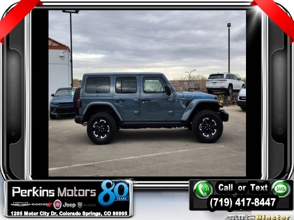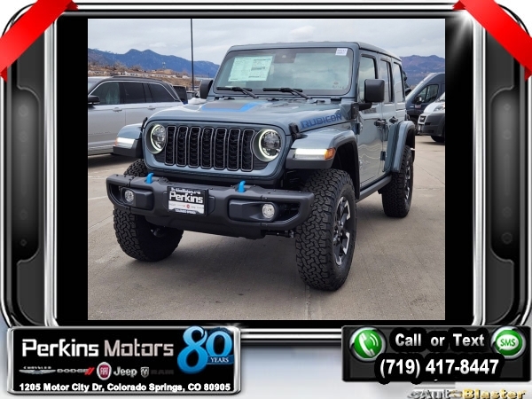 Factory MSRP: $73,100 $12,500 off MSRP! Priced below KBB Fair Purchase Price! Anvil Clear Coat 2024 Jeep Wrangler Rubicon X 4xe 4WD 8-Speed Automatic 2.0L I4 DOHC<br>2.0L I4 DOHC.<br>Check us out at www.perkinsmotors.com to see our specials! Since opening our doors in 1944, we’ve been proud to serve Colorado Springs, CO, and the surrounding areas of Pueblo, Castle Rock and Denver, CO. Throughout this time of being family owned for 80 years, we’ve maintained a firm commitment to our customers: to offer a wide selection of New Chrysler, Dodge, Fiat, Jeep, and Ram vehicles and quality pre-owned vehicles, and provide a quick, no-hassle car-buying process that ensures everyone drives off the lot satisfied with their purchase.<br><br>Quick Order Package 29Y Rubicon X (12.3 Touchscreen Display, 4G LTE Wi-Fi Hot Spot, Apple CarPlay, Auto High Beam Headlamp Control, Body Color 3-Piece Hard Top, Body Color Rubicon Highline Flare, Connected Travel & Traffic Services, Connectivity - US/Canada, Disassociated Touchscreen Display, Freedom Panel Storage Bag, Google Android Auto, GPS Navigation, HD Radio, Heated Steering Wheel, Integrated Center Stack Radio, Integrated Off-Road Camera, Integrated Voice Command w/Bluetooth, MOPAR Hardtop Headliner, ParkSense Rear Park Assist System, Radio: Uconnect 5 Nav w/12.3 Display, Rear Window Defroster, Rear Window Wiper/Washer, SiriusXM Radio Service, and Steel Rear Bumper), Trailer Tow & Aux Switch Group, Trailer Tow Prep Package (7 & 4 Pin Wiring Harness and 700 Amp Maintenance Free Battery), 2.0L I4 DOHC, 4-Wheel Disc Brakes, 4.10 Rear Axle Ratio, 8 Speakers, ABS brakes, Air Conditioning, Alloy wheels, AM/FM radio: SiriusXM, Apple CarPlay/Android Auto, Automatic temperature control, Brake assist, Compass, Cruise Control, Delay-off headlights, Driver door bin, Driver vanity mirror, Dual front impact airbags, Dual front side impact airbags, Electronic Stability Control, Emergency communication system: Jeep Connect, Front anti-roll bar, Front Bucket Seats, Front Center Armrest w/Storage, Front dual zone A/C, Front fog lights, Front License Plate Bracket, Front reading lights, Fully automatic headlights, Heated door mirrors, Illuminated entry, Integrated roll-over protection, Low tire pressure warning, MOPAR All-Weather Floor Mats, Occupant sensing airbag, Outside temperature display, Overhead airbag, Panic alarm, ParkView Rear Back-Up Camera, Passenger door bin, Passenger vanity mirror, Performance Suspension, Power door mirrors, Power steering, Power windows, Radio data system, Radio: Uconnect 5 w/12.3 Display, Rear anti-roll bar, Rear reading lights, Remote keyless entry, Security system, Split folding rear seat, Steering wheel mounted audio controls, Sustainable Premium Cloth Seats, Tachometer, Telescoping steering wheel, Tilt steering wheel, Traction control, Trip computer, Variably intermittent wipers, Voltmeter, and Wheels: 17 x 7.5 Machined w/Black Pockets. Sale price includes all manufacture's incentives and dealer discounts. Sale price not available on lease or compatible with special APR. $500 - 2024 National Start Something New Bonus Cash . Exp. 02/03/2025 $7500 - 2024 National Retail Consumer Cash . Exp. 02/03/2025