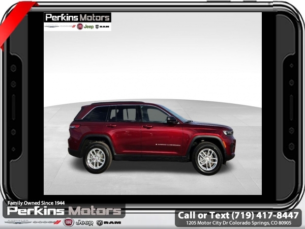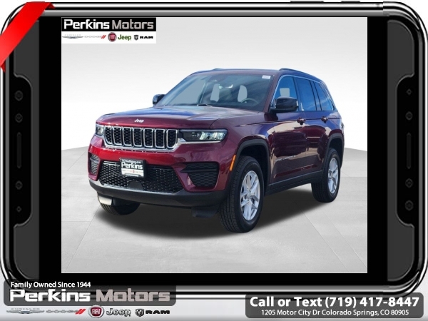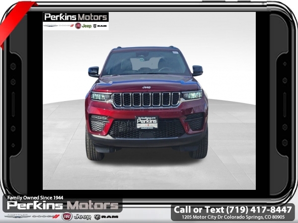 Factory MSRP: $42,175 $6,583 off MSRP! Priced below KBB Fair Purchase Price! Velvet Red Pearlcoat 2025 Jeep Grand Cherokee Laredo 4WD 8-Speed Automatic 3.6L V6 24V VVT<br>4WD.<br>Check us out at www.perkinsmotors.com to see our specials! Since opening our doors in 1944, we’ve been proud to serve Colorado Springs, CO, and the surrounding areas of Pueblo, Castle Rock and Denver, CO. Throughout this time of being family owned for 80 years, we’ve maintained a firm commitment to our customers: to offer a wide selection of New Chrysler, Dodge, Fiat, Jeep, and Ram vehicles and quality pre-owned vehicles, and provide a quick, no-hassle car-buying process that ensures everyone drives off the lot satisfied with their purchase.<br><br>4WD, 4-Wheel Disc Brakes, 6 Speakers, ABS brakes, Air Conditioning, Alloy wheels, AM/FM radio: SiriusXM, Anti-whiplash front head restraints, Automatic temperature control, Brake assist, Bumpers: body-color, Cloth Seats, Compass, Cruise Control, Delay-off headlights, Driver door bin, Driver vanity mirror, Dual front impact airbags, Dual front side impact airbags, Electronic Stability Control, Emergency communication system, Four wheel independent suspension, Front anti-roll bar, Front Bucket Seats, Front Center Armrest w/Storage, Front dual zone A/C, Front License Plate Bracket, Front reading lights, Fully automatic headlights, Heated door mirrors, Illuminated entry, Knee airbag, Low tire pressure warning, Model Year Tracking, Normal Duty Suspension, Occupant sensing airbag, Outside temperature display, Overhead airbag, Overhead console, Panic alarm, ParkView Rear Back-Up Camera, Passenger door bin, Passenger vanity mirror, Power door mirrors, Power driver seat, Power steering, Power windows, Radio data system, Radio: Uconnect 5 w/8.4 Display, Rear anti-roll bar, Rear reading lights, Rear window defroster, Rear window wiper, Remote keyless entry, Security system, Speed-Sensitive Wipers, Split folding rear seat, Spoiler, Steering wheel mounted audio controls, Tachometer, Telescoping steering wheel, Tilt steering wheel, Traction control, Trip computer, Variably intermittent wipers, Voltmeter, and Wheels: 17 x 6.5 Fully Painted Aluminum.<br><br>19/26 City/Highway MPG Sale price includes all manufacture's incentives and dealer discounts. Sale price not available on lease or compatible with special APR. $1000 - 2025 West BC SFS Bonus Cash . Exp. 06/30/2025