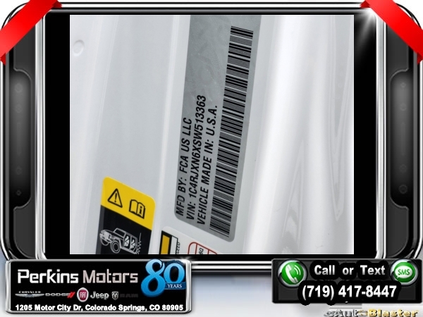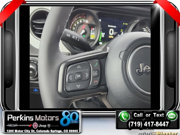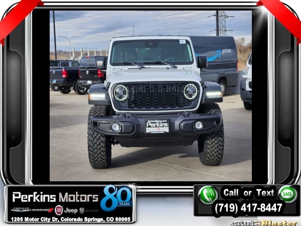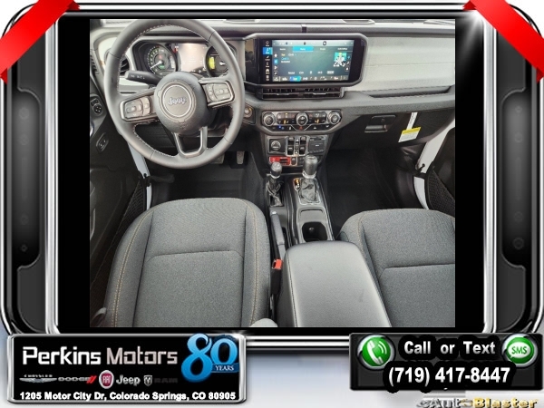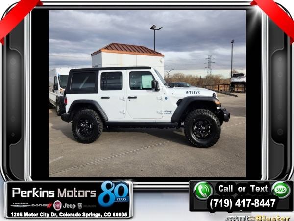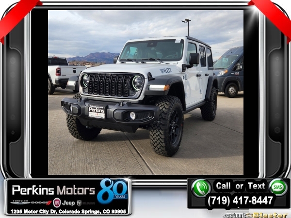 Factory MSRP: $61,315 $10,250 off MSRP! Priced below KBB Fair Purchase Price! Bright White Clearcoat 2025 Jeep Wrangler Willys 4xe 4WD 8-Speed Automatic 2.0L I4 DOHC<br>2.0L I4 DOHC.<br>Check us out at www.perkinsmotors.com to see our specials! Since opening our doors in 1944, we’ve been proud to serve Colorado Springs, CO, and the surrounding areas of Pueblo, Castle Rock and Denver, CO. Throughout this time of being family owned for 80 years, we’ve maintained a firm commitment to our customers: to offer a wide selection of New Chrysler, Dodge, Fiat, Jeep, and Ram vehicles and quality pre-owned vehicles, and provide a quick, no-hassle car-buying process that ensures everyone drives off the lot satisfied with their purchase.<br><br>Convenience Group (Emergency/Assistance Call, Heated Steering Wheel, and Remote Start System), Quick Order Package 29W Willys 4xe (E-Locker Rear Axle, Molded in Color Rubicon Highline Flare, and Wheels: 17 x 7.5 Painted Black), 2.0L I4 DOHC, 3.73 Rear Axle Ratio, 4-Wheel Disc Brakes, 8 Speakers, ABS brakes, Air Conditioning, Alloy wheels, Apple CarPlay/Android Auto, Black 3-Piece Hard Top, Brake assist, Cloth Low-Back Bucket Seats, Compass, Cruise Control, Delay-off headlights, Driver door bin, Driver vanity mirror, Dual front impact airbags, Dual front side impact airbags, Electronic Stability Control, Freedom Panel Storage Bag, Front anti-roll bar, Front Bucket Seats, Front Center Armrest w/Storage, Front fog lights, Front License Plate Bracket (DISC), Front reading lights, Fully automatic headlights, Heated door mirrors, Illuminated entry, Integrated roll-over protection, Jeep Trail Rated Kit, Low tire pressure warning, Occupant sensing airbag, Outside temperature display, Overhead airbag, Panic alarm, ParkView Rear Back-Up Camera, Passenger door bin, Passenger vanity mirror, Power door mirrors, Power steering, Power windows, Radio data system, Radio: Uconnect 5 w/12.3 Display, Rear anti-roll bar, Rear reading lights, Remote keyless entry, Security system, Split folding rear seat, Sport Suspension, Steering wheel mounted audio controls, Tachometer, Telescoping steering wheel, Tilt steering wheel, Traction control, Trip computer, Variably intermittent wipers, Voltmeter, and Wheels: 20 x 8 Machined/Painted Gray. Sale price includes all manufacture's incentives and dealer discounts. Sale price not available on lease or compatible with special APR. $500 - 2025 National Start Something New Bonus Cash . Exp. 02/03/2025 $6500 - 2025 National Retail Consumer Cash. Exp. 02/03/2025