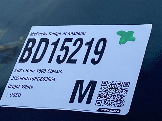 Certified. Clean CARFAX. CARFAX One-Owner. INTERIOR & EXTERIOR PROFESSIONALLY DETAILED FOR DELIVERY, MCPEEK CHRYSLER DODGE JEEP RAM FAMILY OWNED AND OPERATED SINCE 1961 !!!!!, 17" x 7" Steel Wheels, 3.21 Rear Axle Ratio, 4-Wheel Disc Brakes, 40/20/40 Split Bench Seat, 6 Speakers, ABS brakes, Active Grille Shutters, Air Conditioning, AM/FM radio, Audio Input Jack for Mobile Devices, Black Exterior Mirrors, Brake assist, Center Hub, Class IV Receiver Hitch, Compass, Delay-off headlights, Driver door bin, Dual front impact airbags, Dual front side impact airbags, Electronic Shift, Electronic Stability Control, Exterior Mirrors w/Heating Element, Front anti-roll bar, Front Armrest w/3 Cupholders, Front Center Armrest, Front License Plate Bracket, Front wheel independent suspension, Fully automatic headlights, GPS Antenna Input, Heavy Duty Vinyl 40/20/40 Split Bench Seat, Integrated Voice Command w/Bluetooth, Low tire pressure warning, Manual Adjust Seats, Manufacturer's Statement of Origin, Occupant sensing airbag, Outside temperature display, Overhead airbag, Overhead console, ParkView Rear Back-Up Camera, Passenger door bin, Power & Remote Entry Group, Power Heated Fold-Away Mirrors, Power Locks, Power steering, Power Windows w/Front 1-Touch Down, Premium Vinyl Door Trim w/Map Pocket, Quick Order Package 27B Tradesman, Radio data system, Radio: Uconnect 3 w/5" Display, Rear step bumper, Remote Keyless Entry w/All-Secure, Remote USB Port, Rotary Shifter-Black, Speed control, Tachometer, Tilt steering wheel, Tip Start, Traction control, Tradesman Package, Variably intermittent wipers, Voltmeter.Bright White Clearcoat 2023 Ram 1500 Classic Tradesman RWD 8-Speed AutomaticFCA US LLC Certified Pre-Owned Details: * Roadside Assistance * Transferable Warranty * Powertrain Limited Warranty: 84 Month/100,000 Mile (whichever comes first) from original in-service date * Limited Warranty: 3 Month/3,000 Mile (whichever comes first) after new car warranty expires or from certified purchase date * Warranty Deductible: $100 * Includes First Day Rental, Car Rental Allowance, and Trip Interruption Benefits. SiriusXM 3 month trial subscription. * Vehicle History * 125 Point InspectionReceive Free lube and oil filter changes for up to 45,000 miles for 3 years!!! McPeek's Dodge of Anahiem 1221 S. Auto Center Drive Anahiem, CA 92806 714-262-4902.
