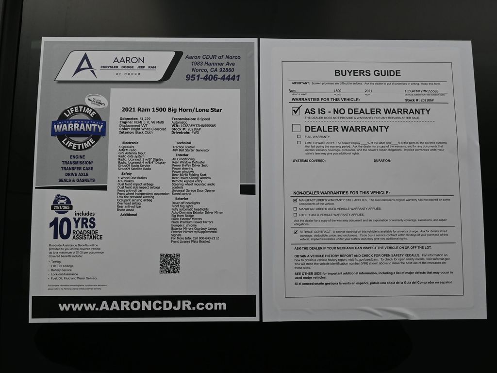 2021 Ram 1500 Big Horn Crew Cab 4x4. Equipped with the Big Horn Level 1 Equipment Group and a 5.7L HEMI V8 with eTorque, this truck blends rugged power with advanced features. With just over 64,000 miles, it delivers strong performance and capability. Para la versión en español, vea abajo.The Big Horn Level 1 Package adds premium conveniences like an 8.4-inch touchscreen display, Apple CarPlay, Android Auto, a power driver seat, and Uconnect with SiriusXM. Combined with the Crew Cabs spacious interior, this Ram 1500 offers comfort and technology for work or play.Under the hood, the 5.7L HEMI V8 with eTorque mild hybrid system boosts torque for towing and efficiency. Paired with the 8-speed automatic transmission and 4x4 drivetrain, its ready for hauling, off-road adventures, or daily driving confidence.Inside, the cabin offers flexible rear seating, multiple USB ports, and thoughtful storage options. Safety features like ParkView rear backup camera, trailer sway damping, electronic stability control, and advanced multistage front airbags add peace of mind on every drive.This model year of Ram 1500 was recognized for its reliability and strong performance in the full-size pickup segment. The blend of HEMI power, eTorque efficiency, and well-appointed interior makes it a standout in its class.Take the next step by messaging us for a personalized quote or to arrange a convenient visit. We offer flexible options like virtual consultations and promise to resolve any questions transparently to build your confidence in us.2021 Ram 1500 Big Horn Crew Cab 4x4. Equipado con el p