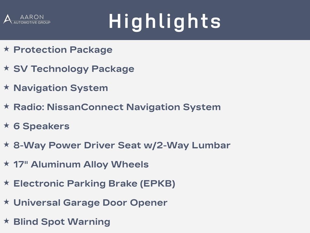 17" Aluminum Alloy Wheels, 6 Speakers, 8-Way Power Driver Seat w/2-Way Lumbar, Air Conditioning, Auto-Dimming Inside Mirror, Automatic Emergency Braking (PAEB), Blind Spot Warning, Electronic Parking Brake (EPKB), High Beam Assist (HBA), Intelligent Cruise Control, Intelligent Lane Intervention (I-LI), LED Headlights, LED Signature Daytime Running Lights, Navigation System, NissanConnect featuring Apple CarPlay and Android Auto, ProPILOT Assist, Protection Package, Radio: NissanConnect Navigation System, Rear Cross Traffic Alert (RCTA), Steering Assist, SV Technology Package, Universal Garage Door Opener.Odometer is 8738 miles below market average!124/99 City/Highway MPGCARFAX One-Owner.To see more quality vehicles like this one right just click on AaronFordofPoway.com or dial (858) 748-1400.Awards: * 2019 KBB.com 5-Year Cost to Own Awards