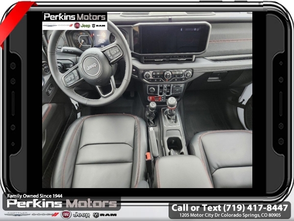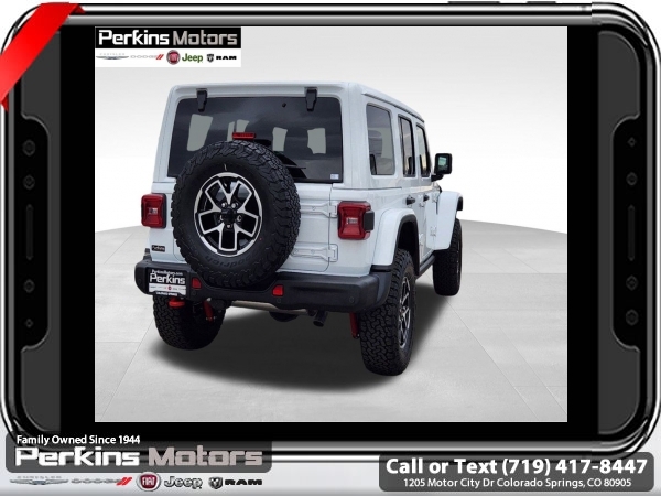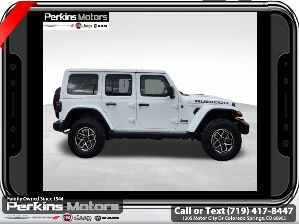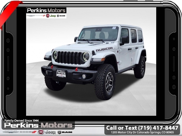 Factory MSRP: $63,665 $6,500 off MSRP! Priced below KBB Fair Purchase Price! Bright White Clearcoat 2025 Jeep Wrangler Rubicon X 4WD 6-Speed Manual 3.6L V6 24V VVT<br><br>Check us out at www.perkinsmotors.com to see our specials! Since opening our doors in 1944, we’ve been proud to serve Colorado Springs, CO, and the surrounding areas of Pueblo, Castle Rock and Denver, CO. Throughout this time of being family owned for 80 years, we’ve maintained a firm commitment to our customers: to offer a wide selection of New Chrysler, Dodge, Fiat, Jeep, and Ram vehicles and quality pre-owned vehicles, and provide a quick, no-hassle car-buying process that ensures everyone drives off the lot satisfied with their purchase.<br><br>Convenience Group (Universal Garage Door Opener), Quick Order Package 23Y Rubicon X (Body Color 3-Piece Hard Top and Rear Window Defroster), Technology Group (4G LTE Wi-Fi Hot Spot, Alpine Premium Audio System, Apple CarPlay, Auto-Dimming Rear-View Mirror, Connectivity - US/Canada, Google Android Auto, HD Radio, Radio: Uconnect 5 Nav w/12.3 Display, and SiriusXM w/360L), Trailer Tow Prep Package, 4-Wheel Disc Brakes, 4.10 Rear Axle Ratio, 8 Speakers, 97 MPH Vehicle Max Speed Calibration, ABS brakes, Air Conditioning, Alloy wheels, AM/FM radio: SiriusXM, Apple CarPlay/Android Auto, Automatic temperature control, Aux Battery, Auxiliary Switches, Brake assist, Class II Receiver Hitch, Cloth Low-Back Bucket Seats, Compass, Cruise Control, Delay-off headlights, Driver door bin, Driver vanity mirror, Dual front impact airbags, Dual front side impact airbags, Electronic Stability Control, Emergency communication system: Jeep Connect, Front anti-roll bar, Front Bucket Seats, Front Center Armrest w/Storage, Front dual zone A/C, Front fog lights, Front License Plate Bracket (DISC), Front reading lights, Fully automatic headlights, Heated door mirrors, Illuminated entry, Integrated roll-over protection, Jeep Trail Rated Kit, Low tire pressure warning, MOPAR All-Weather Floor Mats, Non-Lock Fuel Cap w/o Discriminator, Occupant sensing airbag, Outside temperature display, Overhead airbag, Panic alarm, ParkView Rear Back-Up Camera, Passenger door bin, Passenger vanity mirror, Performance Suspension, Power door mirrors, Power steering, Power windows, Radio data system, Radio: Uconnect 5 w/12.3 Display, Rear anti-roll bar, Rear reading lights, Remote keyless entry, Security system, Split folding rear seat, Steering wheel mounted audio controls, Stop-Start Dual Battery System, Tachometer, Telescoping steering wheel, Tilt steering wheel, Traction control, Trip computer, Variably intermittent wipers, Voltmeter, and Wheels: 17 x 7.5 Machined/Painted Black. Sale price includes all manufacture's incentives and dealer discounts. Sale price not available on lease or compatible with special APR. $2000 - 2025 National Bonus Cash . Exp. 03/31/2025 $500 - 2025 National Jeep Celebration Event Bonus Cash . Exp. 03/31/2025