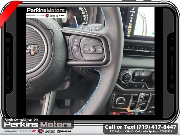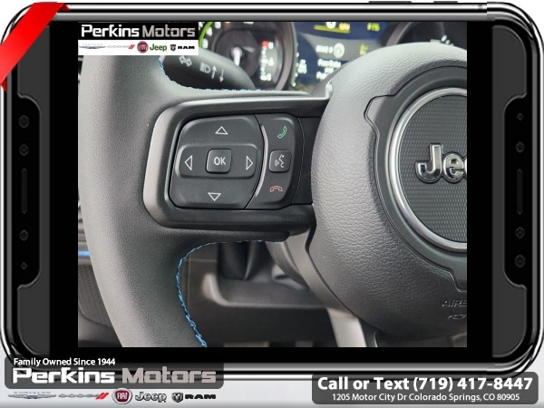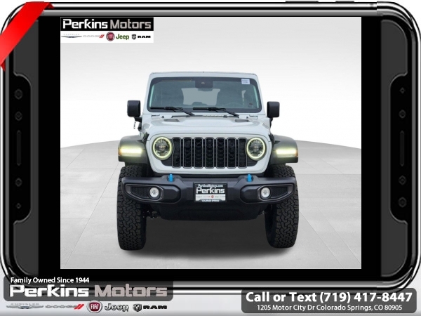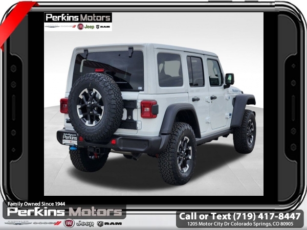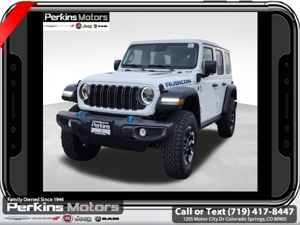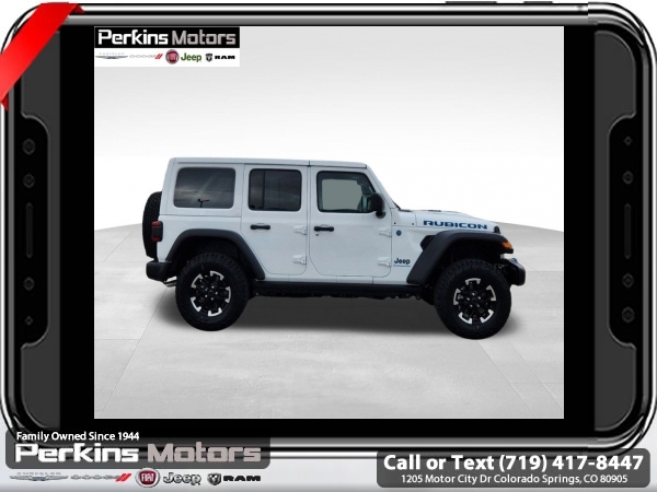 Factory MSRP: $74,155 $14,100 off MSRP! Priced below KBB Fair Purchase Price! Bright White Clearcoat 2025 Jeep Wrangler Rubicon 4xe 4WD 8-Speed Automatic 2.0L I4 DOHC<br>2.0L I4 DOHC.<br>Check us out at www.perkinsmotors.com to see our specials! Since opening our doors in 1944, we’ve been proud to serve Colorado Springs, CO, and the surrounding areas of Pueblo, Castle Rock and Denver, CO. Throughout this time of being family owned for 80 years, we’ve maintained a firm commitment to our customers: to offer a wide selection of New Chrysler, Dodge, Fiat, Jeep, and Ram vehicles and quality pre-owned vehicles, and provide a quick, no-hassle car-buying process that ensures everyone drives off the lot satisfied with their purchase.<br><br>Convenience Group (Heated Front Seats, Remote Start System, and Universal Garage Door Opener), Quick Order Package 29V Rubicon 4xe, Safety Group (Auto High Beam Headlamp Control and ParkSense Rear Park Assist System), Technology Group (4G LTE Wi-Fi Hot Spot, Alpine Premium Audio System, Apple CarPlay, Auto-Dimming Rear-View Mirror, Connectivity - US/Canada, Google Android Auto, HD Radio, Integrated Off-Road Camera, Integrated Voice Command w/Bluetooth, and Radio: Uconnect 5 Nav w/12.3 Display), 2.0L I4 DOHC, 4-Wheel Disc Brakes, 4.10 Rear Axle Ratio, 7 & 4 Pin Wiring Harness, 8 Speakers, ABS brakes, Air Conditioning, Alloy wheels, AM/FM radio: SiriusXM, Apple CarPlay/Android Auto, Automatic temperature control, Body Color 3-Piece Hard Top, Brake assist, Compass, Cruise Control, Delay-off headlights, Driver door bin, Driver vanity mirror, Dual front impact airbags, Dual front side impact airbags, Electronic Stability Control, Emergency communication system: Jeep Connect, Freedom Panel Storage Bag, Front anti-roll bar, Front Bucket Seats, Front Center Armrest w/Storage, Front dual zone A/C, Front fog lights, Front License Plate Bracket (DISC), Front reading lights, Fully automatic headlights, Heated door mirrors, Illuminated entry, Integrated roll-over protection, Jeep Trail Rated Kit, Low tire pressure warning, MOPAR All-Weather Floor Mats, MOPAR Doors Off Mirror Kit, MOPAR Hardtop Headliner, MOPAR Hinge-Gate Reinforcement, Occupant sensing airbag, Outside temperature display, Overhead airbag, Panic alarm, ParkView Rear Back-Up Camera, Passenger door bin, Passenger vanity mirror, Performance Suspension, Power door mirrors, Power steering, Power windows, Radio data system, Radio: Uconnect 5 w/12.3 Display, Rear anti-roll bar, Rear reading lights, Rear Window Wiper/Washer, Remote keyless entry, Security system, Split folding rear seat, Steering wheel mounted audio controls, Sustainable Premium Cloth Seats, Tachometer, Telescoping steering wheel, Tilt steering wheel, Traction control, Trip computer, Variably intermittent wipers, Voltmeter, and Wheels: 17 x 7.5 Machined w/Black Pockets. Sale price includes all manufacture's incentives and dealer discounts. Sale price not available on lease or compatible with special APR. $500 - 2025 National Jeep Celebration Event Bonus Cash . Exp. 03/31/2025 $6500 - 2025 National Retail Consumer Cash. Exp. 03/31/2025