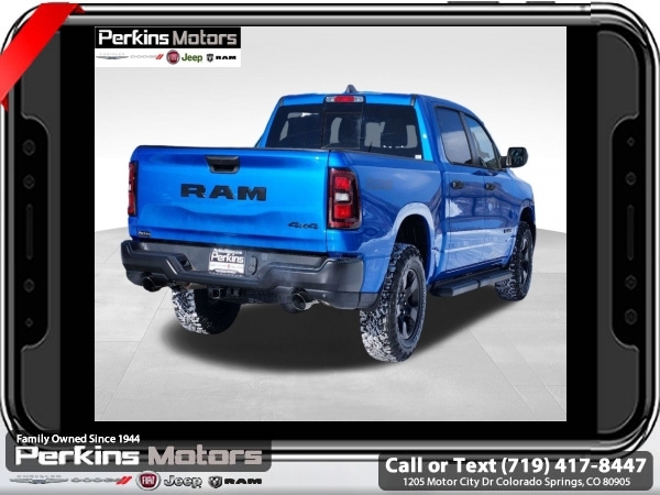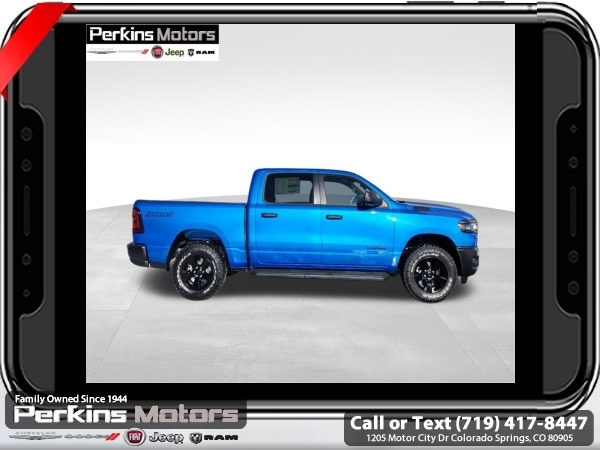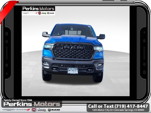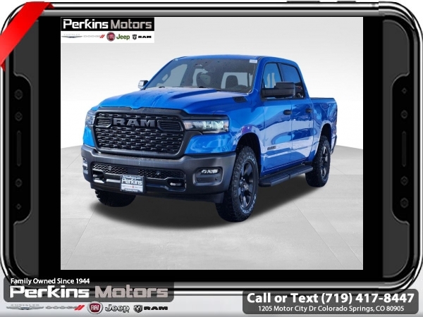 Factory MSRP: $57,390 $12,000 off MSRP! Priced below KBB Fair Purchase Price! Hydro Blue Pearlcoat 2025 Ram 1500 4WD 8-Speed Automatic 3.0L I6<br><br>Check us out at www.perkinsmotors.com to see our specials! Since opening our doors in 1944, we’ve been proud to serve Colorado Springs, CO, and the surrounding areas of Pueblo, Castle Rock and Denver, CO. Throughout this time of being family owned for 80 years, we’ve maintained a firm commitment to our customers: to offer a wide selection of New Chrysler, Dodge, Fiat, Jeep, and Ram vehicles and quality pre-owned vehicles, and provide a quick, no-hassle car-buying process that ensures everyone drives off the lot satisfied with their purchase.<br><br>Quick Order Package 21B Warlock (115V Auxiliary Power Outlet, 400W Inverter, Dual Exhaust w/Black Tips, E-Locker Rear Axle, Front Performance Tuned Shock Absorbers, MOPAR Front & Rear Rubber Floor Mats, Raised Ride Height, Warlock Decal, and Wheels: 18 x 8.0 Black Painted Aluminum), Tradesman Level 1 Equipment Group (2nd Row In Floor Storage Bins, 3 Rear Seat Head Restraints, 4 Way Front Headrests, 40/20/40 Split Bench Seat, Cloth Bench Seat, Front & Rear Floor Mats, Front Center Seat Cushion Storage, Manual Adjust 4-Way Driver Seat, Manual Adjust 4-Way Front Passenger Seat, Rear 60/40 Folding Seat, Rear Power Sliding Window, and SiriusXM Satellite Radio), 3.21 Rear Axle Ratio, 3.92 Rear Axle Ratio, 4-Wheel Disc Brakes, 6 Speakers, ABS brakes, Air Conditioning, AM/FM radio, Apple CarPlay/Android Auto, Auto High-beam Headlights, Black Exterior Mirrors, Brake assist, Compass, Cruise Control, Delay-off headlights, Driver door bin, Dual front impact airbags, Dual front side impact airbags, Electronic Stability Control, Exterior Mirrors w/Heating Element, Front anti-roll bar, Front Center Armrest, Front License Plate Bracket, Front reading lights, Front wheel independent suspension, Fully automatic headlights, Heated door mirrors, Heavy Duty Vinyl 40/20/40 Split Bench Seat, Illuminated entry, Low tire pressure warning, Manual Folding Exterior Mirrors, Manufacturer's Statement of Origin, Mopar Black Tubular Side Steps, Occupant sensing airbag, Outside temperature display, Overhead airbag, Overhead console, Panic alarm, ParkView Rear Back-Up Camera, Passenger door bin, Passenger vanity mirror, Power door mirrors, Power steering, Power windows, Radio data system, Radio: Uconnect 5 W w/8.4 Display, RAM Grille Badge - Black, Rear anti-roll bar, Rear step bumper, Remote keyless entry, Tachometer, Telescoping steering wheel, Tilt steering wheel, Traction control, Variably intermittent wipers, Voltmeter, and Wheels: 18 x 7.5 Steel Painted. Sale price includes all manufacture's incentives and dealer discounts. Sale price not available on lease or compatible with special APR. $1000 - 2025 National Truck Month Bonus Cash . Exp. 04/30/2025 $1500 - 2025 National Bonus Cash . Exp. 04/30/2025 $1500 - 2025 National Conquest Dealer Cash. Exp. 04/30/2025 $4000 - 2025 National Retail Consumer Cash. Exp. 04/30/2025