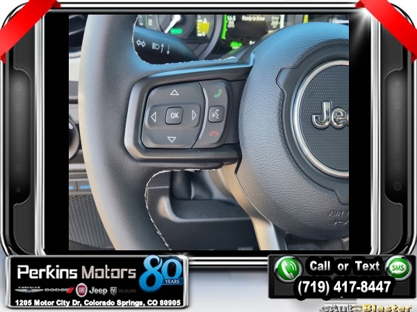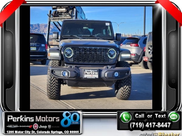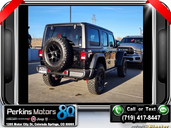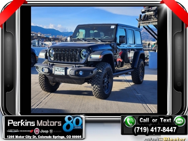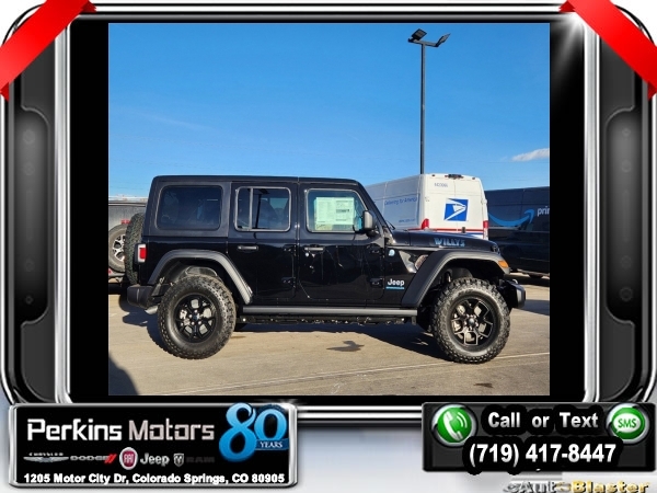 Factory MSRP: $61,910 $10,250 off MSRP! Priced below KBB Fair Purchase Price! Black Clearcoat 2025 Jeep Wrangler Willys 4xe 4WD 8-Speed Automatic 2.0L I4 DOHC<br>2.0L I4 DOHC.<br>Check us out at www.perkinsmotors.com to see our specials! Since opening our doors in 1944, we’ve been proud to serve Colorado Springs, CO, and the surrounding areas of Pueblo, Castle Rock and Denver, CO. Throughout this time of being family owned for 80 years, we’ve maintained a firm commitment to our customers: to offer a wide selection of New Chrysler, Dodge, Fiat, Jeep, and Ram vehicles and quality pre-owned vehicles, and provide a quick, no-hassle car-buying process that ensures everyone drives off the lot satisfied with their purchase.<br><br>Convenience Group (Air Conditioning w/Auto Temperature Control, Air Filtering, Emergency/Assistance Call, Heated Front Seats, and Heated Steering Wheel), Quick Order Package 29W Willys 4xe (4.10 Rear Axle Ratio, Black Grille, Conventional Differential Front Axle, E-Locker Rear Axle, LED Premium Reflector Headlamps, and Willy's Suspension), 2.0L I4 DOHC, 3.73 Rear Axle Ratio, 4-Wheel Disc Brakes, 8 Speakers, ABS brakes, Air Conditioning, Alloy wheels, Apple CarPlay/Android Auto, Black 3-Piece Hard Top, Brake assist, Cloth Low-Back Bucket Seats, Compass, Cruise Control, Delay-off headlights, Driver door bin, Driver vanity mirror, Dual front impact airbags, Dual front side impact airbags, Electronic Stability Control, Freedom Panel Storage Bag, Front anti-roll bar, Front Bucket Seats, Front Center Armrest w/Storage, Front fog lights, Front License Plate Bracket (DISC), Front reading lights, Fully automatic headlights, Heated door mirrors, Illuminated entry, Integrated roll-over protection, Jeep Trail Rated Kit, Low tire pressure warning, Occupant sensing airbag, Outside temperature display, Overhead airbag, Panic alarm, ParkView Rear Back-Up Camera, Passenger door bin, Passenger vanity mirror, Power door mirrors, Power steering, Power windows, Radio data system, Radio: Uconnect 5 w/12.3 Display, Rear anti-roll bar, Rear reading lights, Rear Window Defroster, Rear Window Wiper/Washer, Remote keyless entry, Security system, Split folding rear seat, Sport Suspension, Steering wheel mounted audio controls, Tachometer, Telescoping steering wheel, Tilt steering wheel, Traction control, Trip computer, Variably intermittent wipers, Voltmeter, and Wheels: 20 x 8 Machined/Painted Gray. Sale price includes all manufacture's incentives and dealer discounts. Sale price not available on lease or compatible with special APR. $500 - 2025 National Start Something New Bonus Cash . Exp. 02/03/2025 $6500 - 2025 National Retail Consumer Cash. Exp. 02/03/2025