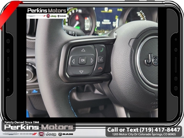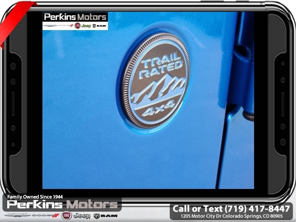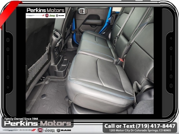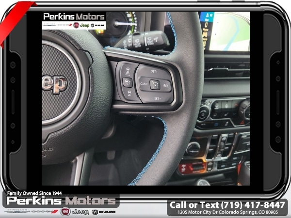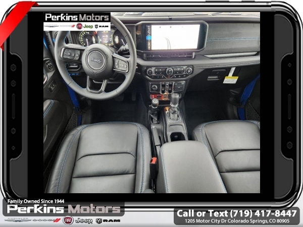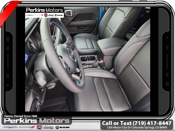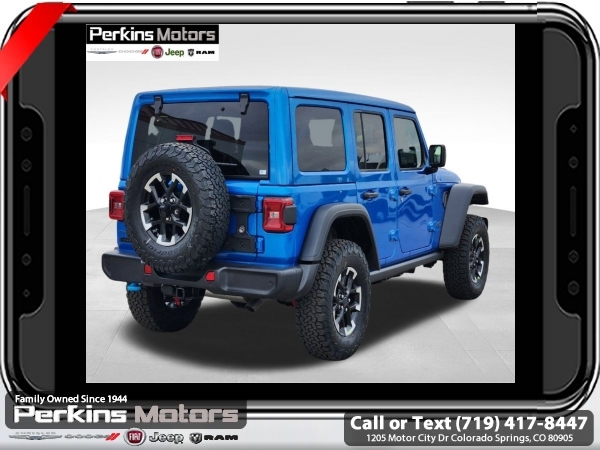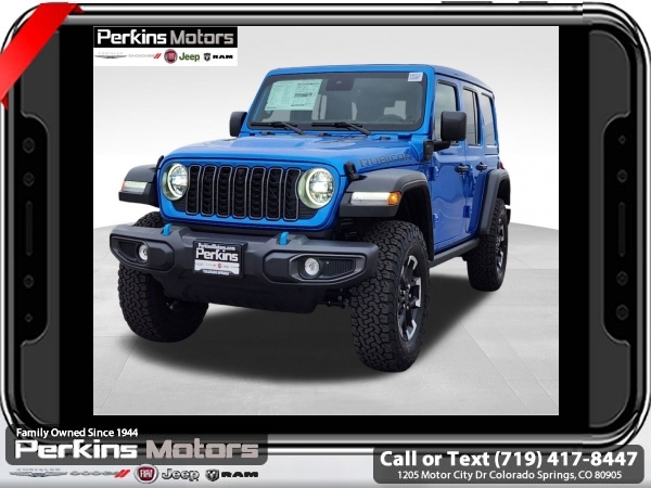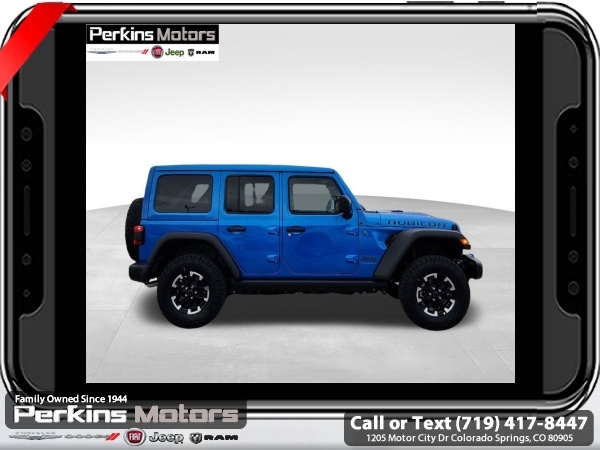 Factory MSRP: $76,195 $14,100 off MSRP! Hydro Blue Pearl Coat 2025 Jeep Wrangler Rubicon 4xe 4WD 8-Speed Automatic 2.0L I4 DOHC<br>2.0L I4 DOHC.<br>Check us out at www.perkinsmotors.com to see our specials! Since opening our doors in 1944, we’ve been proud to serve Colorado Springs, CO, and the surrounding areas of Pueblo, Castle Rock and Denver, CO. Throughout this time of being family owned for 80 years, we’ve maintained a firm commitment to our customers: to offer a wide selection of New Chrysler, Dodge, Fiat, Jeep, and Ram vehicles and quality pre-owned vehicles, and provide a quick, no-hassle car-buying process that ensures everyone drives off the lot satisfied with their purchase.<br><br>Convenience Group (Universal Garage Door Opener), Quick Order Package 29V Rubicon 4xe, Safety Group (Auto High Beam Headlamp Control and ParkSense Rear Park Assist System), Technology Group (4G LTE Wi-Fi Hot Spot, Apple CarPlay, Auto-Dimming Rear-View Mirror, Connectivity - US/Canada, Google Android Auto, HD Radio, Integrated Voice Command w/Bluetooth, Radio: Uconnect 5 Nav w/12.3 Display, and SiriusXM w/360L), 2.0L I4 DOHC, 4-Wheel Disc Brakes, 4.10 Rear Axle Ratio, 7 & 4 Pin Wiring Harness, 8 Speakers, ABS brakes, Air Conditioning, Alloy wheels, Alpine Premium Audio System, AM/FM radio: SiriusXM, Apple CarPlay/Android Auto, Automatic temperature control, Brake assist, Compass, Cruise Control, Delay-off headlights, Driver door bin, Driver vanity mirror, Dual front impact airbags, Dual front side impact airbags, Electronic Stability Control, Emergency communication system: Jeep Connect, Front anti-roll bar, Front Bucket Seats, Front Center Armrest w/Storage, Front dual zone A/C, Front fog lights, Front License Plate Bracket (DISC), Front reading lights, Fully automatic headlights, Heated door mirrors, Illuminated entry, Integrated roll-over protection, Jeep Trail Rated Kit, Low tire pressure warning, MOPAR All-Weather Floor Mats, MOPAR Doors Off Mirror Kit, MOPAR Hinge-Gate Reinforcement, Occupant sensing airbag, Outside temperature display, Overhead airbag, Panic alarm, ParkView Rear Back-Up Camera, Passenger door bin, Passenger vanity mirror, Performance Suspension, Power door mirrors, Power steering, Power windows, Radio data system, Radio: Uconnect 5 w/12.3 Display, Rear anti-roll bar, Rear reading lights, Rear Window Defroster, Rear Window Wiper/Washer, Remote keyless entry, Security system, Sky 1-Touch Power Top, Split folding rear seat, Steering wheel mounted audio controls, Sustainable Premium Cloth Seats, Tachometer, Telescoping steering wheel, Tilt steering wheel, Traction control, Trip computer, Variably intermittent wipers, Voltmeter, and Wheels: 17 x 7.5 Machined w/Black Pockets. Sale price includes all manufacture's incentives and dealer discounts. Sale price not available on lease or compatible with special APR. $500 - 2025 National Jeep Celebration Event Bonus Cash . Exp. 04/30/2025 $6500 - 2025 National Retail Consumer Cash. Exp. 04/30/2025
