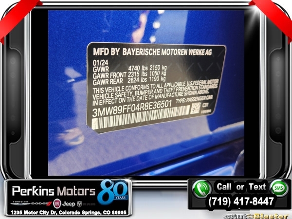 Portimao Blue Metallic AWD 2.0L 4-Cylinder DOHC 16V Turbocharged 8-Speed Automatic Sport<br><br>AWD, Active Blind Spot Detection, Active Driving Assistant, Aerodynamic Kit, Comfort Access Keyless Entry, Connected Package Pro, Convenience Package, Driving Assistance Package, Enhanced USB & Bluetooth Plus Smartphone Integration, Frontal Collision Warning, Increased Top Speed Limiter, Lane Departure Warning System, Lumbar Support, M Sport Package, M Sport Package (337), M Sport Suspension, M Steering Wheel, Navigation, Navigation System, Park Distance Control, Rear Spoiler, Shadowline Exterior Trim, Variable Sport Steering, Wheels: 19 x 8 Fr & 19 x 8.5 Rr M Double-Spoke, Wireless Device Charging, Without Lines Designation Outside.<br><br><br>CARFAX One-Owner. Clean CARFAX.<br><br>Check us out at www.perkinsmotors.com to see our specials! Since opening our doors in 1944, we’ve been proud to serve Colorado Springs, CO, and the surrounding areas of Pueblo, Castle Rock and Denver, CO. Throughout this time of being family owned for 80 years, we’ve maintained a firm commitment to our customers: to offer a wide selection of New Chrysler, Dodge, Fiat, Jeep, and Ram vehicles and quality pre-owned vehicles, and provide a quick, no-hassle car-buying process that ensures everyone drives off the lot satisfied with their purchase.<br><br><br>Connected Package Pro, Convenience Package (Comfort Access Keyless Entry, Enhanced USB & Bluetooth Plus Smartphone Integration, Lumbar Support, and Wireless Device Charging), Driving Assistance Package (Active Blind Spot Detection, Active Driving Assistant, Frontal Collision Warning, Lane Departure Warning System, and Park Distance Control), M Sport Package (Aerodynamic Kit, Increased Top Speed Limiter, M Sport Suspension, M Steering Wheel, Rear Spoiler, Shadowline Exterior Trim, Variable Sport Steering, Wheels: 19 x 8 Fr & 19 x 8.5 Rr M Double-Spoke, and Without Lines Designation Outside), M Sport Package (337), AWD, Navigation, Navigation System, 10 Speakers, 4-Wheel Disc Brakes, ABS brakes, Air Conditioning, Alloy wheels, AM/FM radio: SiriusXM, Apple CarPlay & Android Auto Compatibility, Apple CarPlay Compatibility, Auto High-beam Headlights, Auto-dimming door mirrors, Auto-dimming Rear-View mirror, Automatic temperature control, BMW Assist eCall, BMW TeleServices, Brake assist, Bumpers: body-color, Compass, ConnectedDrive Services, Cruise Control, Delay-off headlights, Driver door bin, Driver vanity mirror, Dual front impact airbags, Dual front side impact airbags, Electronic Stability Control, Emergency communication system: BMW Assist eCall, Extended Shadowline Trim, Exterior Parking Camera Rear, Four wheel independent suspension, Front anti-roll bar, Front Bucket Seats, Front Center Armrest, Front dual zone A/C, Front reading lights, Fully automatic headlights, Garage door transmitter, Genuine wood console insert, Genuine wood dashboard insert, Heated door mirrors, Heated Front Seats, Heated Steering Wheel, Hi-Fi Sound System, Illuminated entry, Knee airbag, Leather Shift Knob, Leather steering wheel, Low tire pressure warning, Memory seat, Occupant sensing airbag, Outside temperature display, Overhead airbag, Panic alarm, Passenger door bin, Passenger vanity mirror, Perforated Sensatec Upholstery, Power door mirrors, Power driver seat, Power Front Seats, Power moonroof, Power passenger seat, Power steering, Power Tailgate, Power windows, Radio data system, Radio: AM/FM Audio System, Rain sensing wipers, Rear air conditioning, Rear anti-roll bar, Rear reading lights, Rear seat center armrest, Rear window defroster, Remote keyless entry, Security system, SiriusXM w/360L & 1 Year Platinum Plan Subscription, Speed-sensing steering, Speed-Sensitive Wipers, Split folding rear seat, Sport Seats, Sport steering wheel, Steering wheel mounted audio controls, Tachometer, Telescoping steering wheel, Tilt steering wheel, Traction control, Trip computer, Turn signal indicator mirrors, Variably interm