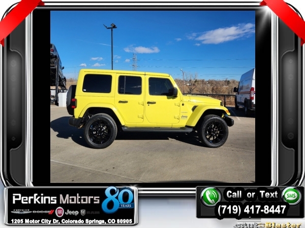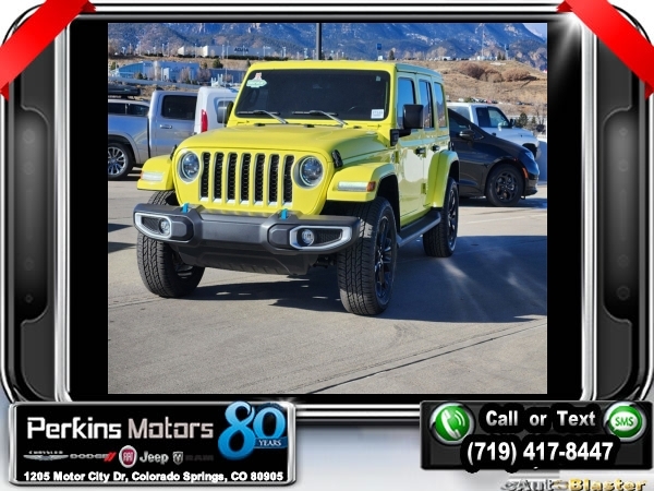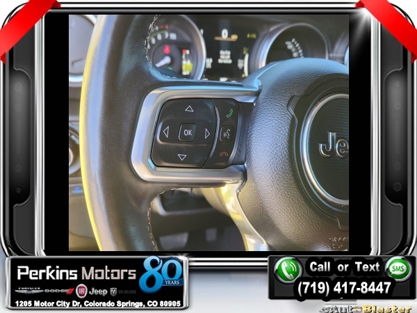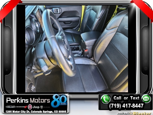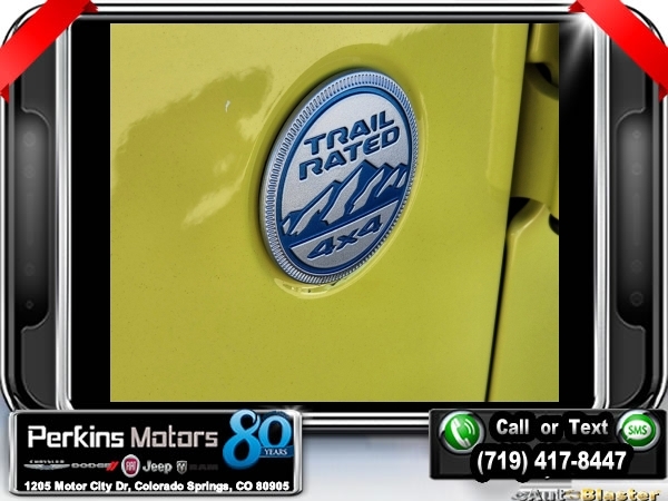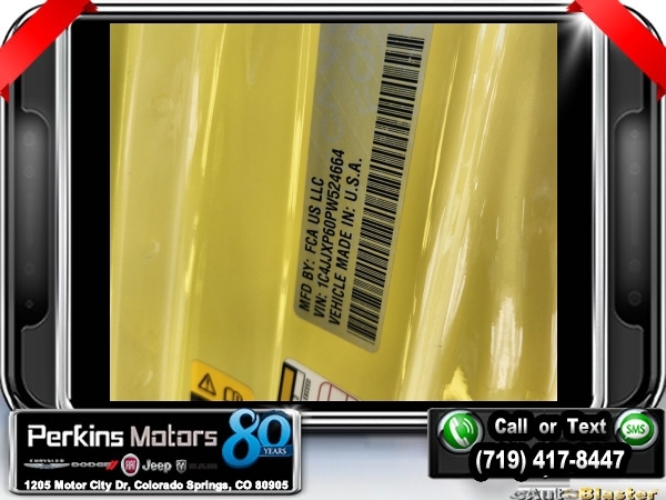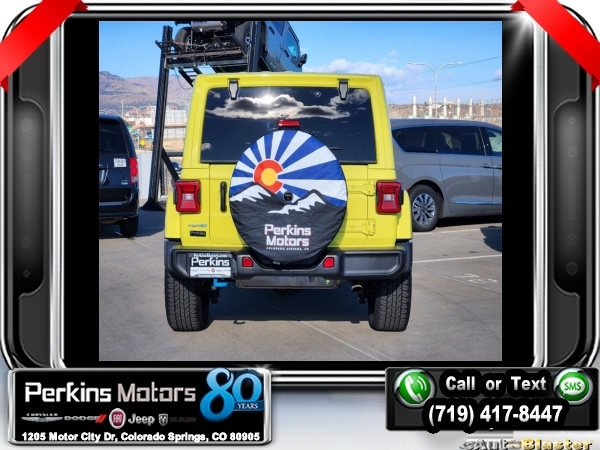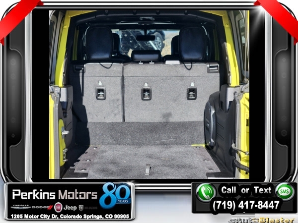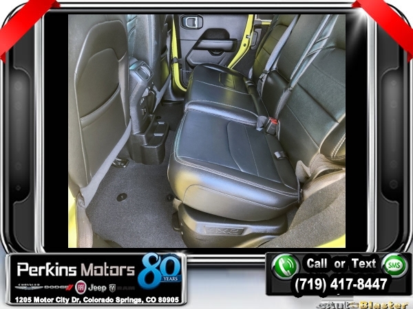 High Velocity Clearcoat 4WD 2.0L I4 DOHC 8-Speed Automatic<br><br>2.0L I4 DOHC.<br><br>Certified. FCA US LLC Certified Pre-Owned Details:<br><br> * Transferable Warranty<br> * Powertrain Limited Warranty: 84 Month/100,000 Mile (whichever comes first) from original in-service date<br> * Vehicle History<br> * 125 Point Inspection<br> * Includes First Day Rental, Car Rental Allowance, and Trip Interruption Benefits. SiriusXM 3 month trial subscription<br> * Warranty Deductible: $100<br> * Roadside Assistance<br> * Limited Warranty: 3 Month/3,000 Mile (whichever comes first) after new car warranty expires or from certified purchase date<br><br><br>CARFAX One-Owner. Clean CARFAX.<br><br>Check us out at www.perkinsmotors.com to see our specials! Since opening our doors in 1944, we’ve been proud to serve Colorado Springs, CO, and the surrounding areas of Pueblo, Castle Rock and Denver, CO. Throughout this time of being family owned for 80 years, we’ve maintained a firm commitment to our customers: to offer a wide selection of New Chrysler, Dodge, Fiat, Jeep, and Ram vehicles and quality pre-owned vehicles, and provide a quick, no-hassle car-buying process that ensures everyone drives off the lot satisfied with their purchase.<br><br><br>Cold Weather Group (Heated Steering Wheel and Remote Start System), MOPAR Grab Handle Kit (Front MOPAR Grab Handles and Rear MOPAR Grab Handles), Quick Order Package 29P Sahara, FCA US LLC Certified Pre-Owned Certified, 2.0L I4 DOHC, 3.73 Rear Axle Ratio, 4-Wheel Disc Brakes, 9 Speakers, ABS brakes, Air Conditioning, Alloy wheels, AM/FM radio: SiriusXM, Apple CarPlay/Android Auto, Auto-dimming Rear-View mirror, Automatic temperature control, Body Color 3-Piece Hard Top, Brake assist, Compass, Cruise Control, Delay-off headlights, Driver door bin, Driver vanity mirror, Dual front impact airbags, Dual front side impact airbags, Electronic Stability Control, Emergency communication system: SiriusXM Guardian, Front anti-roll bar, Front Bucket Seats, Front Center Armrest w/Storage, Front dual zone A/C, Front fog lights, Front License Plate Bracket, Front reading lights, Fully automatic headlights, Garage door transmitter, Heated door mirrors, Illuminated entry, Integrated roll-over protection, Jeep Trail Rated Kit, Leather Shift Knob, Low tire pressure warning, MOPAR Hardtop Headliner, Navigation System, Occupant sensing airbag, Outside temperature display, Panic alarm, ParkView Rear Back-Up Camera, Passenger door bin, Passenger vanity mirror, Power door mirrors, Power steering, Power windows, Premium McKinley Trimmed Seats, Radio data system, Radio: Uconnect 4C Nav w/8.4 Display, Rear anti-roll bar, Rear reading lights, Rear seat center armrest, Rear Window Wiper/Washer, Remote keyless entry, Security system, Side Steps, Split folding rear seat, Sport Suspension, Steering wheel mounted audio controls, Tachometer, Telescoping steering wheel, Tilt steering wheel, Traction control, Trip computer, Variably intermittent wipers, Voltmeter, and Wheels: 20 x 8 Fully Painted Aluminum.