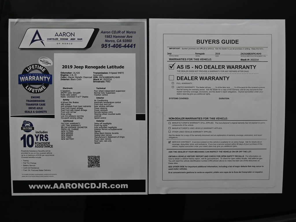 Priced below KBB Fair Purchase Price!LIFE TIME WARRANTY, BELOW AVERAGE ODOMETER, FRESH OIL CHANGE, NEW FILTERS, NEW WIPERS, Renegade Latitude, 4D Sport Utility, 2.4L I4, 9-Speed 948TE Automatic, FWD, 115V Auxiliary Power Outlet, 40/20/40 Rear Seat w/Trunk Pass-Thru, Alloy wheels, Altitude Package, Auto-Dimming Rear-View Mirror, Black Accent Stitching, Deluxe Cloth High-Back Bucket Seats, Exterior Mirrors w/Supplemental Signals, Front dual zone A/C, Front fog lights, Gloss Black Exterior Accents, Knee airbag, Leather Wrapped Steering Wheel, Low tire pressure warning, Manual Adjust 4-Way Front Passenger Seat, Overhead airbag, Popular Equipment Group, Power 4-Way Driver Lumbar Adjust, Power Adjust 8-Way Driver Seat, Quick Order Package 2XM, Radio: Uconnect 4 w/7" Display, Vinyl Door Trim Panel, Wheels: 17" x 7" Gloss Black.Clean CARFAX.CARFAX One-Owner.