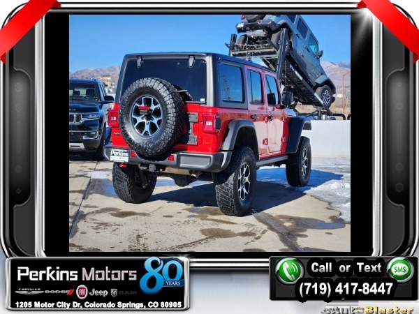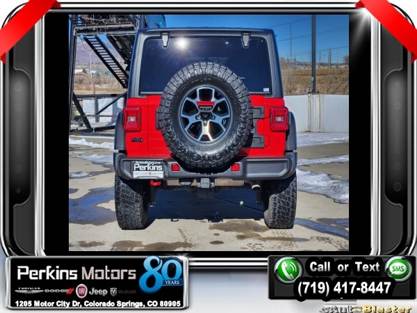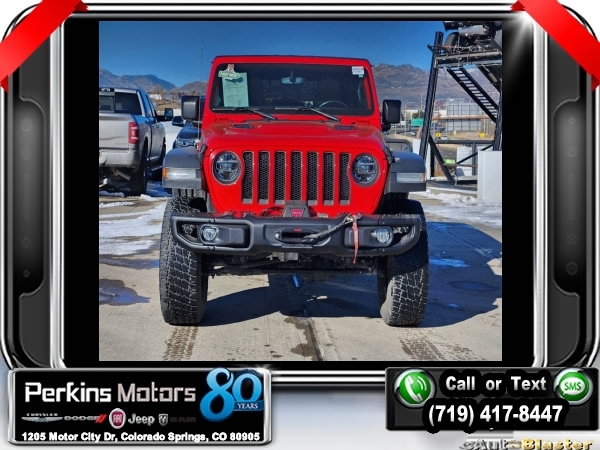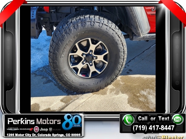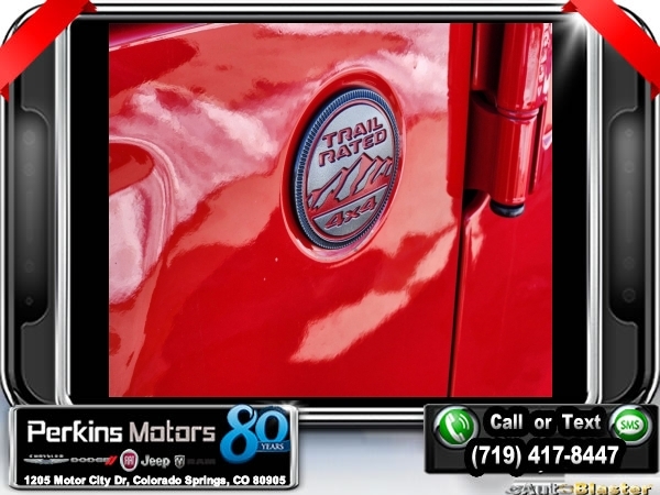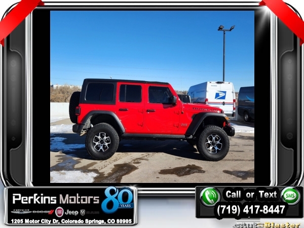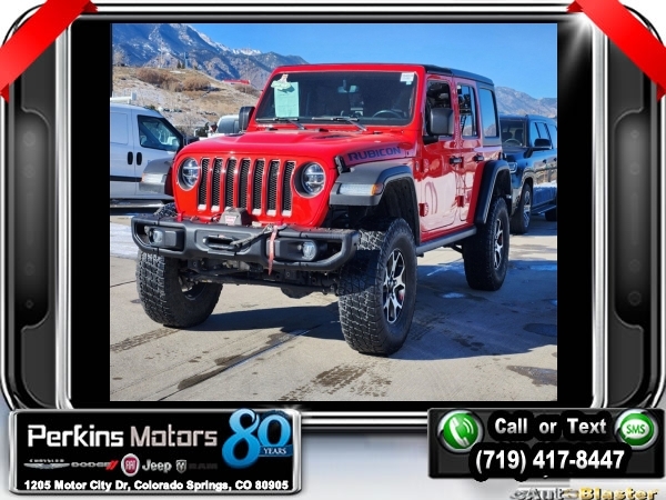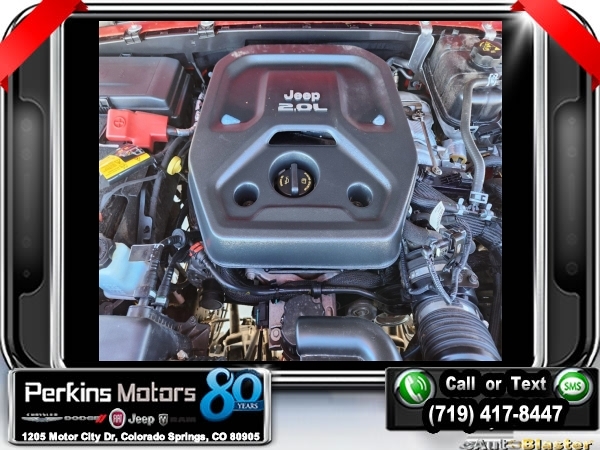 Firecracker Red Clearcoat 4WD 2.0L I4 DOHC 8-Speed Automatic<br><br>1-Year SiriusXM Guardian Trial, 240 Amp Alternator, 4G LTE Wi-Fi Hot Spot, 5-Year SiriusXM Traffic Service, 5-Year SiriusXM Travel Link Service, 7 & 4 Pin Wiring Harness, 700 Amp Maintenance Free Battery, 8.4 Radio & Premium Audio Group, 8.4 Touchscreen Display, Alpine Premium Audio System, Auto-Dimming Rear-View Mirror, Auxiliary Switches, Class II Receiver Hitch, Cold Weather Group, Daytime Running Lamps LED Accents, Emergency/Assistance Call, For Details, Visit DriveUconnect.com, Front LED Fog Lamps, GPS Navigation, HD Radio, Heated Front Seats, Heated Steering Wheel, LED Lighting Group, LED Premium Reflector Headlamps, LED Taillamps, Off-Road Info Pages, Quick Order Package 22R, Radio: Uconnect 4C Nav w/8.4 Display, SiriusXM Traffic Plus, SiriusXM Travel Link, Trailer Tow & HD Electrical Group.<br><br><br>Check us out at www.perkinsmotors.com to see our specials! Since opening our doors in 1944, we’ve been proud to serve Colorado Springs, CO, and the surrounding areas of Pueblo, Castle Rock and Denver, CO. Throughout this time of being family owned for 80 years, we’ve maintained a firm commitment to our customers: to offer a wide selection of New Chrysler, Dodge, Fiat, Jeep, and Ram vehicles and quality pre-owned vehicles, and provide a quick, no-hassle car-buying process that ensures everyone drives off the lot satisfied with their purchase.<br><br><br>8.4 Radio & Premium Audio Group (1-Year SiriusXM Guardian Trial, 4G LTE Wi-Fi Hot Spot, 5-Year SiriusXM Traffic Service, 5-Year SiriusXM Travel Link Service, 8.4 Touchscreen Display, Alpine Premium Audio System, Auto-Dimming Rear-View Mirror, Emergency/Assistance Call, For Details, Visit DriveUconnect.com, GPS Navigation, HD Radio, Off-Road Info Pages, Radio: Uconnect 4C Nav w/8.4 Display, SiriusXM Traffic Plus, and SiriusXM Travel Link), Cold Weather Group (Heated Front Seats and Heated Steering Wheel), LED Lighting Group (Daytime Running Lamps LED Accents, Front LED Fog Lamps, LED Premium Reflector Headlamps, and LED Taillamps), Quick Order Package 22R, Trailer Tow & HD Electrical Group (240 Amp Alternator, 7 & 4 Pin Wiring Harness, 700 Amp Maintenance Free Battery, Auxiliary Switches, and Class II Receiver Hitch), 4-Wheel Disc Brakes, 4.10 Rear Axle Ratio, 8 Speakers, ABS brakes, Air Conditioning, Alloy wheels, AM/FM radio: SiriusXM, Apple CarPlay/Android Auto, Automatic temperature control, Aux Battery, Black 3-Piece Hard Top, Brake assist, Compass, Cruise Control, Delay-off headlights, Driver door bin, Driver vanity mirror, Dual front impact airbags, Dual front side impact airbags, Electronic Stability Control, Freedom Panel Storage Bag, Front anti-roll bar, Front Bucket Seats, Front Center Armrest w/Storage, Front dual zone A/C, Front fog lights, Front License Plate Bracket, Front reading lights, Fully automatic headlights, Garage door transmitter, Heated door mirrors, Illuminated entry, Integrated roll-over protection, Leather steering wheel, Low tire pressure warning, MOPAR Hardtop Headliner, No Soft Top, Non-Lock Fuel Cap w/o Discriminator, Occupant sensing airbag, Outside temperature display, Panic alarm, ParkView Rear Back-Up Camera, Passenger door bin, Passenger vanity mirror, Performance Suspension, Power door mirrors, Power steering, Power windows, Premium Cloth Low-Back Bucket Seats, Radio data system, Radio: Uconnect 4 w/7 Display, Rear anti-roll bar, Rear reading lights, Rear Window Defroster, Rear Window Wiper/Washer, Remote keyless entry, Remote Proximity Keyless Entry, Remote Start System, Security system, Split folding rear seat, Steering wheel mounted audio controls, Stop-Start Dual Battery System, Tachometer, Telescoping steering wheel, Tilt steering wheel, Traction control, Trip computer, Variably intermittent wipers, Voltmeter, and Wheels: 17 x 7.5 Machined w/Black PocketS.