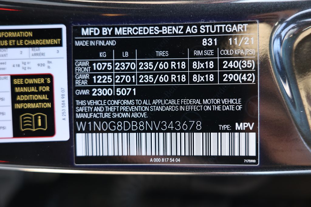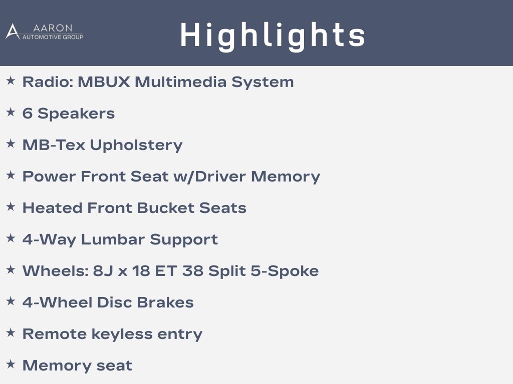 Priced below KBB Fair Purchase Price!10.25" Center Touchscreen Display, 4-Way Lumbar Support, 4-Wheel Disc Brakes, 6 Speakers, Air Conditioning, Apple CarPlay®/Android Auto®, Auto High-beam Headlights, Brake assist, Electronic Stability Control, Exterior Parking Camera Rear, Front dual zone A/C, Fully automatic headlights, Garage door transmitter: HomeLink, Heated Front Bucket Seats, MB-Tex Upholstery, Memory seat, Power Front Seat w/Driver Memory, Power Liftgate, Radio: MBUX Multimedia System, Rain sensing wipers, Rear fog lights, Remote keyless entry, Speed control, Wheels: 8J x 18 ET 38 Split 5-Spoke.Odometer is 10030 miles below market average!22/27 City/Highway MPGCARFAX One-Owner.To see more quality vehicles like this one right just click on AaronFordofPoway.com or dial (858) 748-1400.