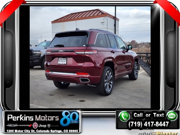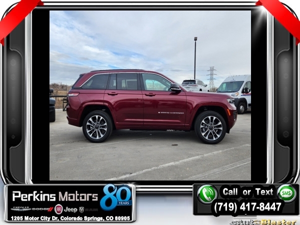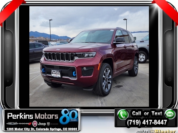 Factory MSRP: $82,515 $11,000 off MSRP! Priced below KBB Fair Purchase Price! Velvet Red Pearlcoat 2025 Jeep Grand Cherokee Overland 4xe 4WD 8-Speed Automatic 2.0L I4 DOHC<br>2.0L I4 DOHC, 4WD.<br>Check us out at www.perkinsmotors.com to see our specials! Since opening our doors in 1944, we’ve been proud to serve Colorado Springs, CO, and the surrounding areas of Pueblo, Castle Rock and Denver, CO. Throughout this time of being family owned for 80 years, we’ve maintained a firm commitment to our customers: to offer a wide selection of New Chrysler, Dodge, Fiat, Jeep, and Ram vehicles and quality pre-owned vehicles, and provide a quick, no-hassle car-buying process that ensures everyone drives off the lot satisfied with their purchase.<br><br>Advanced Protech Group III (Active Driving Assist System, Heads-Up Display, Integrated Off-Road Camera, Intersection Collision Assist System, Leather Wrapped Steering Wheel, Map-In-Cluster Display, Night Vision/Pedestrian-Animal Detection, Rear Back Up Camera Washer, Surround View Camera System, and Windshield Wiper De-Icer), Luxury Tech Group IV (2nd-Row Manual Window Shades, Driver Power Seat Back Massage, Front Passenger Power Seat Back Massage, Nappa Leather Seats (TL), Passenger Seat Memory, Power Adjust 12-Way Driver Seat, Power Adjust 12-Way Front Passenger Seat, Rearview Autodim Digital Display Mirror, and Wireless Charging Pad), Quick Order Package 27P, Trailer Tow Package (7 & 4 Pin Wiring Harness and Class IV Receiver Hitch), 2.0L I4 DOHC, 4WD, 19 Speakers, 3.70 Rear Axle Ratio, 4-Wheel Disc Brakes, ABS brakes, Adaptive suspension, Air Conditioning, Alloy wheels, AM/FM radio: SiriusXM with 360L, Anti-whiplash front head restraints, Audio memory, Auto High-beam Headlights, Auto-dimming door mirrors, Auto-dimming Rear-View mirror, Auto-leveling suspension, Automatic temperature control, Brake assist, Bumpers: body-color, Compass, Cruise Control, Delay-off headlights, Driver door bin, Driver vanity mirror, Dual front impact airbags, Dual front side impact airbags, Electronic Stability Control, Four wheel independent suspension, Front anti-roll bar, Front Bucket Seats, Front Center Armrest w/Storage, Front dual zone A/C, Front fog lights, Front License Plate Bracket, Front reading lights, Fully automatic headlights, Garage door transmitter, Heated door mirrors, Heated front seats, Heated rear seats, Heated steering wheel, Heavy Duty Suspension, Illuminated entry, Knee airbag, Low tire pressure warning, Memory seat, Model Year Tracking, Nappa Leather Seats, Navigation System, Occupant sensing airbag, Outside temperature display, Overhead airbag, Overhead console, Panic alarm, Passenger door bin, Passenger vanity mirror, Power door mirrors, Power driver seat, Power Liftgate, Power moonroof, Power passenger seat, Power steering, Power windows, Radio data system, Radio: Uconnect 5 Nav w/10.1 Display, Rain sensing wipers, Rear anti-roll bar, Rear reading lights, Rear seat center armrest, Rear window defroster, Rear window wiper, Remote keyless entry, Security system, Speed-Sensitive Wipers, Split folding rear seat, Spoiler, Steering wheel memory, Steering wheel mounted audio controls, Tachometer, Telescoping steering wheel, Tilt steering wheel, Traction control, Trip computer, Turn signal indicator mirrors, Variably intermittent wipers, Ventilated front seats, Voltmeter, and Wheels: 20 x 8.5 Machined Face Aluminum. Sale price includes all manufacture's incentives and dealer discounts. Sale price not available on lease or compatible with special APR. $500 - 2025 National Start Something New Bonus Cash . Exp. 02/03/2025 $6500 - 2025 National Retail Consumer Cash. Exp. 02/03/2025