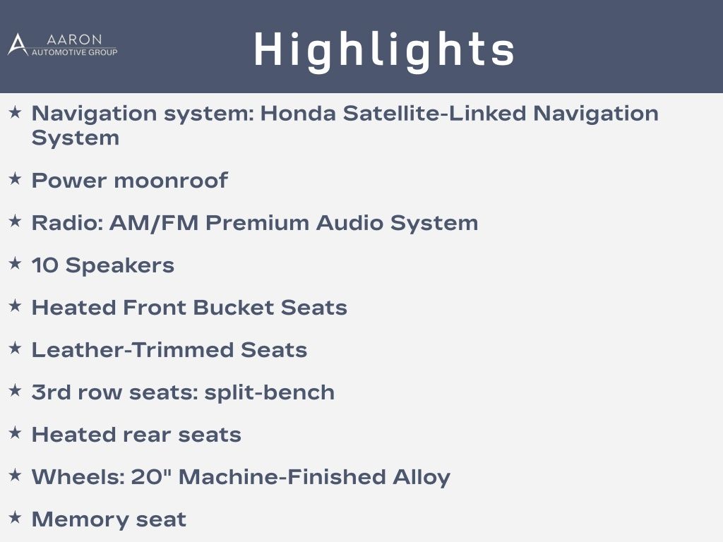Priced below KBB Fair Purchase Price!AWD, 10 Speakers, 3rd row seats: split-bench, Air Conditioning, Apple CarPlay/Android Auto, Blind Spot Information (BSI) System warning, Brake assist, Electronic Stability Control, Exterior Parking Camera Rear, Forward collision: Collision Mitigation Braking System (CMBS) + FCW mitigation, Front dual zone A/C, Front fog lights, Fully automatic headlights, Heated Front Bucket Seats, Heated rear seats, Lane departure: Lane Keeping Assist System (LKAS) active, Leather-Trimmed Seats, Memory seat, Navigation system: Honda Satellite-Linked Navigation System, Panic alarm, Power Liftgate, Power moonroof, Radio: AM/FM Premium Audio System, Rear air conditioning, Remote keyless entry, Roof rack: rails only, Security system, Speed control, Spoiler, Wheels: 20" Machine-Finished Alloy.19/26 City/Highway MPGCARFAX One-Owner.To see more quality vehicles like this one right just click on AaronFordofPoway.com or dial (858) 748-1400.Awards: * ALG Residual Value Awards, Residual Value Awards