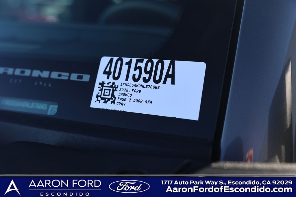 Carbonized Gray Metallic 2022 Ford Bronco 4WD 10-Speed Automatic 2.3L EcoBoost I-4 6 Speakers, Air Conditioning, AM/FM radio: SiriusXM with 360L, Brake assist, Console Lock Box Safe Deposit (DIO), Convertible HardTop, Electronic Stability Control, Equipment Group 101A Standard Package, Exterior Parking Camera Rear, Ford Performance Heavy-Duty Modular Front Bumper, Front Bucket Seats, Fully automatic headlights, Speed control, Wheels: 16" Bright Polished Silver-Painted Steel.Awards: * NACTOY 2022 North American Utility of the Year