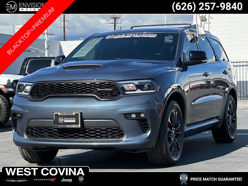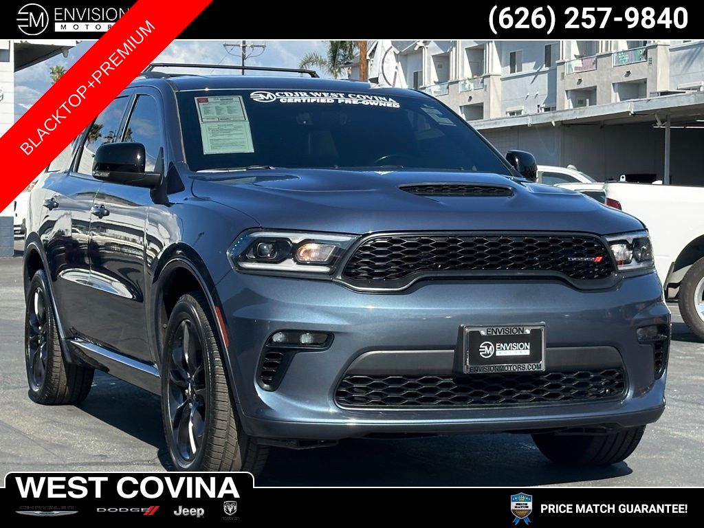 WE SPECIALIZE IN ALL CREDIT PROFILES! See what we can do for you! Call to find out (626) 899-9302.Certified. CARFAX One-Owner. Clean CARFAX.Odometer is 2282 miles below market average! 19/26 City/Highway MPG 1-Year Trial (Registration Required), 10.1" Touchscreen Display, 115V Auxiliary Power Outlet, 180 Amp Alternator, 4G LTE Wi-Fi Hot Spot, 506 Watt Amplifier, 9 Alpine Amplified Speakers w/Subwoofer, Apple CarPlay, Black Roof Rails, Blacktop Package, Connected Travel & Traffic Services, Disassociated Touchscreen Display, Dual Remote USB Port - Charge Only, Exterior Mirrors w/Memory, Exterior Mirrors w/Supplemental Signals, For Details Visit DriveUconnect.com, Global Telematics Box Module (TBM), Gloss Black Badges, Gloss Black Exterior Mirrors, Google Android Auto, GPS Antenna Input, GPS Navigation, GT Gloss Black Badging, HD Radio, Heated Front Seats, Heated Second Row Seats, Heated Steering Wheel, Integrated Center Stack Radio, Integrated Roof Rail Crossbars, Integrated Voice Command w/Bluetooth, Leather Suede Bucket Seats, Power 6x9 Multi-Function Foldaway Mirrors, Power 8-Way Driver Memory 6-Way Passenger Seats, Power Driver/Passenger 4-Way Lumbar Adjust, Power Liftgate, Power Sunroof, Premium Group I, Quick Order Package 2BE GT Plus, Radio: Uconnect 5 Nav w/10.1" Display, Radio/Driver Seat/Mirrors Memory, Remote Start System, Satin Black Dodge Tail Lamp Badge, Security Alarm, SiriusXM Guardian - Included Trial (B), SiriusXM Satellite Radio, SiriusXM w/360L, Sun Visors w/Illuminated Vanity Mirrors, Tungsten Accent Stitching, Universal Garage Door Opener, USB Host Flip, Wheels: 20" x 8.0" Black Noise Aluminum.Reactor Blue Pearlcoat2021 Dodge Durango GT Plus RWD 8-Speed Automatic 3.6L V6 24V VVTFCA US LLC Certified Pre-Owned Details: * Warranty Deductible: $100 * 125 Point Inspection * Transferable Warranty * Vehicle History * Limited Warranty: 3 Month/3,000 Mile (whichever comes first) after new car warranty expires or from certified purchase date * Includes First Day Rental, Car Rental Allowance, and Trip Interruption Benefits. SiriusXM 3 month trial subscription. * Powertrain Limited Warranty: 84 Month/100,000 Mile (whichever comes first) from original in-service date * Roadside Assistance**********All Pricing and Advertised Prices for any/all vehicles offered for sale does not include dealer installed accessories which can be purchased for an additional cost.********** The Factory Rebates may not be available on this vehicle if you elect to take advantage of a Special Alternative APR or Special Lease program. Some Factory Rebates are California Resident specific and may vary for residents of other states. NO sales to Dealers, Brokers or Exporters. For out of state purchase, customers must be present to purchase. If shipping is required, dealership must facilitate; no exceptions. Please contact us for special Multi-Vehicle or Fleet pricing. Prices are plus government fees and taxes, any finance charges, $85 documentary fee, $29 electronic registration fee, any emission testing charge and $1.75 per new tire state tire fee. *** We make every effort to provide accurate information, but please verify before purchasing. Leasing & financing available on approved credit. Trade-ins accepted. Subject to prior sale.