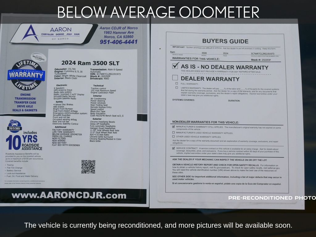Priced below KBB Fair Purchase Price!FACTORY WARRANTY, BELOW AVERAGE ODOMETER, FRESH OIL CHANGE, NEW FILTERS, NEW WIPERS, NEW BATTERY, FLAT BED WITH GOOSENEK, 3500 SLT CREW CAB 60"C/A 4X4 FLAT BED, 4D Crew Cab, Cummins 6.7L I6 Turbodiesel, Aisin 6-Speed Automatic, 4WD, 12.0" Dual Wheel Rear Axle, 2 Way Rear Headrest Seat, 4 Way Front Headrests, 40/20/40 Split Bench Seat, Acoustic Front Door Glass, Add 4.10 Axle Ratio, Black-Out Tape, Body Insulation, Bright Front Bumper, Center Hub, Chrome Grille Surround, Chrome Headlamp Bezels, Chrome Nostrils/Molded in Color Black Grille, Cloth 40/20/40 Bench Seat w/2_G, Compass, Door Sill Scuff Pads, Floor Covering Carpet, Front & Rear Floor Mats, Front Armrest w/Cupholders, Glove Box, GPS Antenna Input, Halogen Quad Headlamps, Manual Adjust 4-Way Driver Seat, Manual Adjust 4-Way Front Passenger Seat, Map/Courtesy Lamp, Max Tow Package, Overhead Console, Overhead Cupholder Lamp, Painted I/P Bezels w/Hydrographics, Passenger Sun Visor w/Illuminated Mirror, Premium Vinyl Door Trim w/Map Pocket, Quick Order Package 2YG SLT, Radio: Uconnect 3 w/5" Display, RAM Door Badges, Rear Dome Lamp, Rear Folding Seat, Remote Keyless Entry, Remote USB Port - Charge Only, Satin Chrome Key Fob, SLT Badge, Storage Tray, Tinted Acoustic Windshield Glass, Tow Hooks, Traveler/Mini Trip Computer, Wheels: 18" x 8" Steel Chrome Clad.For help with any Vehicle needs please call us directly at 951-621-1288.Clean CARFAX.CARFAX One-Owner.