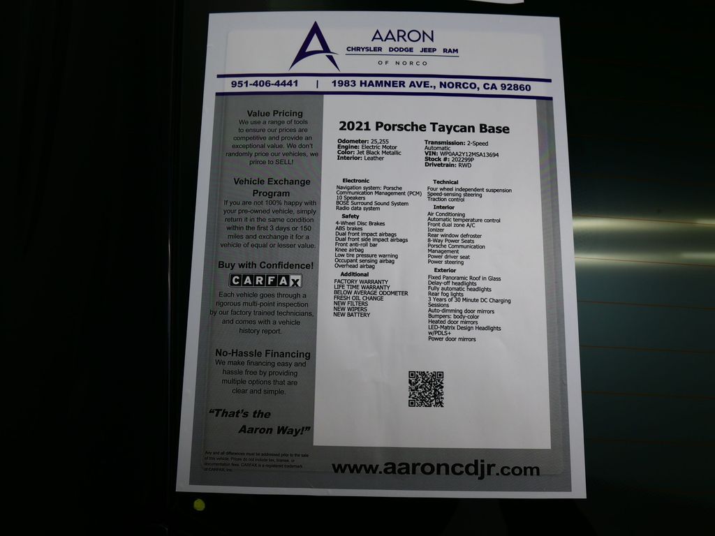 BELOW AVERAGE ODOMETER, NEW FILTERS, NEW WIPERS, NEW BATTERY, 14-Way Power Seats w/Memory Package, Alloy wheels, Ambient Lighting, Apple CarPlay, BOSE Surround Sound System, Compass, Fixed Panoramic Roof in Glass, Front dual zone A/C, Front Seat Ventilation, Ionizer, Knee airbag, Lane Change Assist (LCA), LED-Matrix Design Headlights w/PDLS+, Low tire pressure warning, Navigation system: Porsche Communication Management (PCM), Premium Package, Rear fog lights, Storage Package, Surround View, Wheels: 19" Taycan Aero.CARFAX One-Owner.