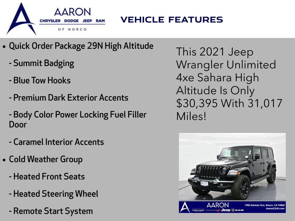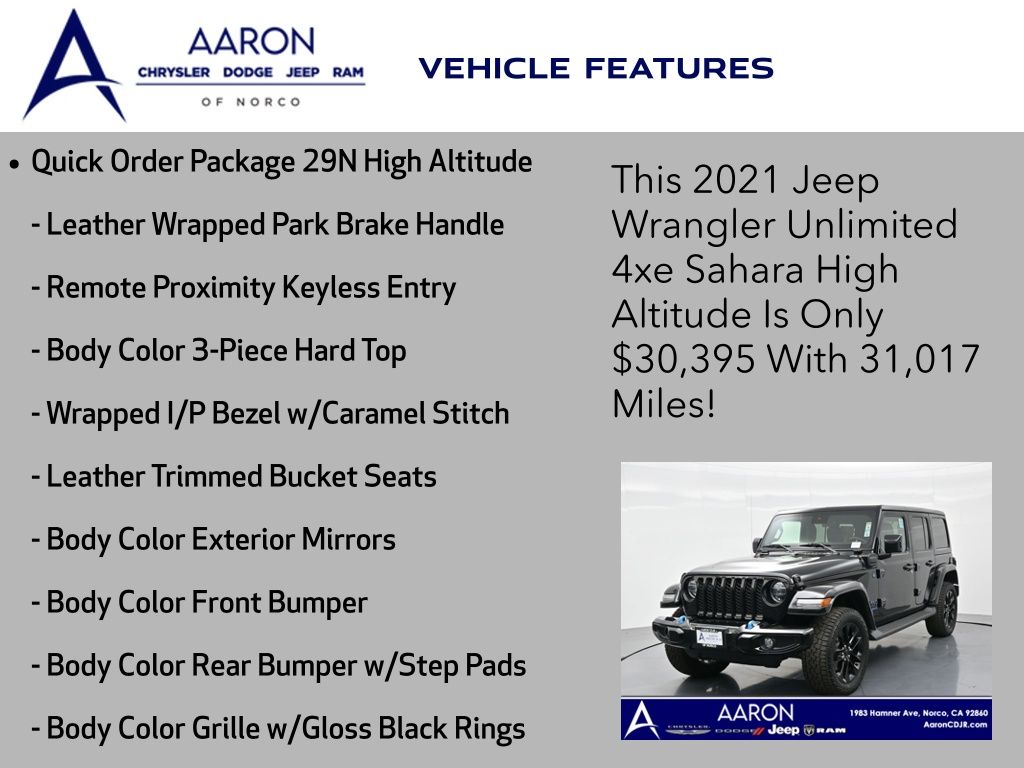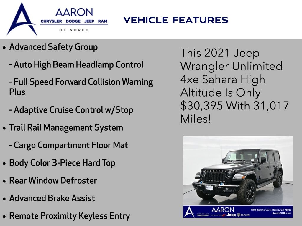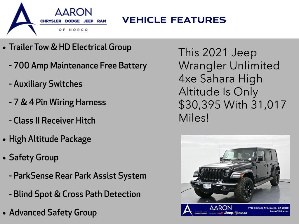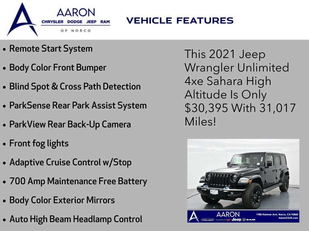 Priced below KBB Fair Purchase Price!LIFE TIME WARRANTY, BELOW AVERAGE ODOMETER, FRESH OIL CHANGE, NEW FILTERS, NEW WIPERS, NEW BATTERY, Wrangler Unlimited Sahara High Altitude 4xe, 4D Sport Utility, 2.0L I4 DOHC, 8-Speed Automatic, 4WD, 7 & 4 Pin Wiring Harness, 700 Amp Maintenance Free Battery, Adaptive Cruise Control w/Stop, Advanced Brake Assist, Advanced Safety Group, Alloy wheels, Apple CarPlay/Android Auto, Auto High Beam Headlamp Control, Auxiliary Switches, Blind Spot & Cross Path Detection, Blue Tow Hooks, Body Color 3-Piece Hard Top, Body Color Door Handles, Body Color Exterior Mirrors, Body Color Front Bumper, Body Color Grille w/Gloss Black Rings, Body Color Power Locking Fuel Filler Door, Body Color Rear Bumper w/Step Pads, Caramel Interior Accents, Cargo Compartment Floor Mat, Class II Receiver Hitch, Cold Weather Group, Freedom Panel Storage Bag, Front fog lights, Full Speed Forward Collision Warning Plus, Heated Front Seats, Heated Steering Wheel, High Altitude Package, Leather Trimmed Bucket Seats, Leather Wrapped Park Brake Handle, Navigation System, ParkSense Rear Park Assist System, ParkView Rear Back-Up Camera, Premium Dark Exterior Accents, Quick Order Package 29N High Altitude, Rear Window Defroster, Rear Window Wiper/Washer, Remote Proximity Keyless Entry, Remote Start System, Safety Group, Summit Badging, Trail Rail Management System, Trailer Tow & HD Electrical Group, Wheels: 20" x 8" Fully Painted Aluminum, Wrapped I/P Bezel w/Caramel Stitch.Clean CARFAX.CARFAX One-Owner.