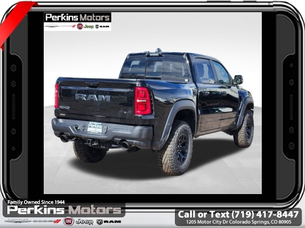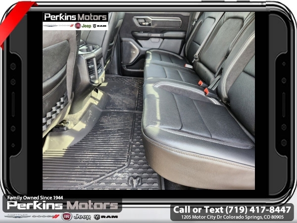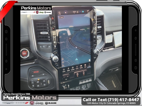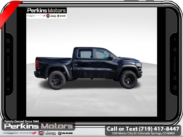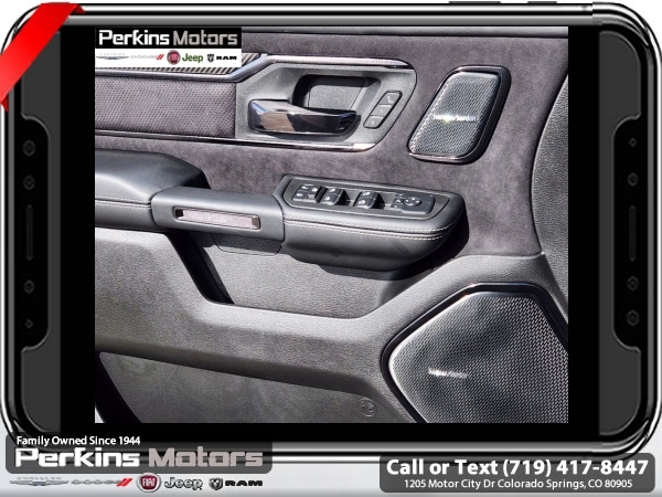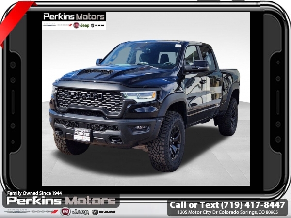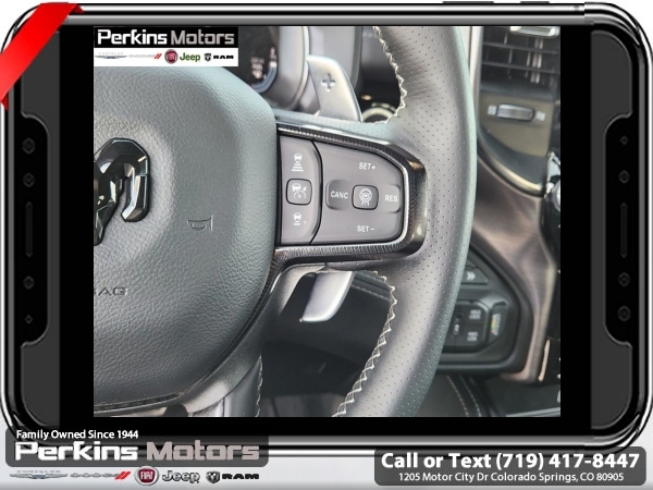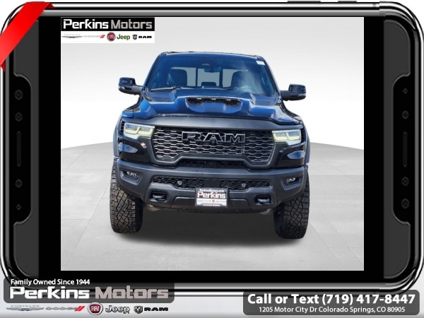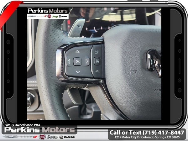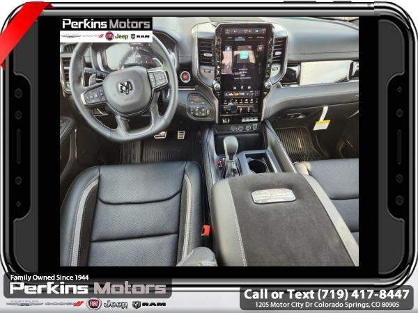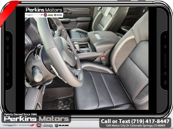 Factory MSRP: $82,230 Diamond Black Crystal Pearlcoat 2025 Ram 1500 RHO 4WD 8-Speed Automatic 3.0L I6<br><br>Check us out at www.perkinsmotors.com to see our specials! Since opening our doors in 1944, we’ve been proud to serve Colorado Springs, CO, and the surrounding areas of Pueblo, Castle Rock and Denver, CO. Throughout this time of being family owned for 80 years, we’ve maintained a firm commitment to our customers: to offer a wide selection of New Chrysler, Dodge, Fiat, Jeep, and Ram vehicles and quality pre-owned vehicles, and provide a quick, no-hassle car-buying process that ensures everyone drives off the lot satisfied with their purchase.<br><br>Quick Order Package 22Y RHO, RHO Level 1 Equipment Group (12-Way/1-Way Trailer Connector, 14.4 Touchscreen Display, 240 Amp Alternator, 4G LTE Wi-Fi Hot Spot, Apple CarPlay, Connected Travel & Traffic Services, Connectivity - US/Canada, Driver Power Seat Back Massage, Driver Seat Memory, Driver/Passenger Wrapped Assist Handles, Drowsy Driver Detection, Dual Wireless Charging Pad, Evasive Steer Assist, Exterior Mirrors w/Memory, Front Passenger Interactive Display, Front Passenger Power Seat Back Massage, Full Length Premium Upgraded Floor Console, Google Android Auto, GPS Navigation, Hands-Free Active Driving Assist System, harman/kardon 19 Speaker Premium Sound, HD Radio, Heads-Up Display, Heated Second Row Seats, Integrated Voice Command w/Bluetooth, Intersection Collision Assist System, Leather/Carbon Flat-Bottom Steering Wheel, LED CHMSL Lamp, Luxury Front Door Trim Panel, Power Adjustable Pedals w/Memory, Power Tailgate, Premium Wrapped I/P Bezel, Radio: Uconnect 5 Nav w/14.4 Display, Radio/Driver Seat/Mirrors/Pedals Memory, Rain Sensitive Windshield Wipers, Real Carbon Fiber Interior Accents, Rear 60/40 Folding Split Recline Seat, Smartphone As A Key Capable, Surround View Camera System, Traffic Sign Recognition, USB Host Flip, Ventilated Front Seats, and Ventilated Rear Seats), 10 Speakers, 3.92 Rear Axle Ratio, 4-Wheel Disc Brakes, ABS brakes, Adaptive suspension, Adjustable pedals, Air Conditioning, Alloy wheels, AM/FM radio: SiriusXM with 360L, Apple CarPlay/Android Auto, Auto High-beam Headlights, Auto Power-Folding Mirrors, Auto-dimming door mirrors, Auto-Dimming Exterior Driver Mirror, Auto-dimming Rear-View mirror, Automatic temperature control, Brake assist, Compass, Cruise Control, Delay-off headlights, Driver door bin, Driver vanity mirror, Dual front impact airbags, Dual front side impact airbags, Electronic Stability Control, Exterior Mirrors Courtesy Lamps, Exterior Mirrors w/Heating Element, Exterior Mirrors w/Supplemental Signals, Flareside Box, Front anti-roll bar, Front Bucket Seats, Front Center Armrest w/Storage, Front dual zone A/C, Front fog lights, Front License Plate Bracket, Front reading lights, Front wheel independent suspension, Fully automatic headlights, Garage door transmitter, Heated door mirrors, Heated front seats, Heated steering wheel, Illuminated entry, Leather Shift Knob, Leather steering wheel, Leather Trimmed Bucket Seats, Low tire pressure warning, Manufacturer's Statement of Origin, Navigation System, Occupant sensing airbag, Outside temperature display, Overhead airbag, Overhead console, Panic alarm, ParkView Rear Back-Up Camera, Passenger door bin, Passenger vanity mirror, Power door mirrors, Power driver seat, Power passenger seat, Power steering, Power windows, Radio data system, Radio: Uconnect 5 Nav w/12.0 Display, Rear reading lights, Rear seat center armrest, Rear step bumper, Rear window defroster, Remote keyless entry, Security system, Split folding rear seat, Sport steering wheel, Steering wheel mounted audio controls, Tachometer, Telescoping steering wheel, Tilt steering wheel, Traction control, Trip computer, Turn signal indicator mirrors, Variably intermittent wipers, Voltmeter, and Wheels: 18 x 9 Black Paint/Polish Aluminum.