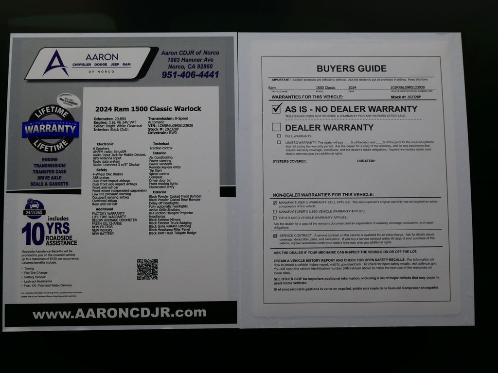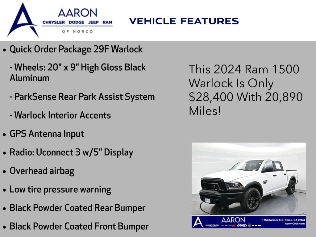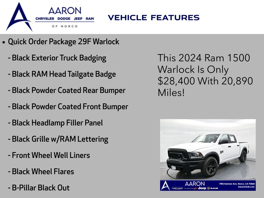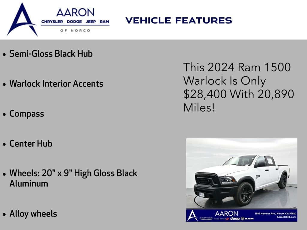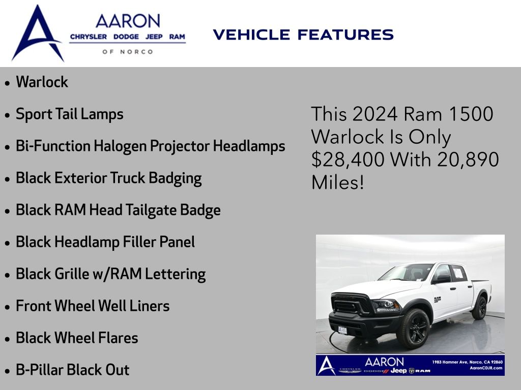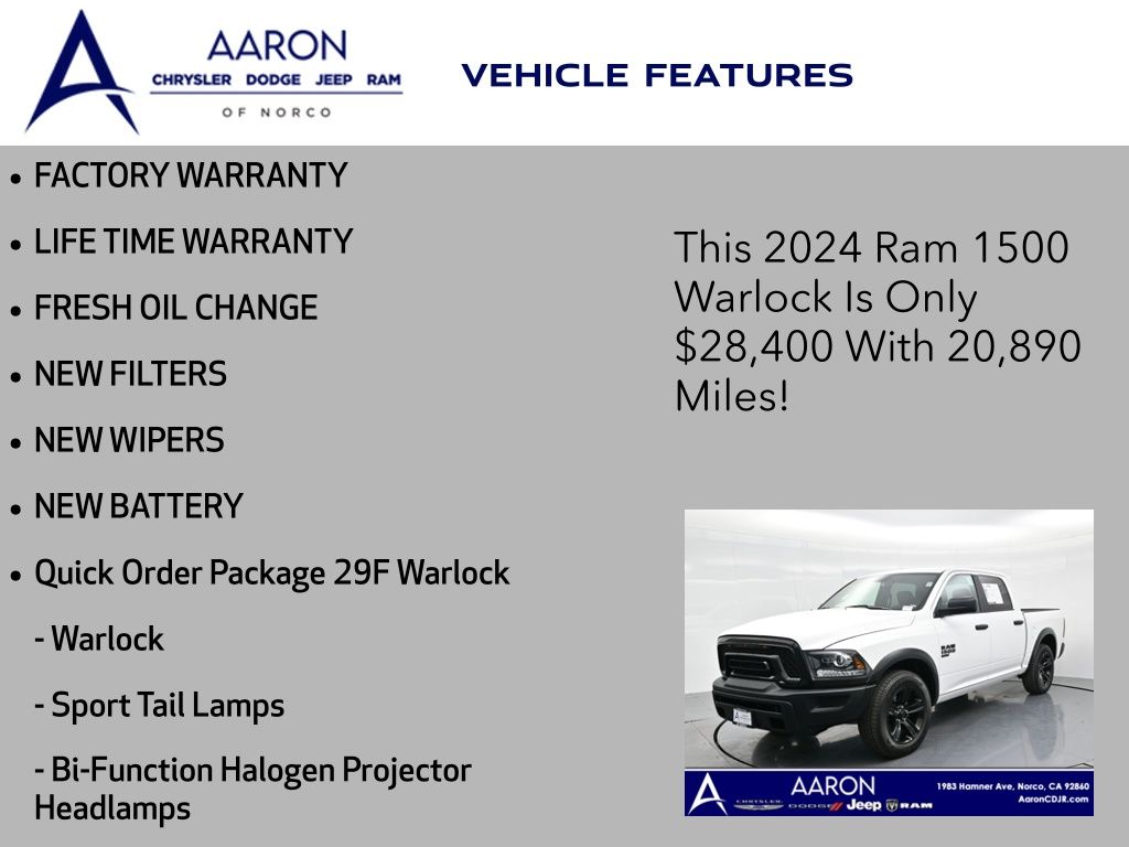 Priced below KBB Fair Purchase Price!FACTORY WARRANTY, LIFE TIME WARRANTY, FRESH OIL CHANGE, NEW FILTERS, NEW WIPERS, NEW BATTERY, 1500 Classic Warlock, 4D Crew Cab, 3.6L V6 24V VVT, 8-Speed Automatic, RWD, Alloy wheels, B-Pillar Black Out, Bi-Function Halogen Projector Headlamps, Black Exterior Truck Badging, Black Grille w/RAM Lettering, Black Headlamp Filler Panel, Black Powder Coated Front Bumper, Black Powder Coated Rear Bumper, Black RAM Head Tailgate Badge, Black Wheel Flares, Center Hub, Compass, Front Wheel Well Liners, GPS Antenna Input, Low tire pressure warning, Overhead airbag, ParkSense Rear Park Assist System, Quick Order Package 29F Warlock, Radio: Uconnect 3 w/5" Display, Semi-Gloss Black Hub, Sport Tail Lamps, Warlock, Warlock Interior Accents, Wheels: 20" x 9" High Gloss Black Aluminum.For help with any Vehicle needs please call us directly at 951-621-1288.Clean CARFAX.CARFAX One-Owner.