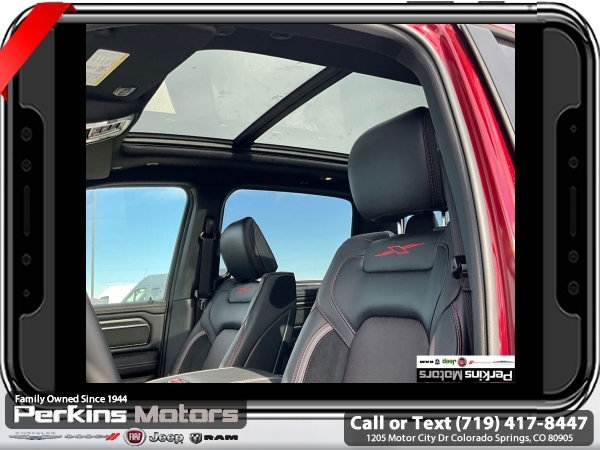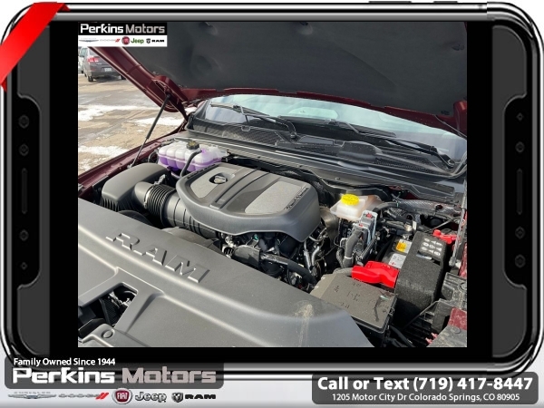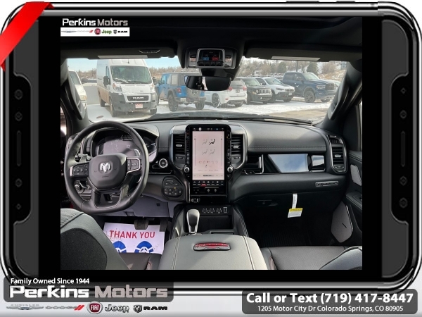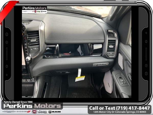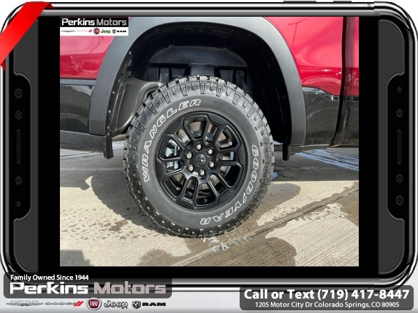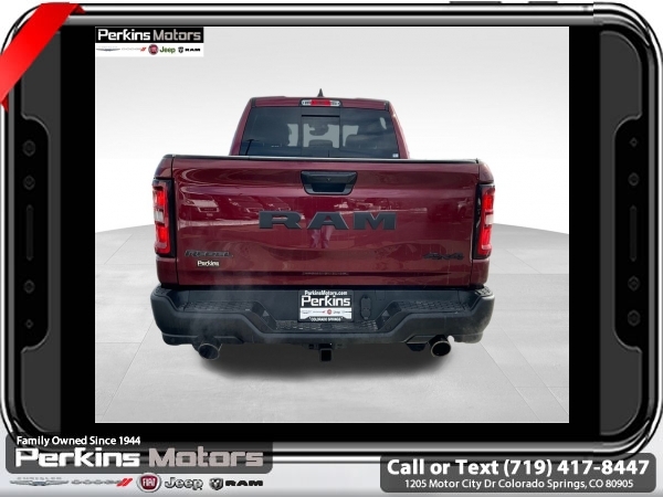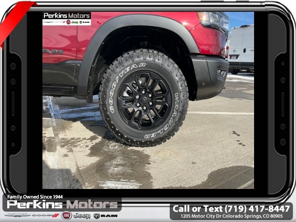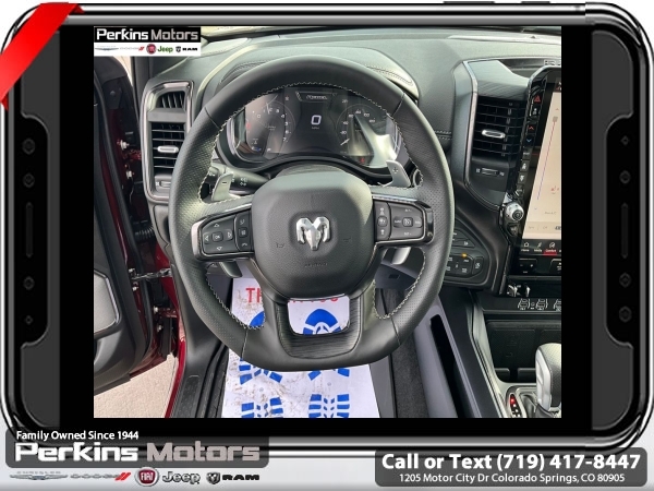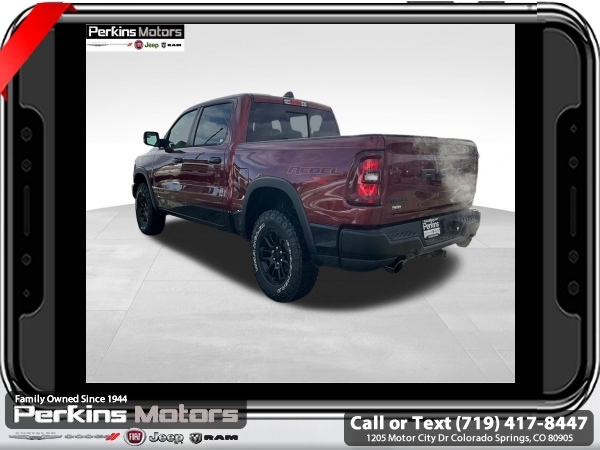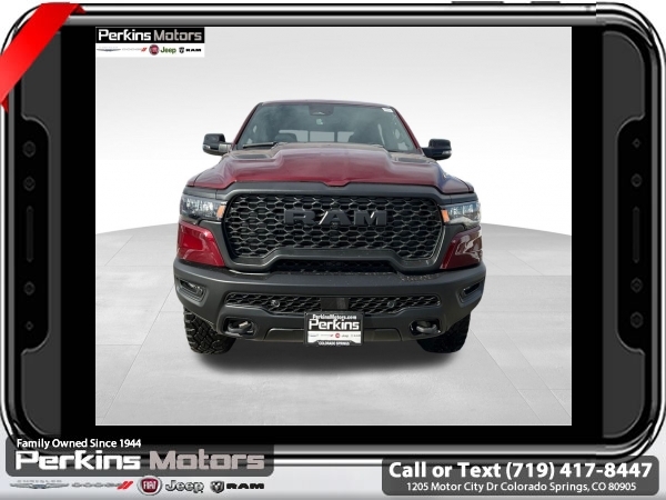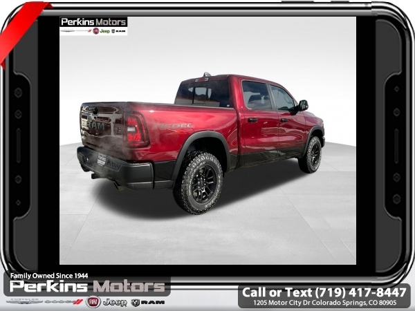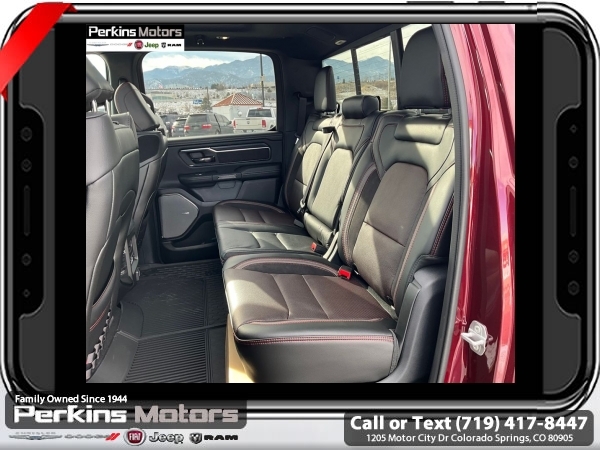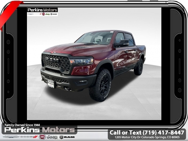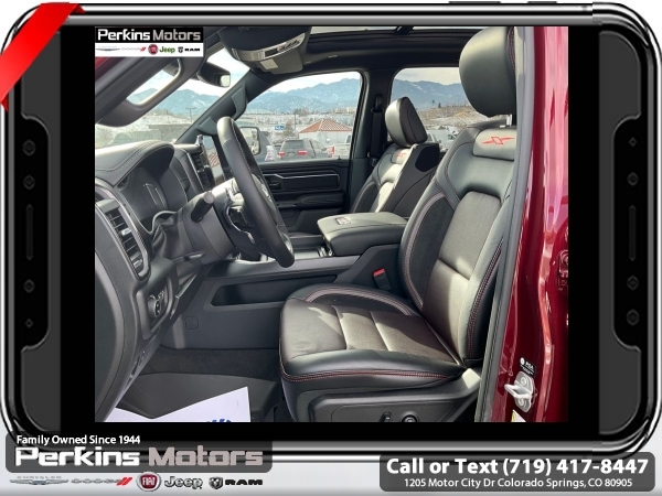 Factory MSRP: $73,660 $12,000 off MSRP! Priced below KBB Fair Purchase Price! Delmonico Red Pearlcoat 2025 Ram 1500 Rebel 4WD 8-Speed Automatic 3.0L I6<br><br>Check us out at www.perkinsmotors.com to see our specials! Since opening our doors in 1944, we’ve been proud to serve Colorado Springs, CO, and the surrounding areas of Pueblo, Castle Rock and Denver, CO. Throughout this time of being family owned for 80 years, we’ve maintained a firm commitment to our customers: to offer a wide selection of New Chrysler, Dodge, Fiat, Jeep, and Ram vehicles and quality pre-owned vehicles, and provide a quick, no-hassle car-buying process that ensures everyone drives off the lot satisfied with their purchase.<br><br>Quick Order Package 21W Rebel, Rebel Level 2 Equipment Group (115V Auxiliary Rear Power Outlet, 2-Door Passive Entry, Front Door Locks, 4G LTE Wi-Fi Hot Spot, Accent Color Door Handles, Accent Color Premium Power Mirrors, Accent Color Tailgate Handle, Apple CarPlay, Auto Power-Folding Mirrors, Auto-Dimming Exterior Driver Mirror, Black Painted Exterior Mirrors Caps, Connected Travel & Traffic Services, Connectivity - US/Canada, Convex Wide-Angle Exterior Mirror Insert, Driver Seat Memory, Dual Wireless Charging Pad, Exterior Mirrors Approach Lamps, Exterior Mirrors w/Heating Element, Exterior Mirrors w/Memory, Exterior Mirrors w/Supplemental Signals, Front Passenger Interactive Display, Google Android Auto, GPS Antenna Input, GPS Navigation, harman/kardon 19 Speaker Premium Sound, HD Radio, Heated Second Row Seats, Heated Steering Wheel, Integrated Voice Command w/Bluetooth, Media Hub w/2 Charge Only USBs, Power Adjust 8-Way Front Passenger Seat, Power Adjustable Pedals w/Memory, Power Tailgate, Proximity Approach/Departure Lamps, Radio: Uconnect 5 Nav w/14.4 Display, Radio/Driver Seat/Mirrors/Pedals Memory, Rain Sensitive Windshield Wipers, Rear Window Defroster, Security Alarm, SiriusXM w/360L, Smartphone As A Key Capable, and USB Host Flip), Rebel X (4 Way Front Headrests, Bucket Seats, Dome Dual LED Reading Lamp, Dual-Pane Panoramic Sunroof, Floor Console, Front Seat Back Map Pockets, GT Interior Theme, Heated Front Seats, Leather Wrapped Shift Knob, Leather-Wrapped Steering Wheel, Power 4-Way Driver Lumbar Adjust, Power 4-Way Passenger Lumbar Adjust, Power Adjust 8-Way Driver Seat, Premium Leather/Vinyl Bucket Seats, Rear 60/40 Folding Split Recline Seat, Rebel 10th Anniversary Side Graphics, Rough Road Cruise Control, Special Edition Console Badge, Steering Wheel Mounted Shift Control, and Ventilated Front Seats), 10 Speakers, 3.92 Rear Axle Ratio, 33 Gallon Fuel Tank, 4-Wheel Disc Brakes, ABS brakes, Air Conditioning, Alloy wheels, AM/FM radio: SiriusXM with 360L, Apple CarPlay/Android Auto, Auto High-beam Headlights, Auto-dimming Rear-View mirror, Automatic temperature control, Brake assist, Cloth/Vinyl Bucket Seats, Compass, Cruise Control, Delay-off headlights, Driver door bin, Driver vanity mirror, Dual front impact airbags, Dual front side impact airbags, Electronic Stability Control, Front anti-roll bar, Front Bucket Seats, Front Center Armrest w/Storage, Front dual zone A/C, Front fog lights, Front License Plate Bracket, Front reading lights, Front wheel independent suspension, Full Length Upgraded Floor Console, Fully automatic headlights, Garage door transmitter, Heated door mirrors, Heated front seats, Heated steering wheel, Illuminated entry, Leather steering wheel, Low tire pressure warning, Manual Folding Exterior Mirrors, Navigation System, Occupant sensing airbag, Outside temperature display, Overhead airbag, Overhead console, Panic alarm, ParkView Rear Back-Up Camera, Passenger door bin, Passenger vanity mirror, Power door mirrors, Power driver seat Sale price includes all manufacture's incentives and dealer discounts. Sale price not available on lease or compatible with special APR. $1000 - 2025 National Truck Month Bonus Cash . Exp. 03/31/2025 $4000 - 2025 National Retail Consumer Cash. Exp. 0