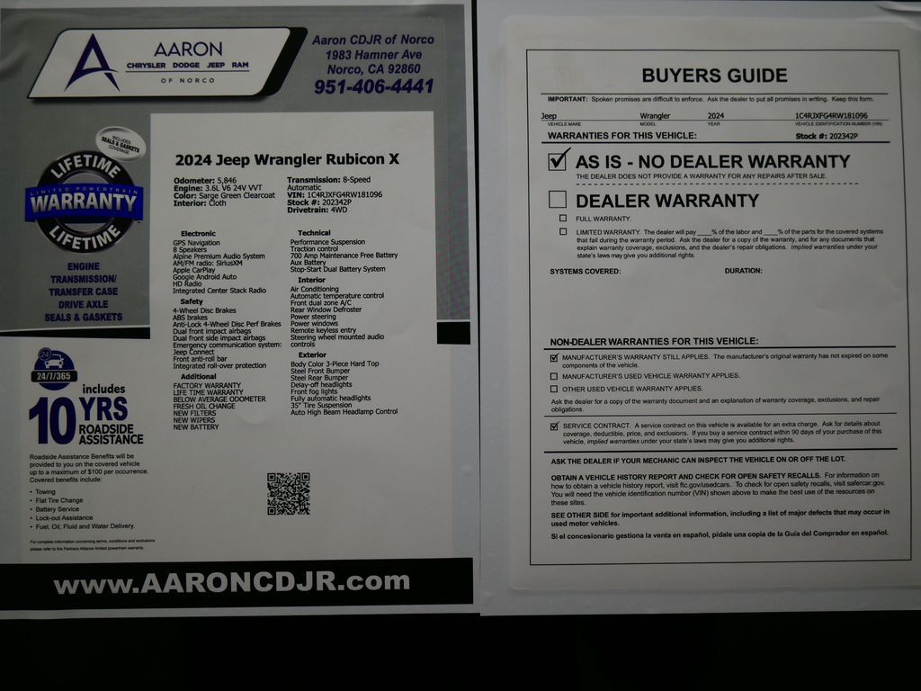 Priced below KBB Fair Purchase Price!FACTORY WARRANTY, LIFE TIME WARRANTY, BELOW AVERAGE ODOMETER, FRESH OIL CHANGE, NEW FILTERS, NEW WIPERS, NEW BATTERY, Wrangler Rubicon X, 4D Sport Utility, 3.6L V6 24V VVT, 8-Speed Automatic, 4WD, 12.3" Touchscreen Display, 35" Tire Suspension, 4.56 Rear Axle Ratio, 4G LTE Wi-Fi Hot Spot, 7 & 4 Pin Wiring Harness, 700 Amp Maintenance Free Battery, 97 MPH Vehicle Max Speed Calibration, Acoustic Front Seat Area Carpet, Acoustic Laminated Front Door Glass, Adaptive Cruise Control w/Stop, Alpine Premium Audio System, Anti-Lock 4-Wheel Disc Perf Brakes, Apple CarPlay, Auto High Beam Headlamp Control, Auto-Dimming Rear-View Mirror, Black 3-Piece Hard Top, Blind Spot & Cross Path Detection, Body Color 3-Piece Hard Top, Body Color Rubicon Highline Flare, Compass, Connected Travel & Traffic Services, Connectivity - US/Canada, Disassociated Touchscreen Display, Dual Top Group, Freedom Panel Storage Bag, Front fog lights, Google Android Auto, GPS Navigation, HD Radio, Heated Front Seats, Heated Steering Wheel, Integrated Center Stack Radio, Integrated Off-Road Camera, Integrated Voice Command w/Bluetooth, Leather Wrapped Park Brake Handle, Leather Wrapped Shift Knob, MOPAR Hardtop Headliner, MOPAR Hinge-Gate Reinforcement, Nappa Leather Seats, No Soft Top, ParkSense Rear Park Assist System, ParkView Rear Back-Up Camera, Power 4-Way Driver Lumbar Adjust, Power 4-Way Passenger Lumbar Adjust, Power Adjust 8-Way Driver Seat, Power Adjust 8-Way Front Passenger Seat, Premium Black Sunrider Soft Top w/Dual Top Group, Premium Door Trim Panel, Quick Order Package 24Y Rubicon X, Radio: Uconnect 5 Nav w/12.3" Display, Rear Window Defroster, Rear Window Wiper/Washer, SiriusXM Radio Service, SiriusXM w/360L, Steel Front Bumper, Steel Rear Bumper, Trailer Tow Prep Package, Universal Garage Door Opener, Wheel Flare Extensions, Wheels: 17" x 8" Machined w/Black Pockets, Xtreme 35" Tire Package.For help with any Vehicle needs please call us directly at 951-621-1288.Clean CARFAX.