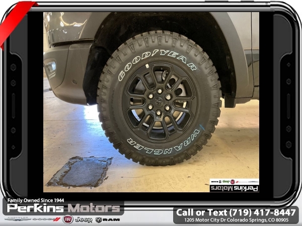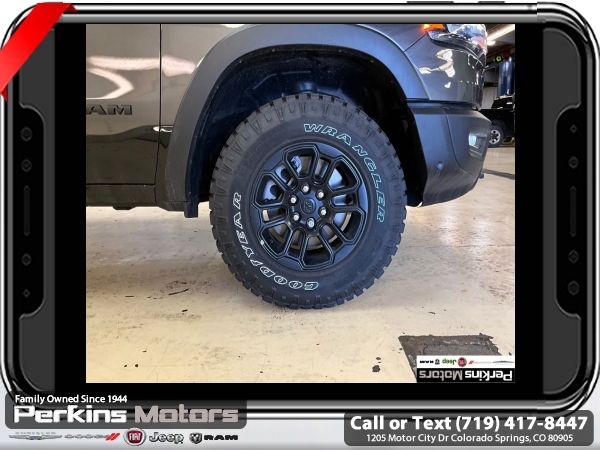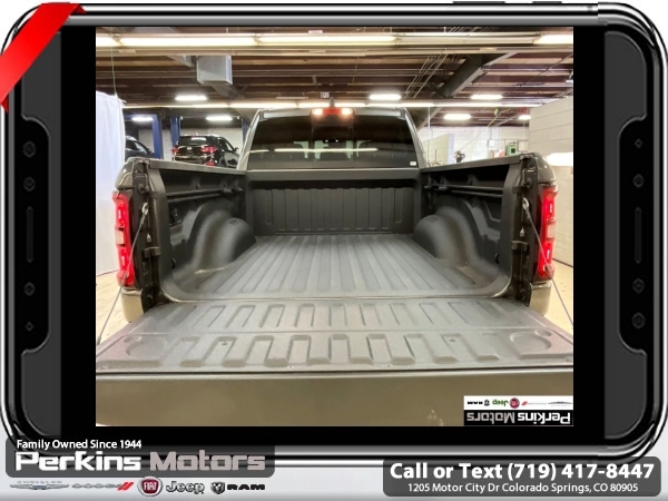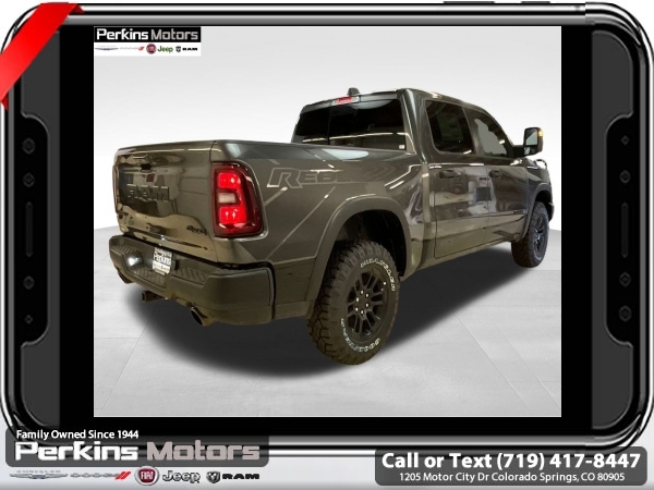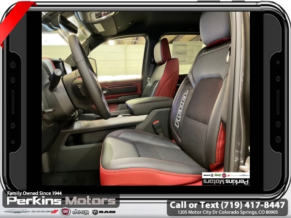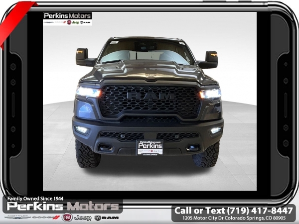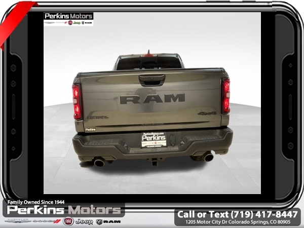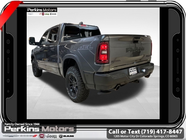 Factory MSRP: $70,355 $10,176 off MSRP! Priced below KBB Fair Purchase Price! Granite Crystal Metallic Clearcoat 2025 Ram 1500 Rebel 4WD 8-Speed Automatic 3.0L I6<br><br>Check us out at www.perkinsmotors.com to see our specials! Since opening our doors in 1944, we’ve been proud to serve Colorado Springs, CO, and the surrounding areas of Pueblo, Castle Rock and Denver, CO. Throughout this time of being family owned for 80 years, we’ve maintained a firm commitment to our customers: to offer a wide selection of New Chrysler, Dodge, Fiat, Jeep, and Ram vehicles and quality pre-owned vehicles, and provide a quick, no-hassle car-buying process that ensures everyone drives off the lot satisfied with their purchase.<br><br>Bed Utility Group (Exterior 115V AC Outlet, MOPAR 4 Adjustable Cargo Tie-Down Hooks, and MOPAR Spray In Bedliner), Quick Order Package 21W Rebel, Rebel Level 1 Equipment Group (Auto Power-Folding Mirrors, Auto-Dimming Exterior Driver Mirror, Black Premium Power Mirrors, Convex Wide-Angle Exterior Mirror Insert, Exterior Mirrors Courtesy Lamps, Exterior Mirrors w/Heating Element, Exterior Mirrors w/Supplemental Signals, Power Adjustable Pedals, Rear Window Defroster, Remote Tailgate Release, and Wireless Charging Pad), Towing Technology Group (Trailer Hitch Line-Up Assist), Trailer Tow Group (Accent Color Tailgate Handle, Auto-Dimming Exterior Passenger Mirror, Exterior Mirrors w/Memory, Forward & Reverse Utility Lights, Manual Folding Exterior Mirrors, Manual Telescoping Mirrors, Mirror Clearance/Running Lights, Power Telescoping Mirrors, Power-Adjustable Convex Aux Mirrors, Trailer Brake Control, Trailer Light Check, Trailer Reverse Steering Control, Trailer Tire Pressure Monitoring System, and Trailer Tow Mirrors), 10 Speakers, 3.92 Rear Axle Ratio, 33 Gallon Fuel Tank, 4 Way Front Headrests, 4-Wheel Disc Brakes, 4G LTE Wi-Fi Hot Spot, ABS brakes, Air Conditioning, Alloy wheels, AM/FM radio: SiriusXM with 360L, Apple CarPlay, Apple CarPlay/Android Auto, Auto High-beam Headlights, Auto-dimming Rear-View mirror, Automatic temperature control, Brake assist, Bucket Seats, Cloth/Vinyl Bucket Seats, Compass, Connected Travel & Traffic Services, Connectivity - US/Canada, Cruise Control, Delay-off headlights, Driver door bin, Driver vanity mirror, Dual front impact airbags, Dual front side impact airbags, Electronic Stability Control, Engine Block Heater, Front anti-roll bar, Front Bucket Seats, Front Center Armrest w/Storage, Front dual zone A/C, Front fog lights, Front License Plate Bracket, Front reading lights, Front Seat Back Map Pockets, Front wheel independent suspension, Full Length Upgraded Floor Console, Fully automatic headlights, Garage door transmitter, Google Android Auto, GPS Antenna Input, GPS Navigation, Heated door mirrors, Heated front seats, Heated steering wheel, Illuminated entry, Integrated Voice Command w/Bluetooth, Leather steering wheel, Low tire pressure warning, Navigation System, Occupant sensing airbag, Outside temperature display, Overhead airbag, Overhead console, Panic alarm, ParkView Rear Back-Up Camera, Passenger door bin, Passenger vanity mirror, Power Adjust 8-Way Driver Seat, Power door mirrors, Power driver seat, Power steering, Power windows, Radio data system, Radio: Uconnect 5 Nav w/12.0 Display, Rear 60/40 Folding Seat, Rear anti-roll bar, Rear seat center armrest, Rear step bumper, Remote keyless entry, SiriusXM w/360L, Split folding rear seat, Steering wheel mounted audio controls, Tachometer, Telescoping steering wheel, Tilt steering wheel, Traction control, Trip computer, USB Host Flip, Variably intermittent wipers, Voltmeter, and Wheels: 18 x 8.0 Painted Mid-Gloss Black. Sale price includes all manufacture's incentives and dealer discounts. Sale price not available on lease or compatible with special APR. $2000 - 2025 National Retail Consumer Cash. Exp. 06/30/2025 $6176 - 2025 National Minimum Employee Pricing Discount. Exp. 06/30/2025