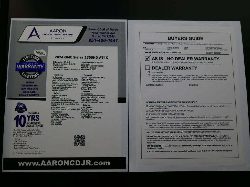 Priced below KBB Fair Purchase Price!FACTORY WARRANTY, LIFE TIME WARRANTY, BELOW AVERAGE ODOMETER, FRESH OIL CHANGE, NEW FILTERS, NEW WIPERS, NEW BATTERY, Sierra 2500HD AT4X, 4D Crew Cab, Duramax 6.6L V8 Turbodiesel, 10-Speed Automatic, 4WD, Obsidian Rush Leather, 120-Volt Bed Mounted Power Outlet, 120-Volt Instrument Panel Power Outlet, 2 Charge-Only Rear USB Ports, 2 Charge/Data USB Ports Inside Center Console, 2 USB Ports, 2-Speed Active Transfer Case, Alloy wheels, Apple CarPlay/Android Auto, Bed View Camera w/2 Trailer Camera Provisions, Bose Premium Series 12-Speaker System, Compass, Deep-Tinted Glass, Electric Rear-Window Defogger, Floor-Mounted Center Console, Forward Collision Alert, Front dual zone A/C, Front fog lights, Front Prem Floor Liners w/Removable Carpet Insert, Front Rain-Sensing Wipers, Gloss Black Header Grille & Grille Insert Bars, GMC Connected Access Capable, Gooseneck/5th Wheel Prep Package, HD Surround Vision, Heads-Up Display, Heated 2nd Row Outboard Seats, Heated Driver & Front Outboard Passenger Seats, Hill Descent Control, Inside Rearview Auto-Dimming Rear Camera Mirror, Integrated Trailer Brake Controller, Keyless Open & Start, Lane Departure Warning System, LED Cargo Area Lighting, LED Smoked Amber Roof Marker Lamps, Low tire pressure warning, Manual Tilt-Wheel/Telescoping Steering Column, Memory seat, Multicolor 15" Diagonal Head-Up Display, OnStar & GMC Connected Services Capable, Overhead airbag, Pickup Box, Power Front Passenger Windows w/Express Up/Down, Power moonroof, Power Sliding Rear Window w/Defogger, Power Sunroof, Preferred Equipment Group 4SG, Push Button Start, Rear Cross Traffic Alert, Rear Prem Floor Liners w/Removable Carpet Insert, Rear Wheelhouse Liners, Remote keyless entry, Remote Vehicle Starter System, Safety Alert Seat, SiriusXM w/360L, Spray-On Bedliner w/AT4 Logo, Steering Wheel Audio Controls, Trailer Cam Provisions & Trailer Viewing Software, Trailer Side Blind Zone Alert, Trailer Tire Pressure Monitor Sensors, Ultrasonic Front & Rear Park Assist, Unauthorized Entry Theft-Deterrent System, Universal Home Remote, Ventilated Driver & Front Passenger Seats, Wheels: 18" Machined Alum w/High Gloss Blk Accents, Wireless Charging, Wireless Phone Projection.For help with any Vehicle needs please call us directly at 951-621-1288.Clean CARFAX.CARFAX One-Owner.