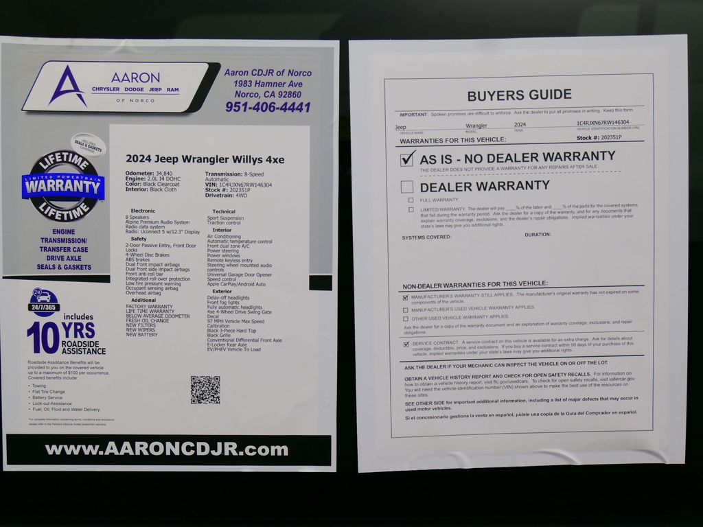 Priced below KBB Fair Purchase Price!FACTORY WARRANTY, LIFE TIME WARRANTY, FRESH OIL CHANGE, NEW FILTERS, NEW WIPERS, NEW BATTERY, Wrangler Willys 4xe, 4D Sport Utility, 2.0L I4 DOHC, 8-Speed Automatic, 4WD, 2-Door Passive Entry, Front Door Locks, 4.10 Rear Axle Ratio, 4xe 4-Wheel Drive Swing Gate Decal, 7 & 4 Pin Wiring Harness, 97 MPH Vehicle Max Speed Calibration, Alloy wheels, Alpine Premium Audio System, Auxiliary Switches, Black Grille, Convenience Group, Conventional Differential Front Axle, E-Locker Rear Axle, Emergency/Assistance Call, EV/PHEV Vehicle To Load, Front dual zone A/C, Front fog lights, Front LED Fog Lamps, Heated Front Seats, Heated Steering Wheel, LED Premium Reflector Headlamps, Low tire pressure warning, Molded in Color Rubicon Highline Flare, MOPAR All-Weather Floor Mats, Off-Road Plus Mode, Overhead airbag, ParkView Rear Back-Up Camera, Quick Order Package 29W Willys, Radio: Uconnect 5 w/12.3" Display, Remote Start System, Technology Group, Universal Garage Door Opener, Wheels: 17" x 7.5" Painted Black, Willy's Suspension, Willys, Willys 4xe Hood Decal.For help with any Vehicle needs please call us directly at 951-621-1288.Clean CARFAX.CARFAX One-Owner.