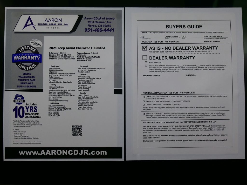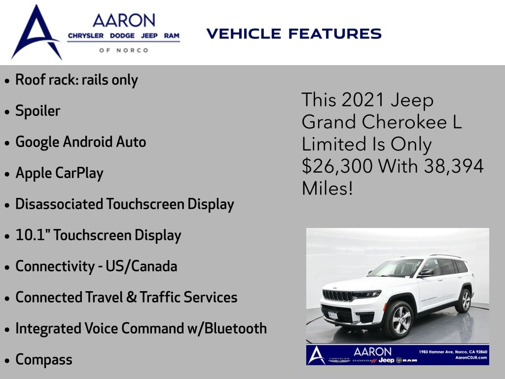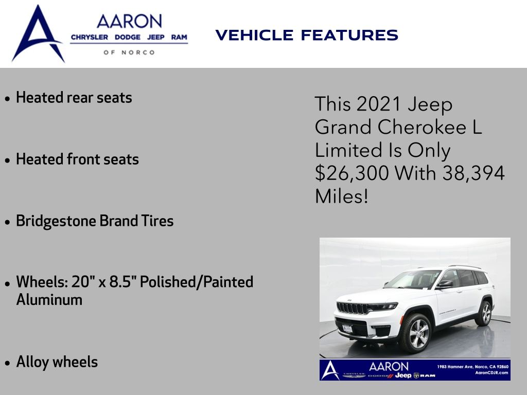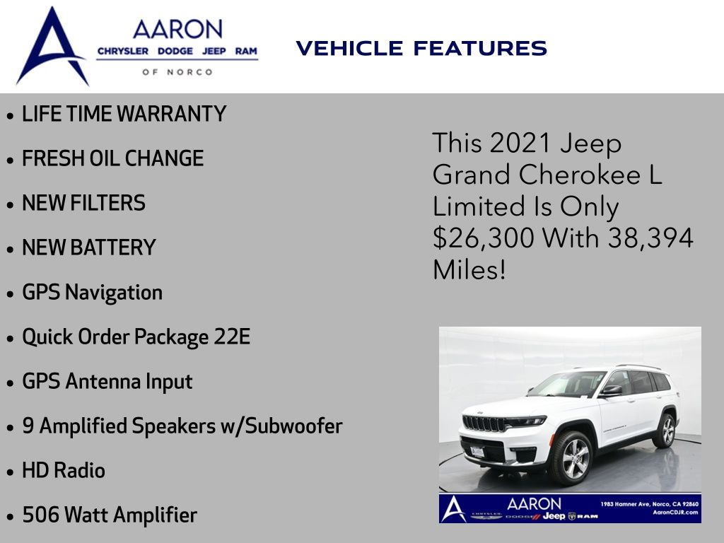 Priced below KBB Fair Purchase Price!LIFE TIME WARRANTY, FRESH OIL CHANGE, NEW FILTERS, NEW BATTERY, Grand Cherokee L Limited, 4D Sport Utility, 3.6L V6 24V VVT, 8-Speed Automatic, RWD, 10.1" Touchscreen Display, 506 Watt Amplifier, 9 Amplified Speakers w/Subwoofer, Alloy wheels, Apple CarPlay, Bridgestone Brand Tires, Compass, Connected Travel & Traffic Services, Connectivity - US/Canada, Disassociated Touchscreen Display, Front dual zone A/C, Google Android Auto, GPS Antenna Input, GPS Navigation, HD Radio, Heated front seats, Heated rear seats, Integrated Center Stack Radio, Integrated Voice Command w/Bluetooth, Knee airbag, Low tire pressure warning, Memory seat, Power Liftgate, Quick Order Package 22E, Radio: Uconnect 5 Nav w/10.1" Display, Roof rack: rails only, SiriusXM Satellite Radio, SiriusXM w/360L, Spoiler, USB Host Flip, Wheels: 20" x 8.5" Polished/Painted Aluminum.For help with any Vehicle needs please call us directly at 951-621-1288.Clean CARFAX.CARFAX One-Owner.