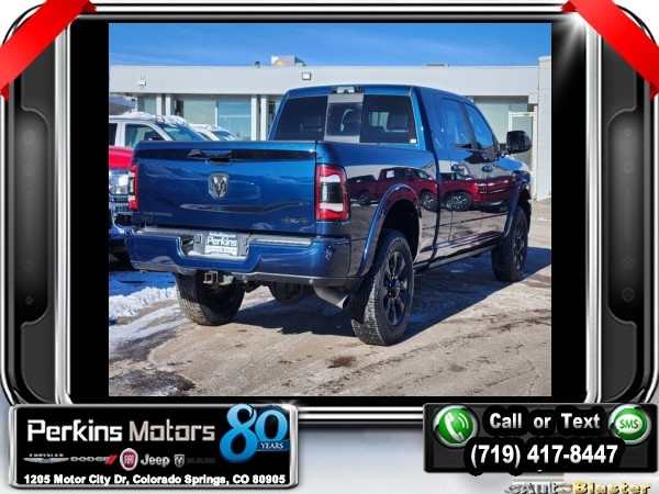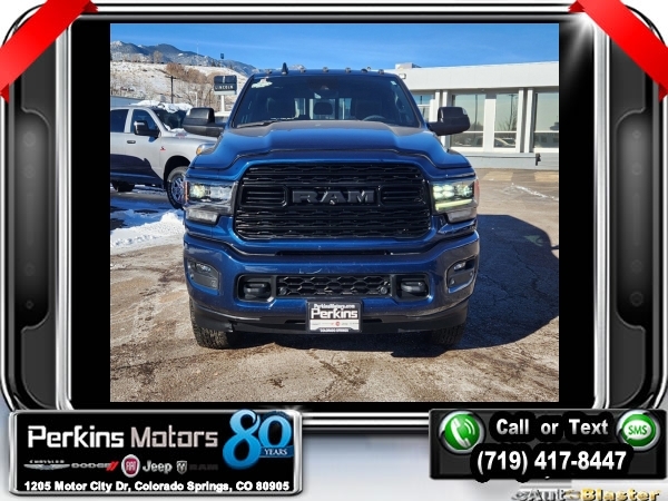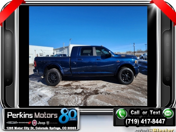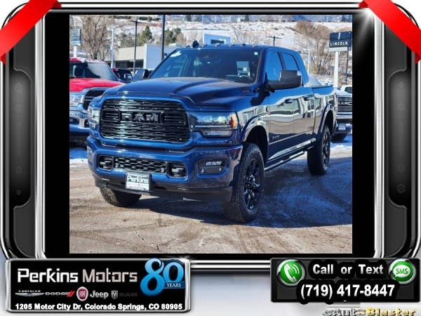 Patriot Blue Pearlcoat 4WD 6.7L I6 Aisin 6-Speed Automatic<br><br>12 Touchscreen Display, 17 Speaker harman kardon Premium Sound, 3.73 Axle Ratio, 4G LTE Wi-Fi Hot Spot, 5th Wheel/Gooseneck Towing Prep Group, Adaptive Cruise Control w/Stop, Adaptive Steering System, Apple CarPlay, Black Exterior Mirrors, Black Exterior Truck Badging, Black Grille Limited, Black Headlamp Bezels, Black Ram Head Tailgate Badge, Black Tail Lamp Bezels, Black Wheel Center Hub, Body Color Door Handles, Body Color Grille Surround, Clearance Lamps, Connected Travel & Traffic Services, Connectivity - US/Canada, CTR Stop Lamp w/Cargo View Camera, Dash Pass Thru Wire Circuits, Digital Rearview Mirror, Disassociated Touchscreen Display, Exterior Mirrors Courtesy Lamps, Exterior Mirrors w/Heating Element, Exterior Mirrors w/Memory, Exterior Mirrors w/Supplemental Signals, Full Speed Forward Collision Warning Plus, Global Telematics Box Module (TBM), Google Android Auto, GPS Antenna Input, GPS Navigation, HD Radio, I/P Mounted Auxiliary Switches, Integrated Voice Command w/Bluetooth, Lane Keep Assist, Limited Level 1 Equipment Group, Mirror Running Lights, Mirror-Mounted Aux Reverse Lamps, Navigation System, Night Edition, Off-Road Information Pages, Painted Front Bumper, Painted Rear Bumper, Pickup Box, Power Adjustable Convex Aux Mirrors, Power Black Tow Mirrors w/Convex Spotter & Memory, Power Sunroof, Power-Folding Mirrors, Quick Order Package 21M Limited, Radio: Uconnect 5 Nav w/12.0 Display, Selectable Tire Fill Alert, SiriusXM w/360L, Snow Chief Group, Surround View Camera System, Tow Hooks, Trailer Reverse Guidance, Trailer Tow Mirrors, Vendor Painted Cargo Box, Vendor Painted Cargo Box Tracking.<br><br><br>CARFAX One-Owner.<br><br>Check us out at www.perkinsmotors.com to see our specials! Since opening our doors in 1944, we’ve been proud to serve Colorado Springs, CO, and the surrounding areas of Pueblo, Castle Rock and Denver, CO. Throughout this time of being family owned for 80 years, we’ve maintained a firm commitment to our customers: to offer a wide selection of New Chrysler, Dodge, Fiat, Jeep, and Ram vehicles and quality pre-owned vehicles, and provide a quick, no-hassle car-buying process that ensures everyone drives off the lot satisfied with their purchase.<br><br><br>5th Wheel/Gooseneck Towing Prep Group (Pickup Box, Vendor Painted Cargo Box, and Vendor Painted Cargo Box Tracking), Limited Level 1 Equipment Group (17 Speaker harman kardon Premium Sound, Adaptive Cruise Control w/Stop, Adaptive Steering System, CTR Stop Lamp w/Cargo View Camera, Digital Rearview Mirror, Full Speed Forward Collision Warning Plus, Lane Keep Assist, Surround View Camera System, and Trailer Reverse Guidance), Night Edition (Black Exterior Mirrors, Black Exterior Truck Badging, Black Grille Limited, Black Headlamp Bezels, Black Ram Head Tailgate Badge, Black Tail Lamp Bezels, Black Wheel Center Hub, Body Color Door Handles, Body Color Grille Surround, Exterior Mirrors Courtesy Lamps, Exterior Mirrors w/Heating Element, Exterior Mirrors w/Memory, Exterior Mirrors w/Supplemental Signals, Mirror Running Lights, Mirror-Mounted Aux Reverse Lamps, Painted Front Bumper, Painted Rear Bumper, Power Adjustable Convex Aux Mirrors, Power Black Tow Mirrors w/Convex Spotter & Memory, Power-Folding Mirrors, Tow Hooks, and Trailer Tow Mirrors), Quick Order Package 21M Limited, Snow Chief Group (Clearance Lamps, Dash Pass Thru Wire Circuits, and I/P Mounted Auxiliary Switches), 12 Touchscreen Display, 3.73 Axle Ratio, 4G LTE Wi-Fi Hot Spot, Apple CarPlay, Connected Travel & Traffic Services, Connectivity - US/Canada, Disassociated Touchscreen Display, Global Telematics Box Module (TBM), Google Android Auto, GPS Antenna Input, GPS Navigation, HD Radio, Integrated Voice Command w/Bluetooth, Navigation System, Off-Road Information Pages, Power Sunroof, Radio: Uconnect 5 Nav w/12.0 Display, Selectable Tire Fill Alert, SiriusXM w/360L, 10 Speakers, 220 Amp Alternator, 4-Wh