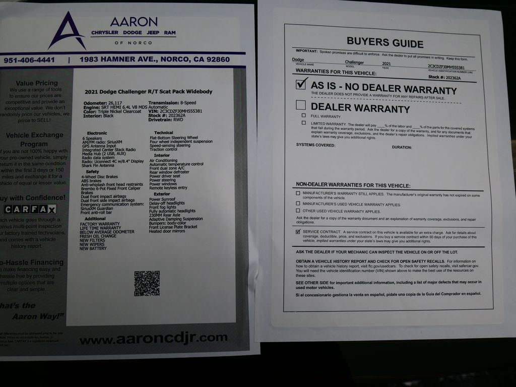 Priced below KBB Fair Purchase Price!BELOW AVERAGE ODOMETER, FRESH OIL CHANGE, NEW FILTERS, NEW WIPERS, Challenger R/T Scat Pack Widebody, 2D Coupe, SRT HEMI 6.4L V8 MDS, 8-Speed Automatic, RWD, 3.09 Rear Axle Ratio, Adaptive Damping Suspension, Alloy wheels, Apple CarPlay/Android Auto, Brembo 6-Pot Fixed Front Caliper Brakes, Compass, Flat-Bottom Steering Wheel, Front dual zone A/C, Front fog lights, Google Android Auto, GPS Antenna Input, Low tire pressure warning, Overhead airbag, ParkView Rear Back-Up Camera, Performance Shift Indicator, Power Sunroof, Quick Order Package 24N R/T Scat Pack Widebody, Radio: Uconnect 4C w/8.4" Display, Wheels: 20" x 11.0" Devil's Rim Aluminum, Widebody Competition Suspension, Widebody Fender Flares.For help with any Vehicle needs please call us directly at 951-621-1288.Clean CARFAX.