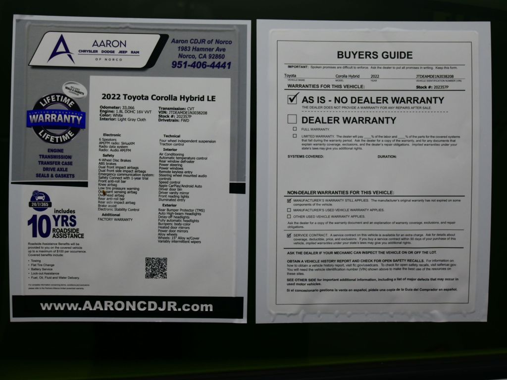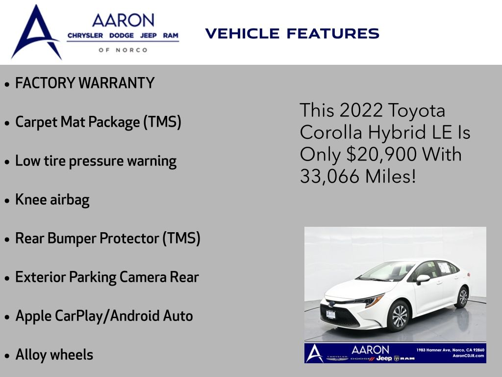 Priced below KBB Fair Purchase Price!FACTORY WARRANTY, Corolla Hybrid LE, 4D Sedan, 1.8L DOHC 16V VVT, FWD, Alloy wheels, Apple CarPlay/Android Auto, Carpet Mat Package (TMS), Exterior Parking Camera Rear, Knee airbag, Low tire pressure warning, Rear Bumper Protector (TMS).For help with any Vehicle needs please call us directly at 951-621-1288.Clean CARFAX.CARFAX One-Owner.